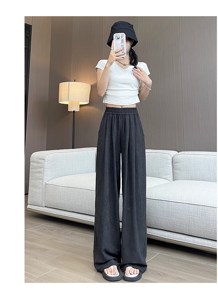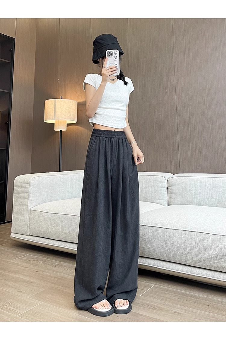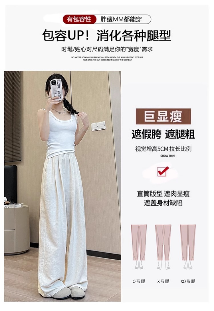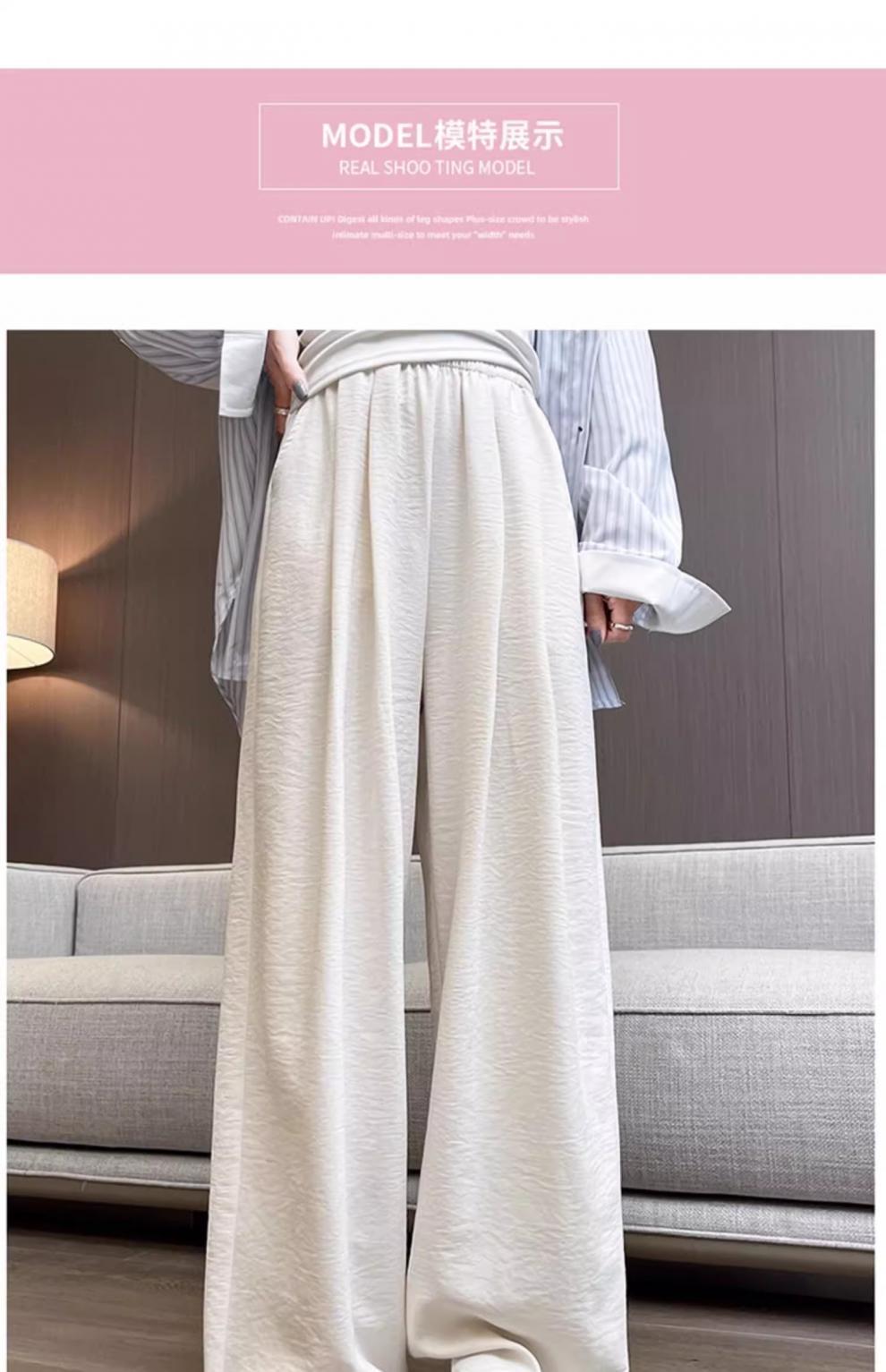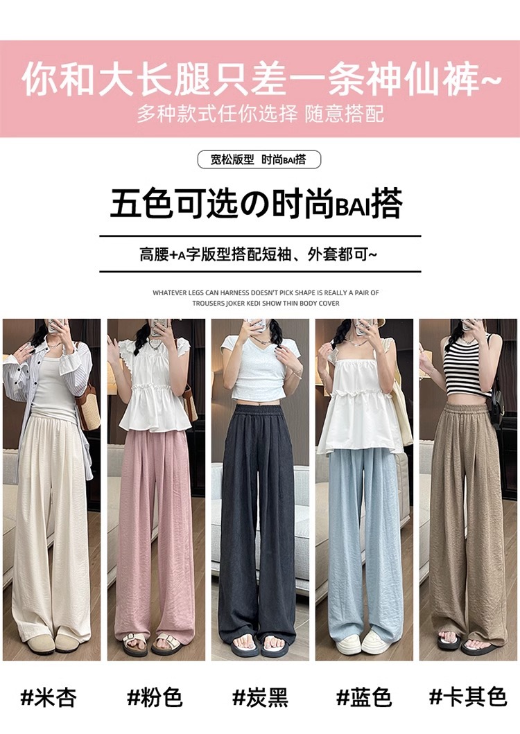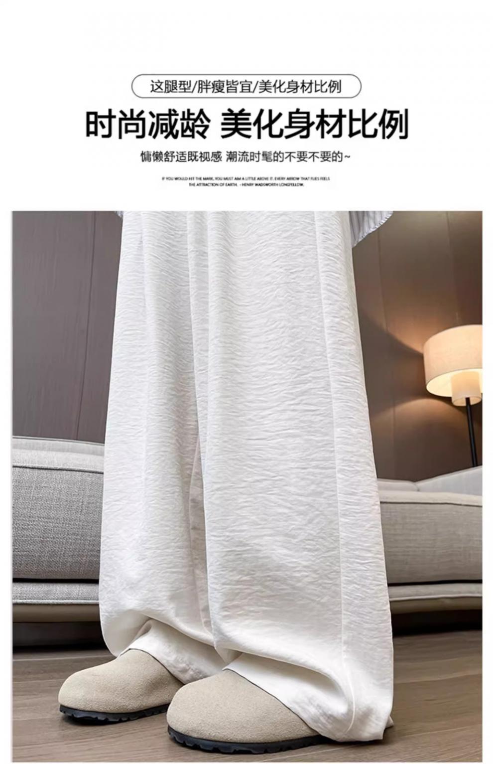 商品属性 [上市年份/季节] 2025夏季 [主要下游销售地区1] 中东 [主要下游销售地区2] 其他 [主面料成分] 其它 [主面料成分2] 其它 [主面料成分2含量] 95%及以上 [主面料成分含量] 95%及以上 [厚薄] 超薄 [工艺] 压花 [弹力] 无弹 [是否跨境货源] 是 [款式] 阔腿 [流行元素] 垂感 [腰型] 高腰 [裤型] 垂感裤 [裤长] 长裤 [跨境风格类型] 舒适休闲 [面料名称] 冰丝 [风格] 都市风 [风格类型] 气质通勤