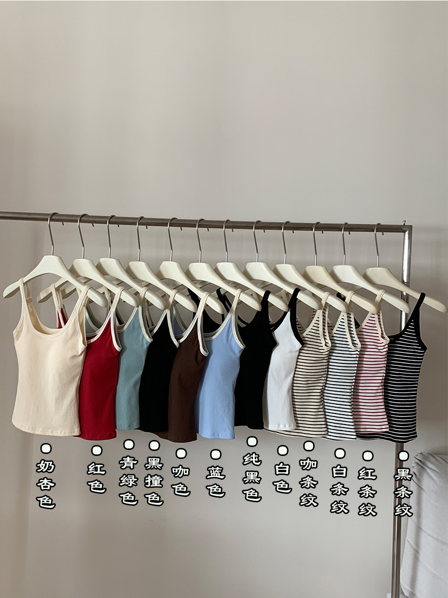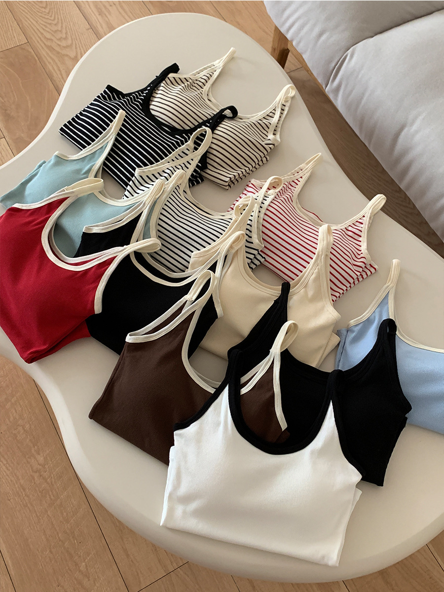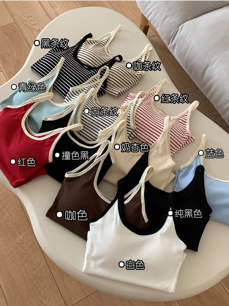 商品属性 [上市年份/季节] 2024年夏季 [主面料成分] 棉 [主面料成分2] 氨纶 [主面料成分2含量] 30%以下 [主面料成分含量] 90%(含)-95%(不含) [图案] 条纹 [弹力] 中弹 [是否跨境货源] 否 [款式] 吊带款 [流行元素] 撞色 [版型] 修身型 [肩带样式] 不可拆卸 [衣长] 短款(40cm<衣长≤50cm) [面料名称] 螺纹棉 [风格] 简约风 [风格类型] 日韩休闲