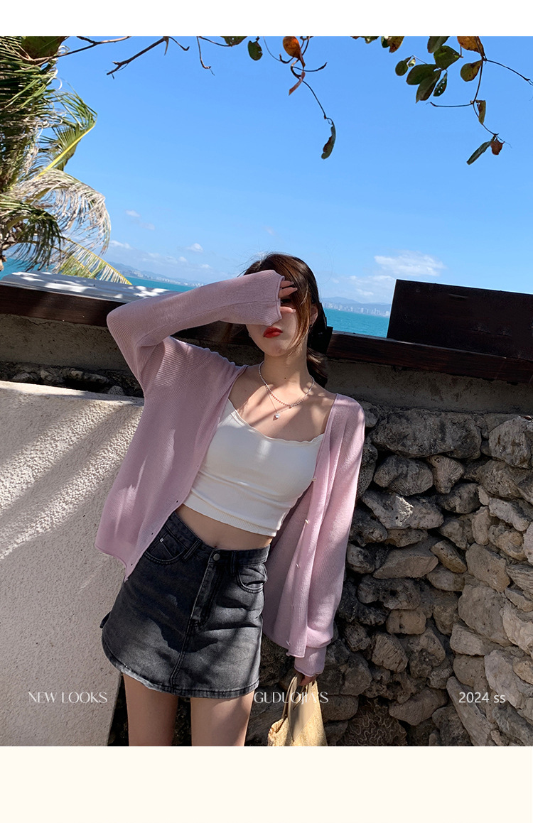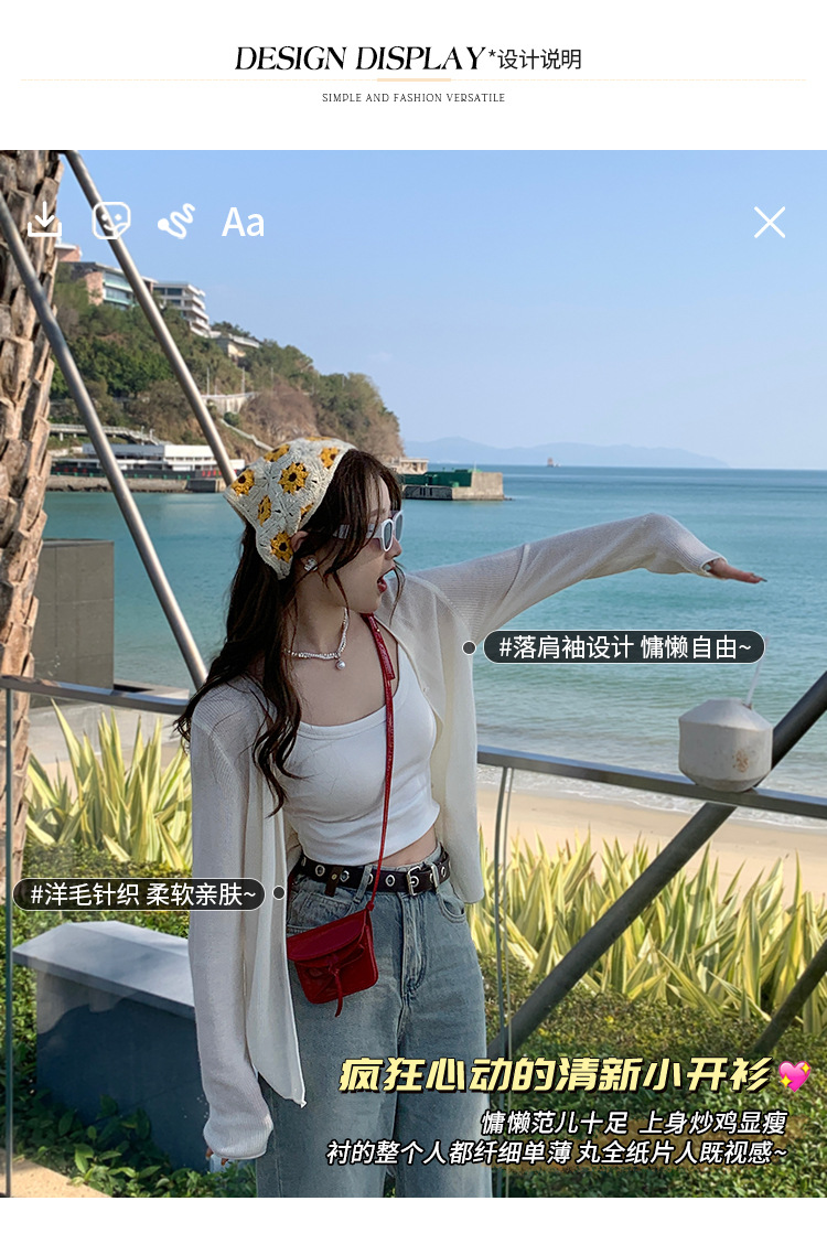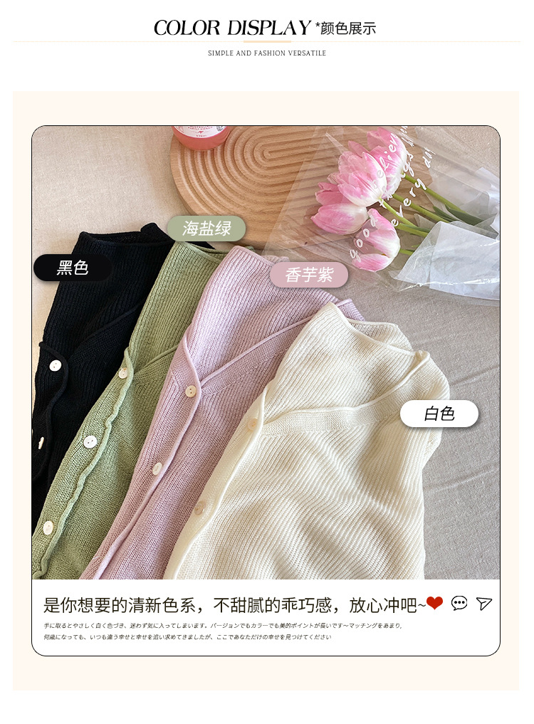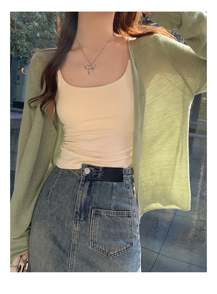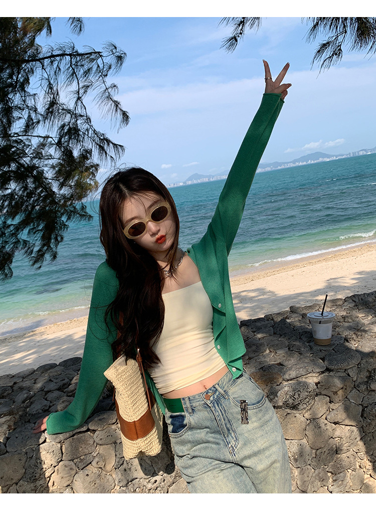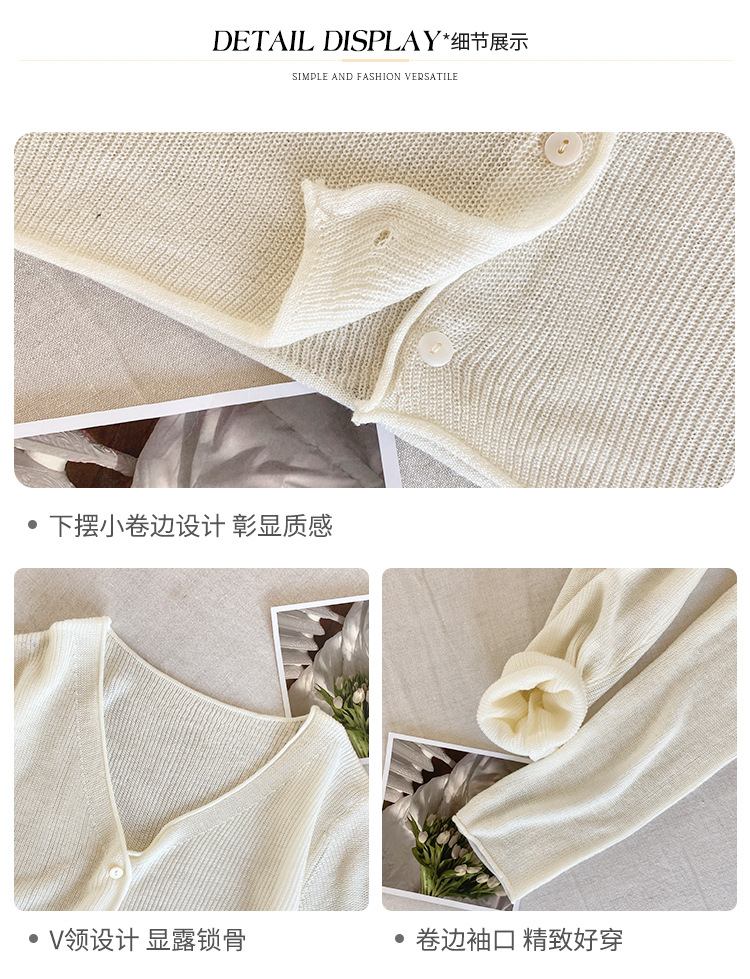 商品属性 [上市年份/季节] 2025夏季 [主面料成分] 涤纶(聚酯纤维) [主面料成分2] 氨纶 [主面料成分2含量] 30%以下 [主面料成分含量] 70%(含)-80%(不含) [厚薄] 中等 [图案] 纯色 [工艺] 针织 [是否跨境货源] 否 [款式] 开衫 [流行元素] 纽扣 [版型] 修身型 [穿着方式] 开衫 [组合形式] 单件 [衣长] 普通款(50cm<衣长≤65cm) [袖型] 常规 [袖长] 长袖 [门襟] 单排扣 [面料名称] 聚酯纤维 [领型] 无领 [风格] 都市风 [风格类型] 气质通勤