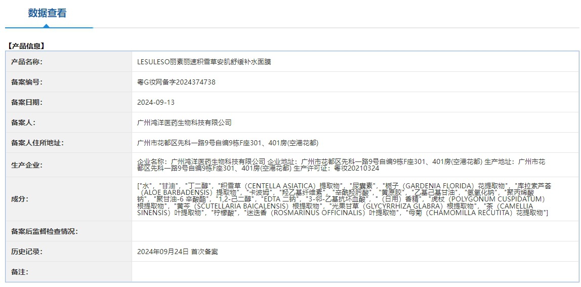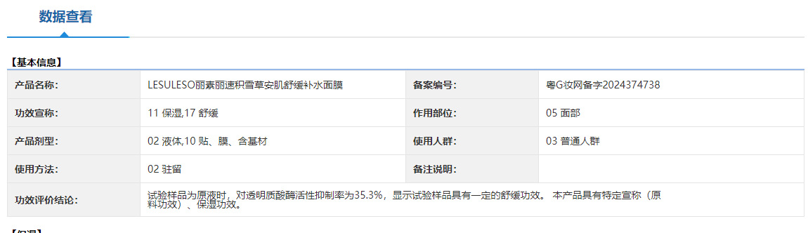商品属性 [产品名称] LESULESO丽素丽速积雪草安肌舒缓补水面膜 [产地] 广州 [保质期] 3年 [化妆品功效] 补水保湿,舒缓肌肤 [品牌类型] 精品国货 [是否跨境出口专供货源] 否 [是否进口] 否 [特殊用途化妆品] 否 [生产许可证号] 粤妆20210324 [适用人群] 通用 [适用肤质] 中性,通用,油性,干性,混合性 [非特化妆品备案证号] 粤G妆网备字2024374738