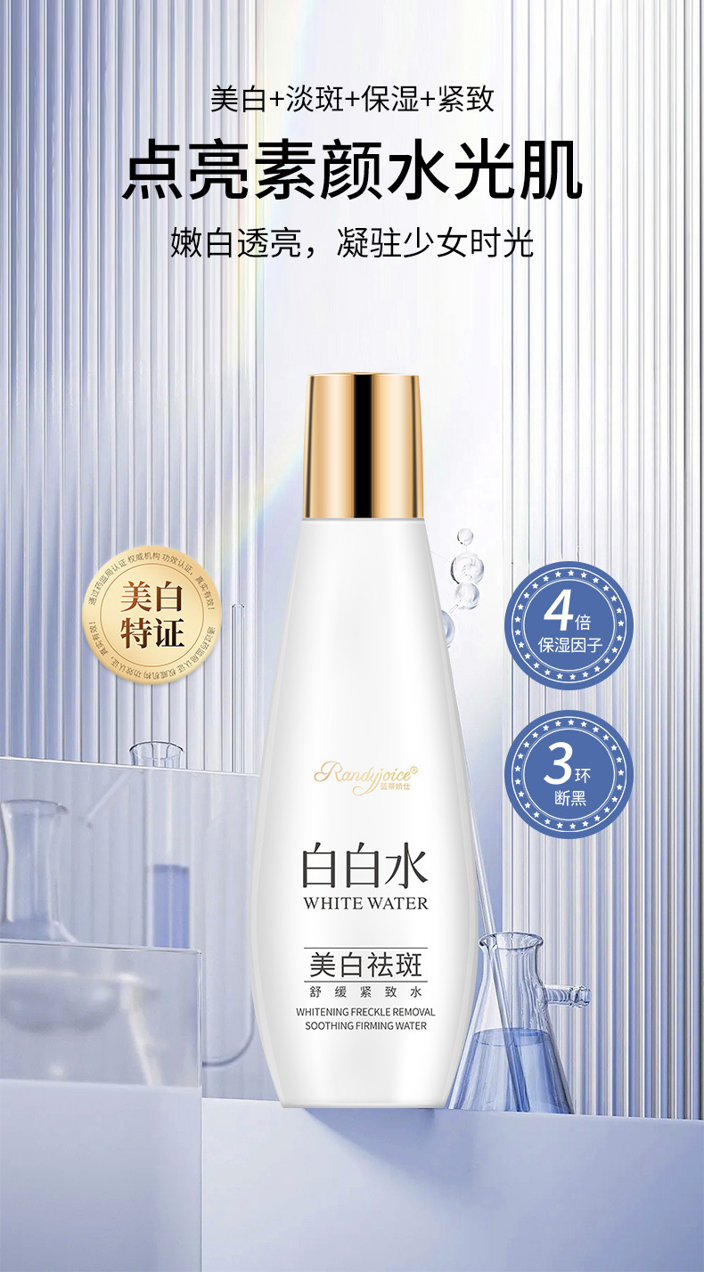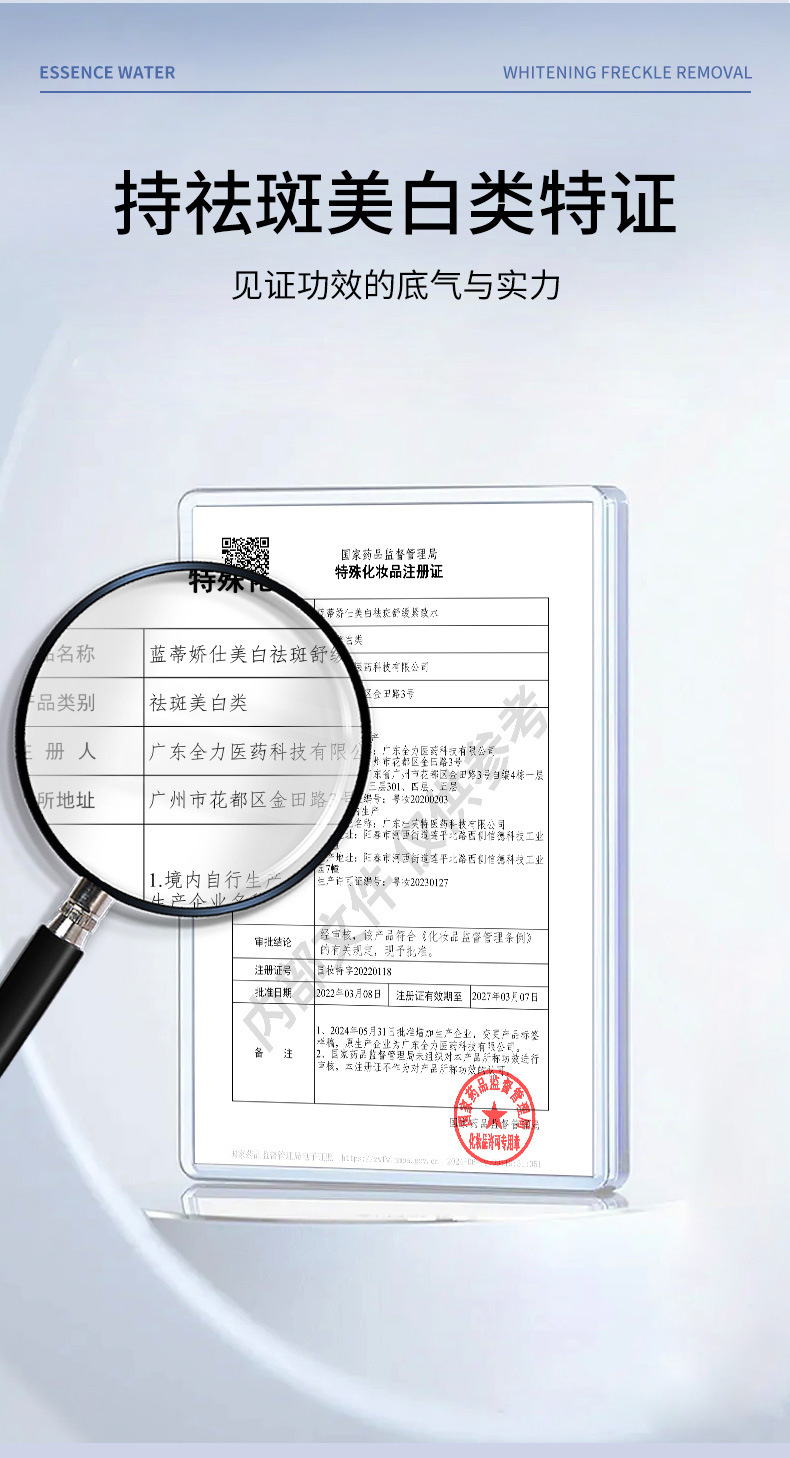 商品属性 [主要下游平台] 其他 [主要销售地区] 其他 [产地] 广东 [保质期] 3年 [化妆品功效] 美白,祛斑,紧致,舒缓肌肤 [品牌类型] 国货品牌 [定制] 是定制 [是否特征] 是国妆特征 [是否跨境出口专供货源] 是 [是否进口] 否 [有可授权的自有品牌] 否 [特妆产品名称] 蓝蒂娇仕美白祛斑舒缓紧致水 [特殊用途化妆品] 是 [特殊用途化妆品证号] 国妆特字20220118 [生产许可证号] 粤妆20240235 [适用人群] 女士 [适用肤质] 通用