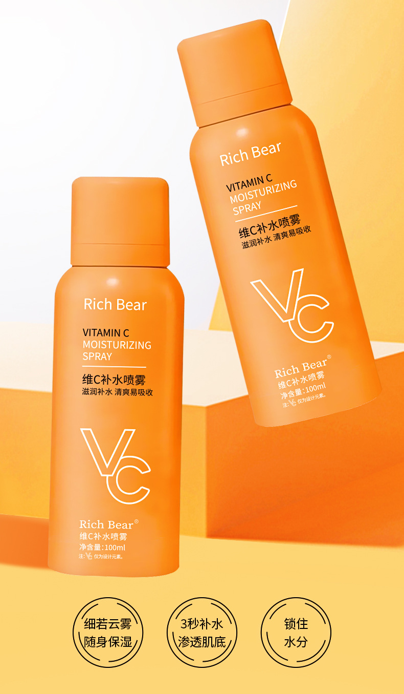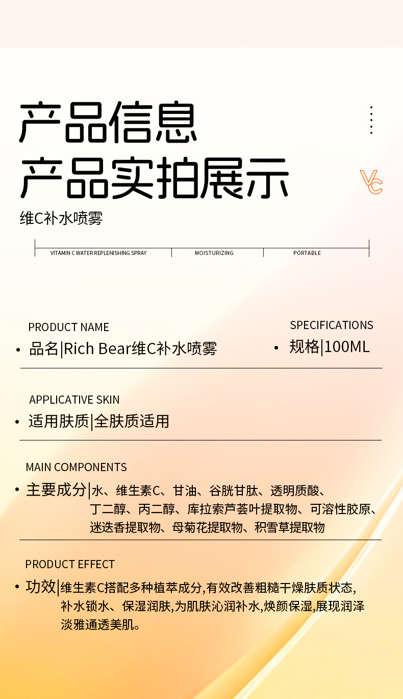 商品属性 [主要下游平台] ebay,亚马逊,wish,速卖通,独立站,LAZADA [主要销售地区] 非洲,欧洲,南美,东南亚,北美,东北亚,中东 [产品名称] Rich Bear维C补水喷雾 [产地] 广东 [保质期] 3年 [化妆品功效] 补水保湿,滋润 [品牌类型] 国货品牌 [是否跨境出口专供货源] 是 [是否进口] 否 [有可授权的自有品牌] 是 [特殊用途化妆品] 否 [生产许可证号] 粤妆20161057 [适用人群] 通用 [适用肤质] 通用 [非特化妆品备案证号] 粤G妆网备字2024070584