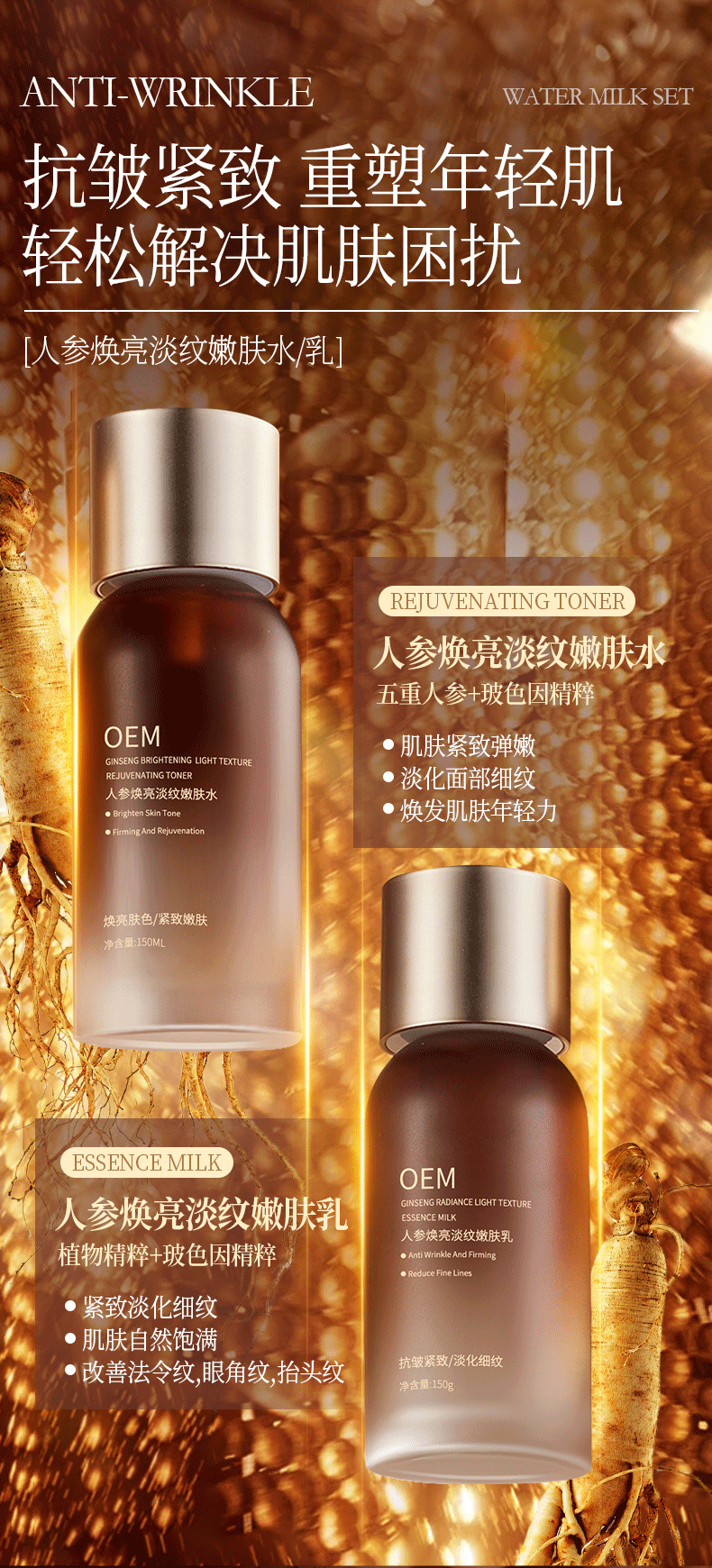 商品属性 [产品名称] 紧致抗皱水乳oem [产地] 广州 [保质期] 3年 [化妆品功效] 控油,补水保湿,提亮肤色,晒后修护,滋润,紧致,舒缓肌肤,柔润肌肤 [品牌类型] OEM [是否跨境出口专供货源] 否 [是否进口] 否 [特妆产品名称] 人参水乳套盒 [特殊用途化妆品] 否 [生产许可证号] 粤妆20220015 [适用人群] 女士,男士 [适用肤质] 油性 [非特化妆品备案证号] 粤G妆网备字2022129114