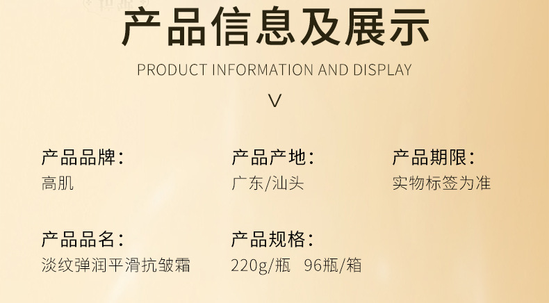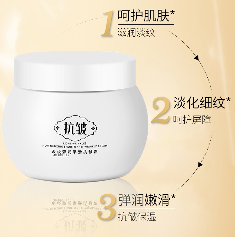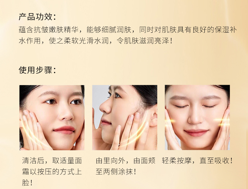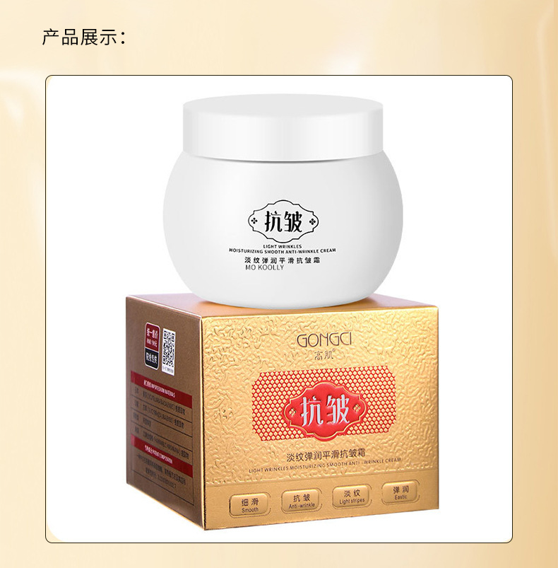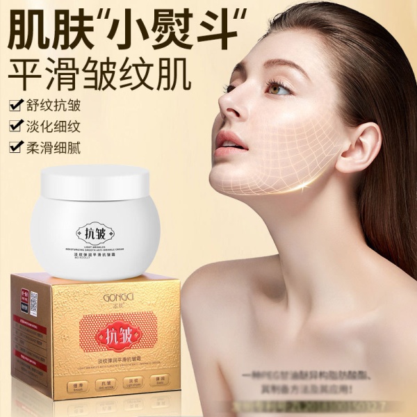 商品属性 [产品名称] 淡纹弹润平滑抗皱霜 [产地] 广东 [保质期] 3年 [化妆品功效] 其他功效,补水保湿,提亮肤色,柔润肌肤 [品牌类型] 国货品牌 [是否跨境出口专供货源] 否 [是否进口] 否 [特妆产品名称] 淡纹弹润平滑抗皱霜 [特殊用途化妆品] 否 [生产许可证号] 粤妆20161470 [适用人群] 女士,男士,通用,普通人群 [适用肤质] 中性,通用,油性,干性,敏感性,混合性 [非特化妆品备案证号] 粤G妆网备字2022314835