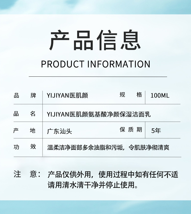 【产品名称】YIJIYAN医肌颜氨基酸净颜保湿洁面乳