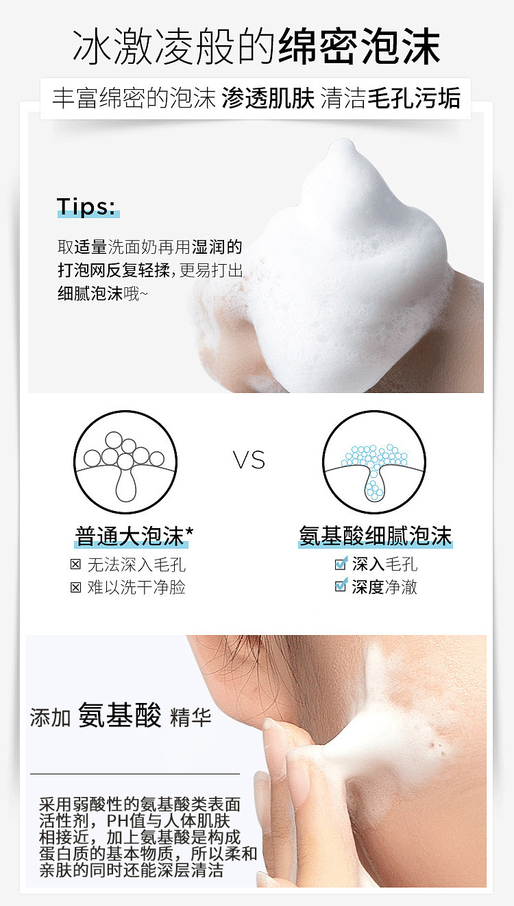 【功效】蕴含氨基酸精华,温柔洁净面部多余油脂和污垢,令肌肤清新舒爽,不紧绷。令肌肤净彻清爽。