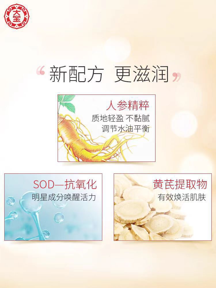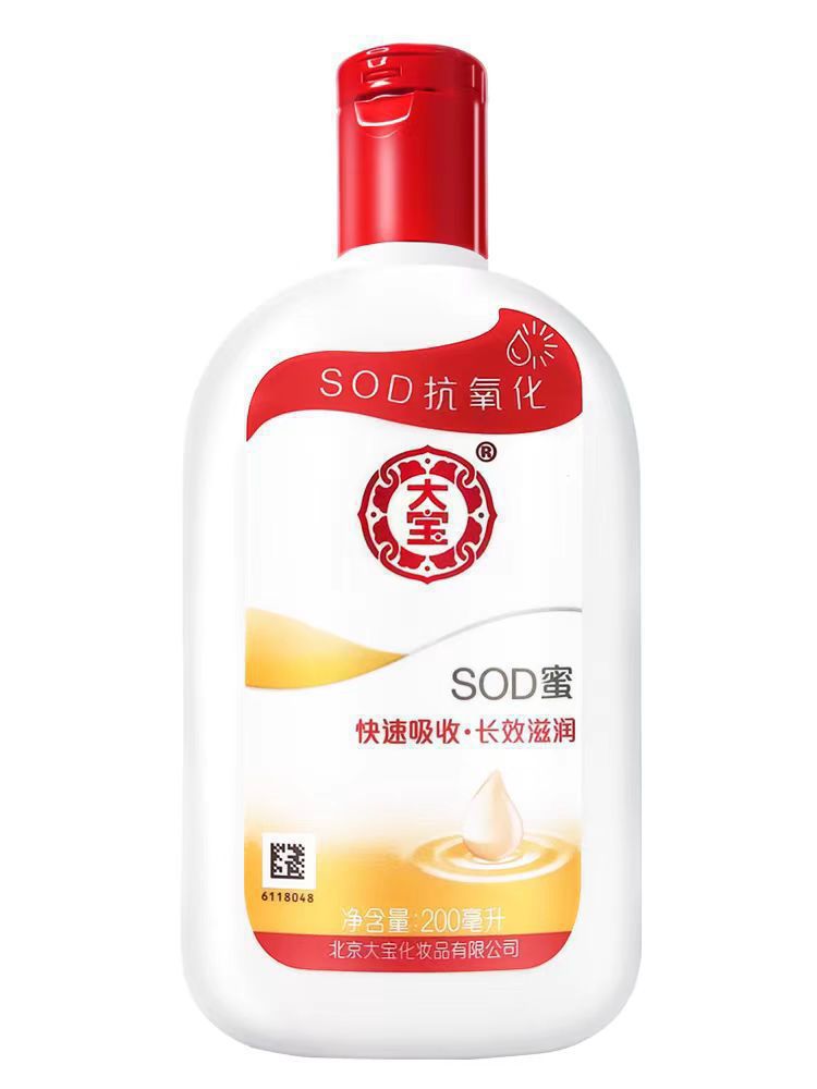 商品属性 [产品名称] SOD蜜100ml [产地] 杭州 [保质期] 3年 [化妆品功效] 补水保湿,晒后修护,柔润肌肤 [品牌类型] 国货品牌 [是否跨境出口专供货源] 否 [是否进口] 否 [特妆产品名称] 大宝100mlsod蜜 [特殊用途化妆品] 否 [生产许可证号] 京妆20160020 [适用人群] 通用 [适用肤质] 通用 [非特化妆品备案证号] 京G妆网备字2019005059
