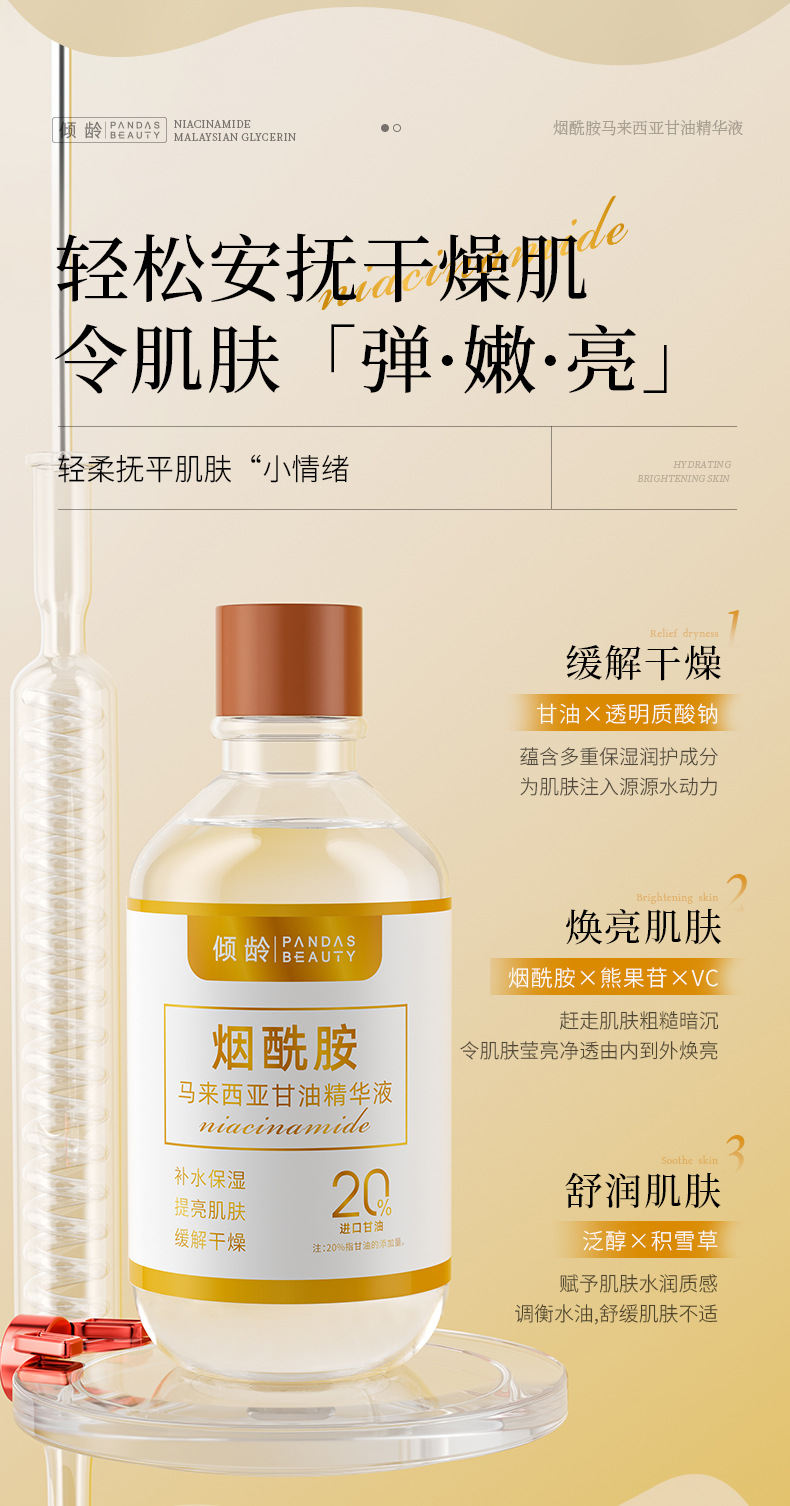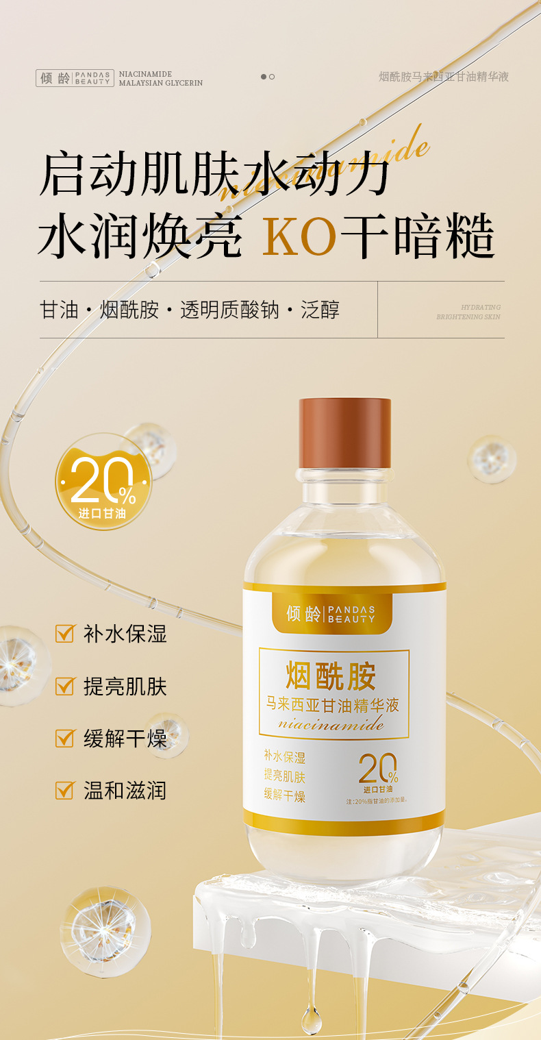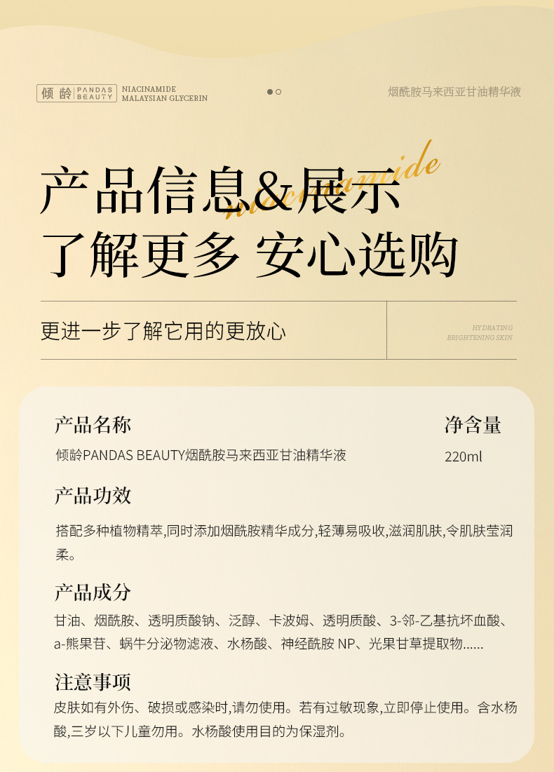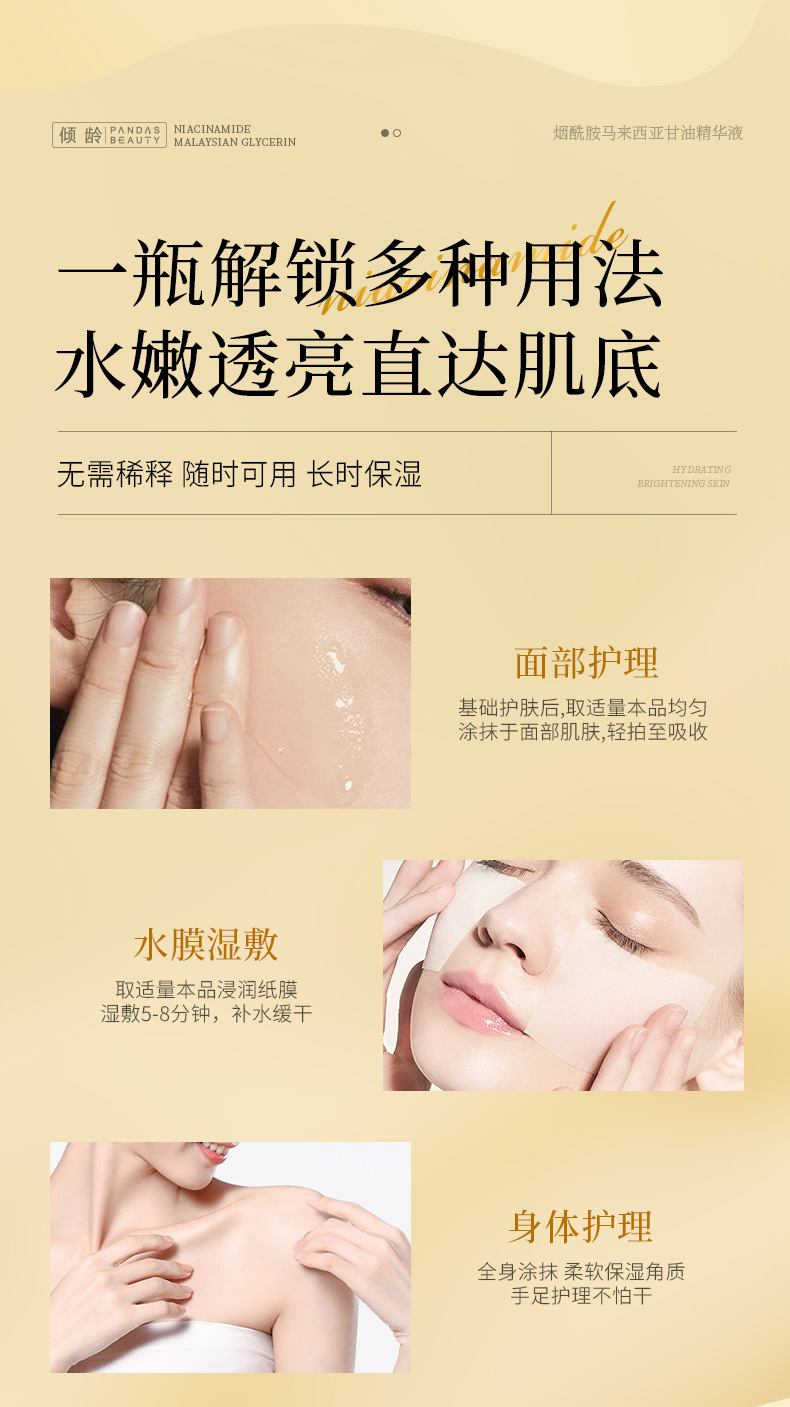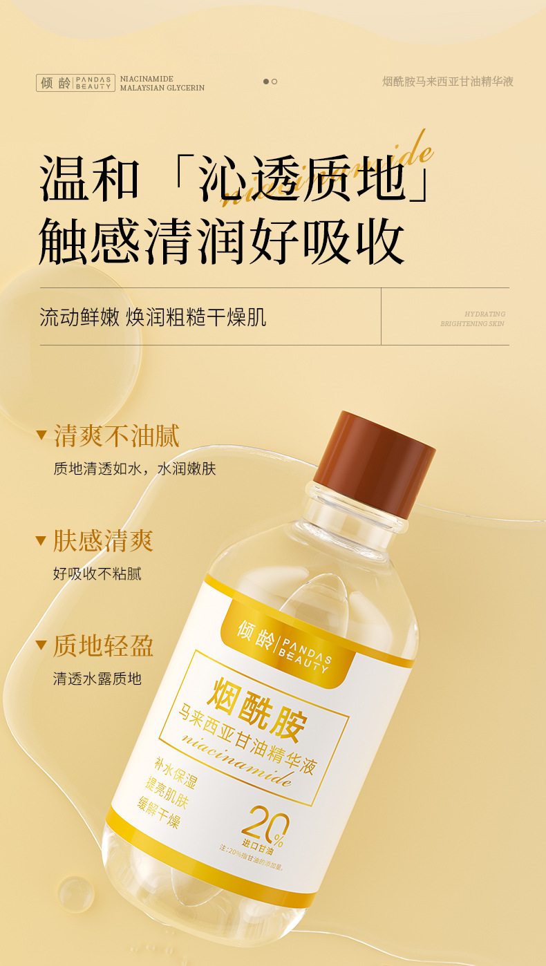 商品属性 [主要下游平台] ebay,亚马逊,wish,速卖通,独立站,LAZADA [主要销售地区] 非洲,欧洲,南美,东南亚,北美,东北亚,中东 [产品名称] 倾龄烟酰胺马来西亚甘油精华液 [产地] 广州 [保质期] 3年 [化妆品功效] 滋润,紧致,柔润肌肤 [品牌类型] 国货品牌 [是否跨境出口专供货源] 是 [是否进口] 否 [有可授权的自有品牌] 是 [特殊用途化妆品] 否 [生产许可证号] 粤妆20161003 [适用人群] 女士 [适用肤质] 通用 [非特化妆品备案证号] 粤G妆网备字2020127635
