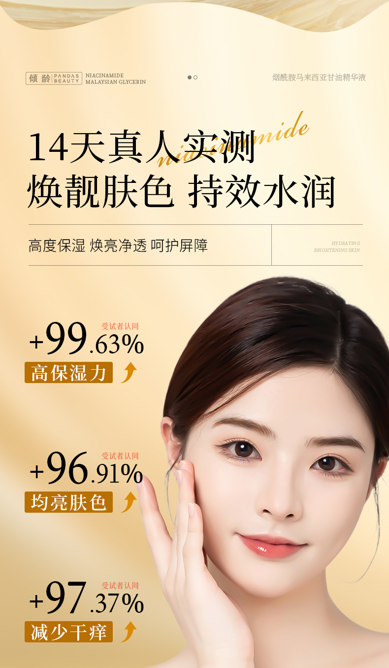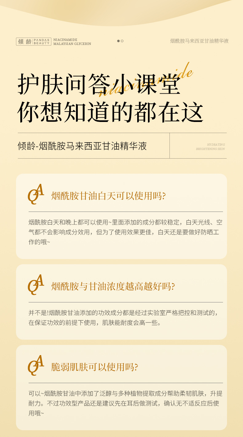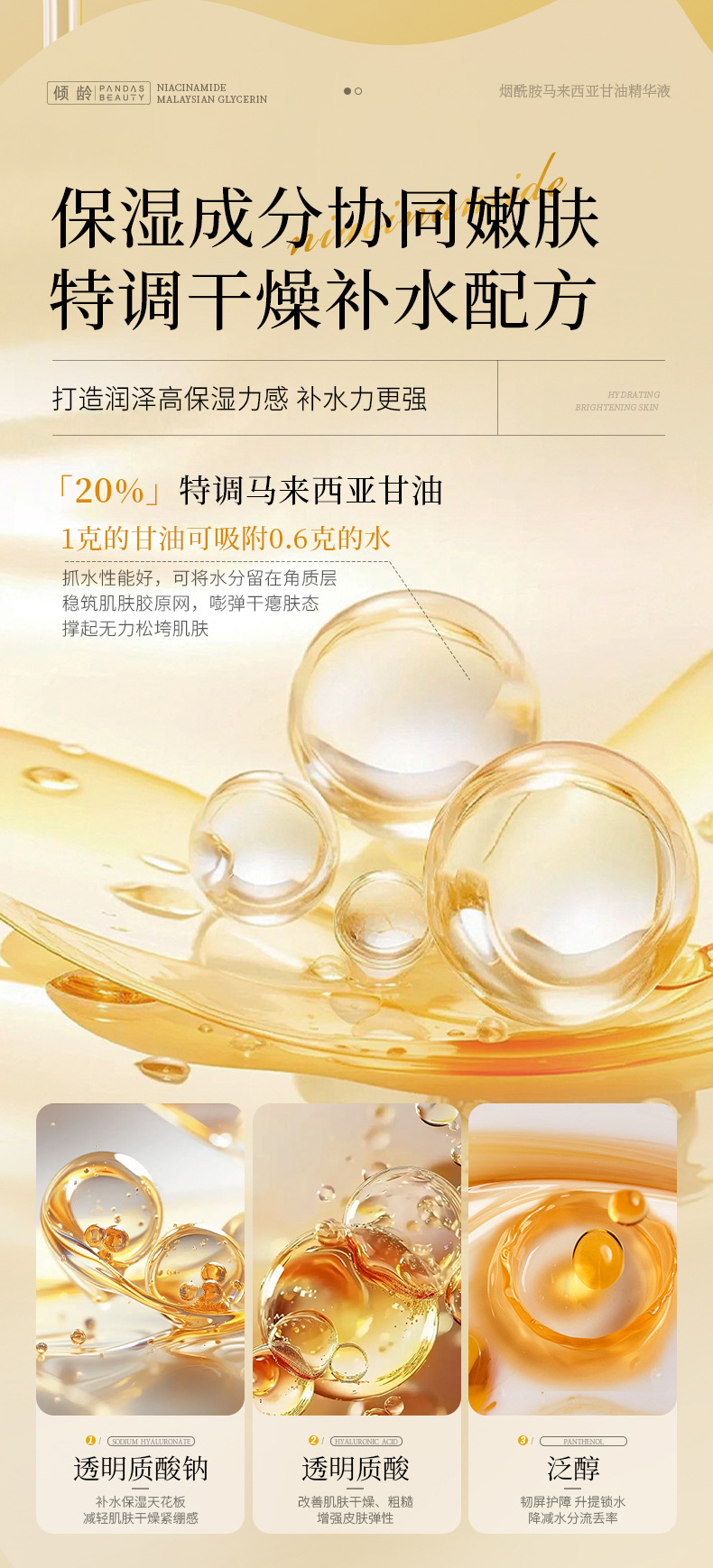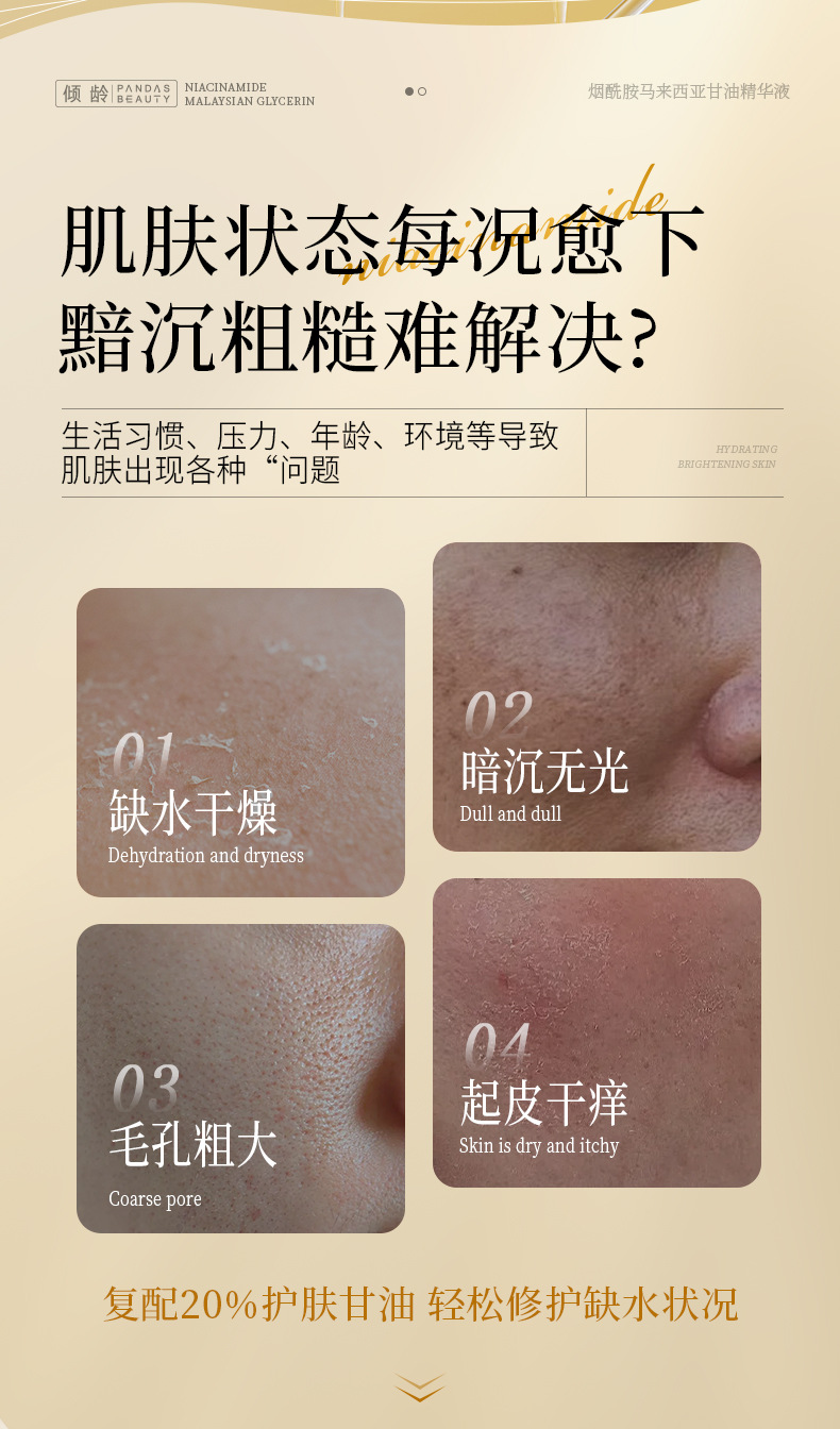 商品属性 [主要下游平台] ebay,亚马逊,wish,速卖通,独立站,LAZADA [主要销售地区] 非洲,欧洲,南美,东南亚,北美,东北亚,中东 [产品名称] 倾龄烟酰胺马来西亚甘油精华液 [产地] 广州 [保质期] 3年 [化妆品功效] 滋润,紧致,柔润肌肤 [品牌类型] 国货品牌 [是否跨境出口专供货源] 是 [是否进口] 否 [有可授权的自有品牌] 是 [特殊用途化妆品] 否 [生产许可证号] 粤妆20161003 [适用人群] 女士 [适用肤质] 通用 [非特化妆品备案证号] 粤G妆网备字2020127635