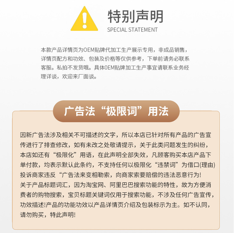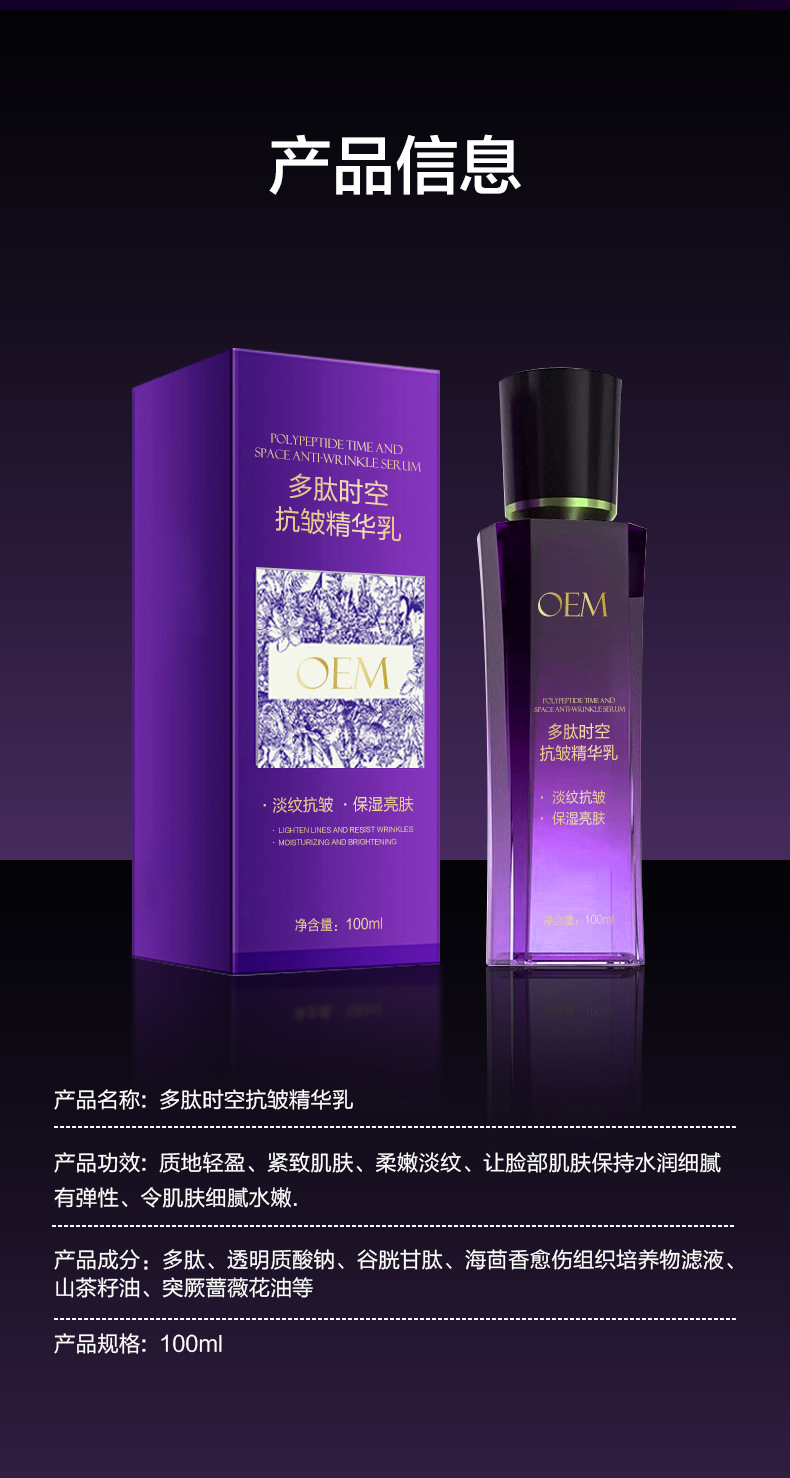 商品属性 [产地] 广州 [保质期] 3年 [化妆品功效] 补水保湿,提亮肤色,紧致 [品牌类型] OEM [是否跨境出口专供货源] 否 [是否进口] 否 [特殊用途化妆品] 否 [适用人群] 女士,男士 [适用肤质] 通用 [非特化妆品备案证号] 粤G妆网备字2017000002