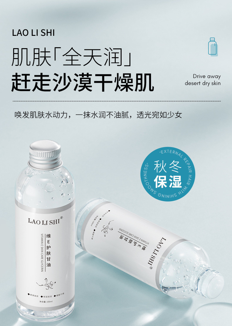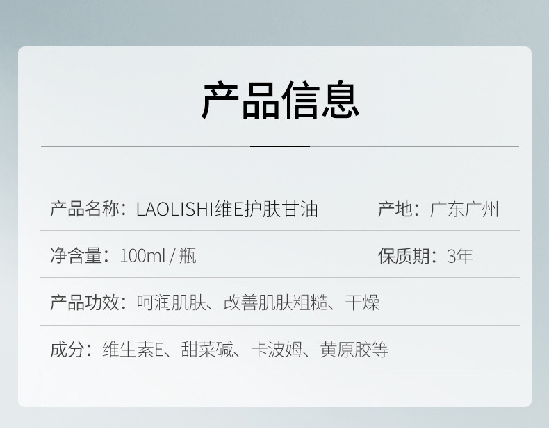 商品属性 [主要下游平台] ebay,亚马逊,wish,速卖通,独立站,LAZADA [主要销售地区] 非洲,欧洲,南美,东南亚,北美,东北亚,中东 [产品名称] 劳丽诗维E护肤甘油保湿滋润提亮肤色精华水 [产地] 广州 [保质期] 3年 [包装种类] 基础包装 [化妆品功效] 保湿,补水,补水保湿,提亮肤色 [品牌类型] 国货品牌 [是否跨境出口专供货源] 是 [是否进口] 否 [有可授权的自有品牌] 是 [特妆产品名称] 劳丽诗维E护肤甘油 [特殊用途化妆品] 否 [生产许可证号] 粤妆20170374 [质地] 乳霜 [适用人群] 通用 [适用肤质] 通用 [非特化妆品备案证号] 粤G妆网备字2024341838