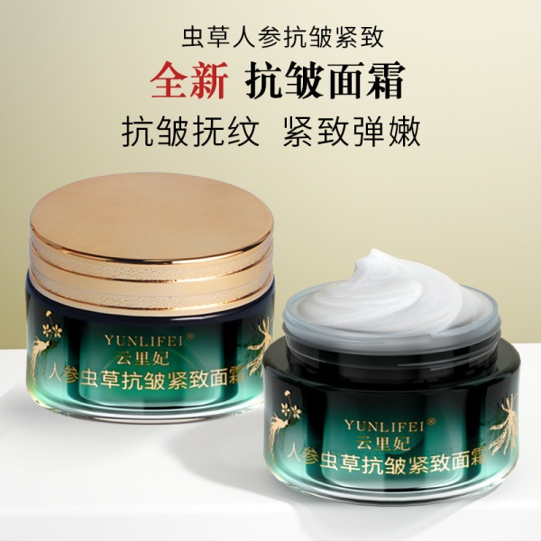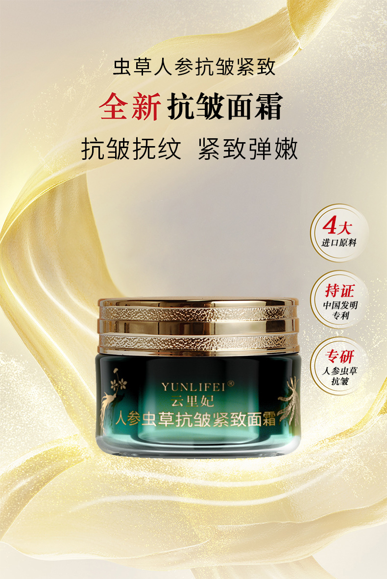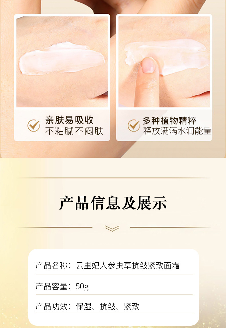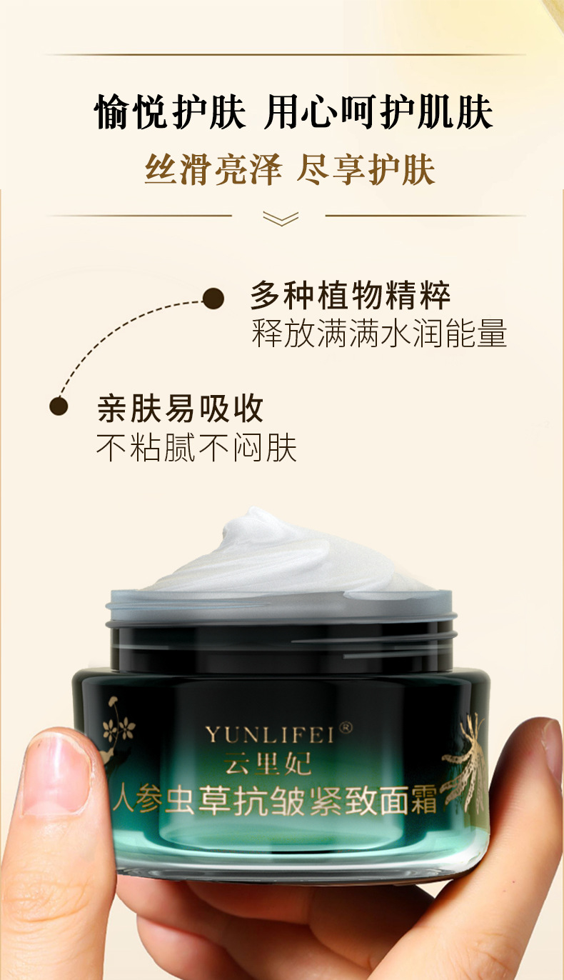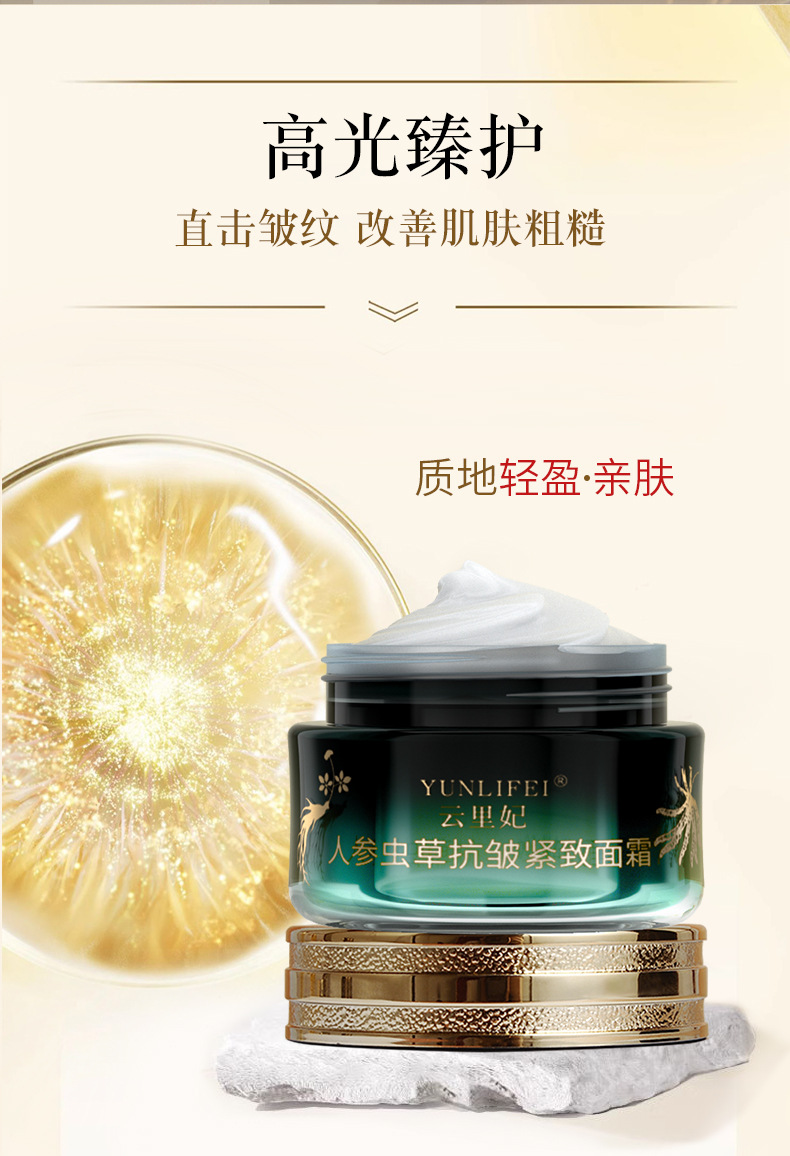 商品属性 [产品名称] 云里妃人参虫草抗皱紧致面霜 [产地] 广东 [保质期] 3年 [化妆品功效] 滋润,紧致 [品牌类型] 国货品牌 [是否跨境出口专供货源] 否 [是否进口] 否 [特妆产品名称] 非特妆 [特殊用途化妆品] 否 [生产许可证号] 粤妆20220295 [适用人群] 普通人群 [非特化妆品备案证号] 粤G妆网备字2024149999