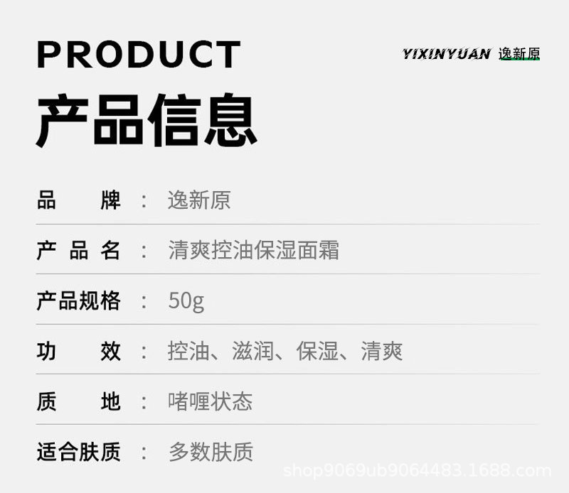 商品属性 [产品名称] 逸新原清爽控油保湿面霜 [产地] 广州 [保质期] 3年 [化妆品功效] 控油,补水保湿,滋润 [品牌类型] 国货品牌 [是否进口] 否 [特殊用途化妆品] 否 [生产许可证号] 粤妆20190192 [适用人群] 普通人群 [适用肤质] 混合性 [非特化妆品备案证号] 粤G妆网备字2024242840