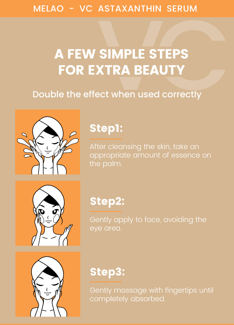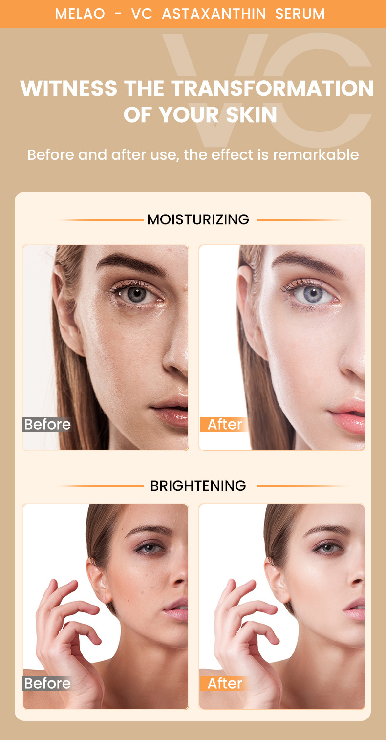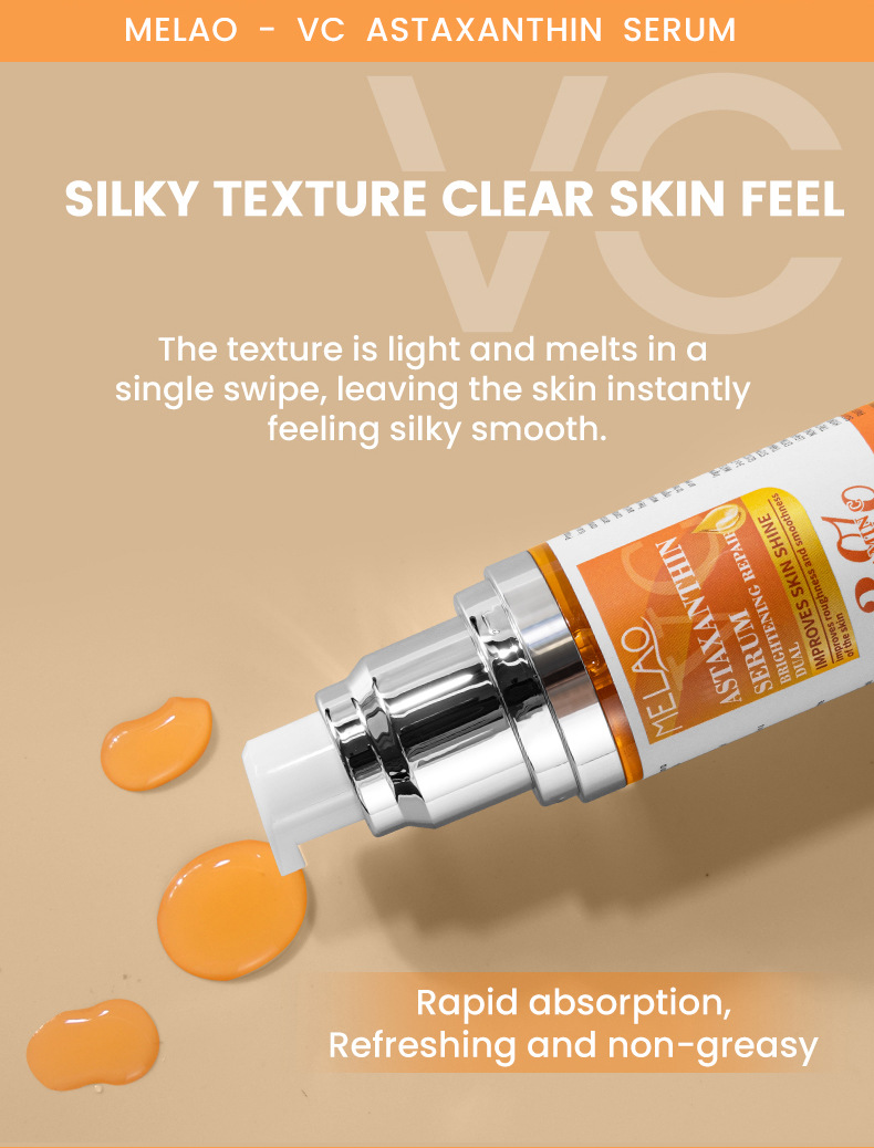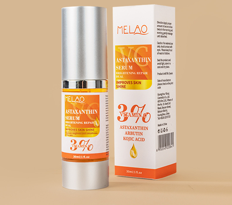 商品属性 [主要下游平台] 亚马逊,速卖通,独立站 [主要销售地区] 欧洲,南美,北美,中东 [产品名称] VC虾青素精华液 [产地] 佛山 [保质期] 3年 [包装种类] 基础包装 [化妆品功效] 补水保湿,滋润 [单品规格] 3.4*3.4*12.5 76g//瓶 [品牌类型] OEM [是否跨境出口专供货源] 是 [是否进口] 否 [有可授权的自有品牌] 是 [特殊用途化妆品] 否 [生产许可证号] 粤妆20210038 [箱规] 120瓶/箱 37*23.5*29 10.75kg [质地] 原液 [适用人群] 女士 [适用肤质] 通用 [非特化妆品备案证号] 粤G妆网备字2023102773