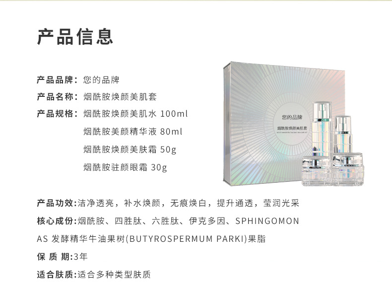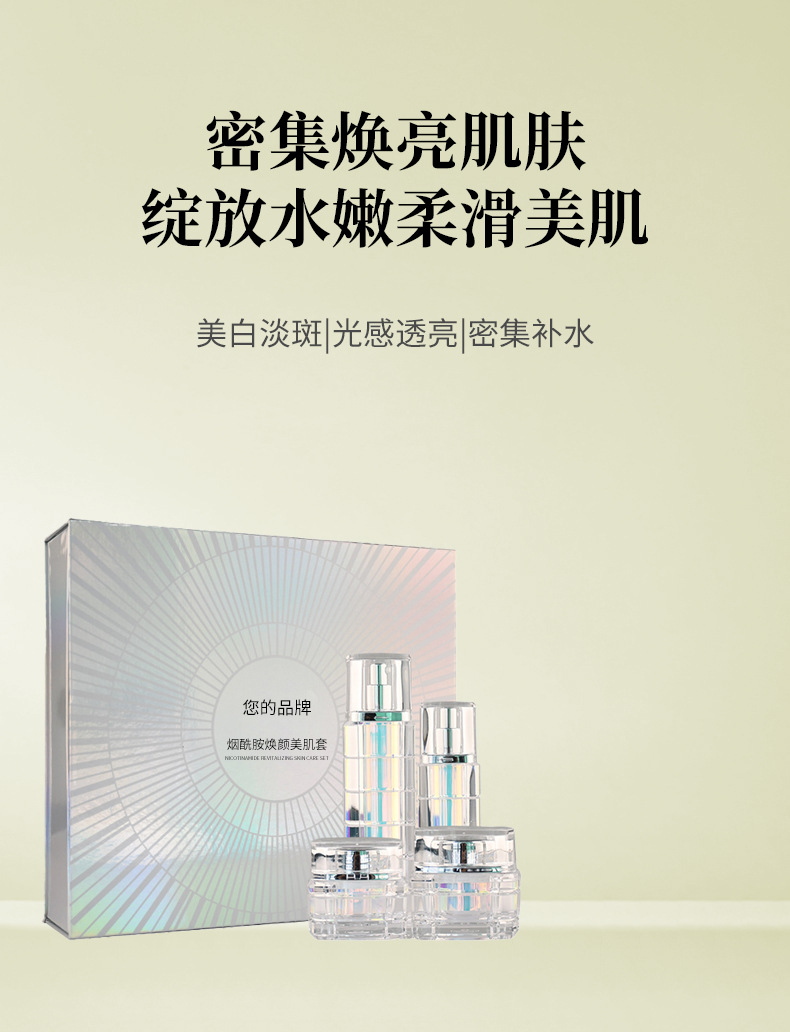 商品属性 [上市时间] 2024 [产品名称] 烟酰胺美白套盒 [产品系列] 贴牌加工定制系列 [产地] 广州 [保质期] 三年 [功效] 美白,祛斑 [化妆品功效] 控油,补水保湿,滋润 [品牌类型] OEM [成分原料] 水,丁二醇,甘油,烟酰胺 [是否跨境出口专供货源] 否 [是否进口] 否 [特殊用途化妆品] 是 [特殊用途化妆品证号] 国妆特字20235466 [生产许可证号] 粤装20170737 [箱] 按需定制 [适用人群] 女士 [适用肤质] 通用 [颜色分类] 其他