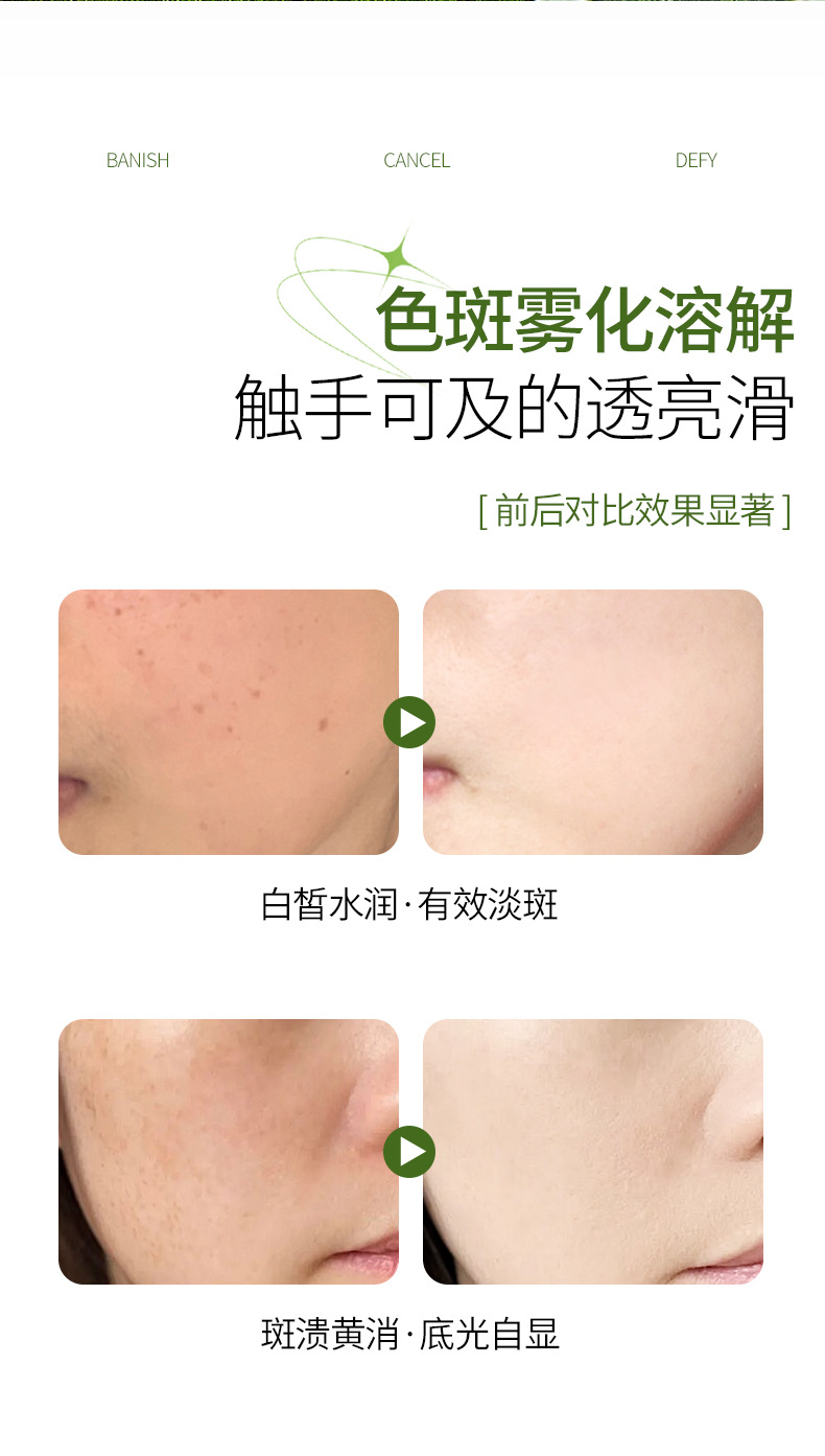 商品属性 [主要下游平台] 独立站,LAZADA,其他 [主要销售地区] 北美,东北亚,中东,其他 [产品名称] 祛斑精华液 [产地] 广东 [保质期] 3年 [包装种类] 基础包装 [化妆品功效] 祛斑 [品牌类型] 国货品牌 [是否跨境出口专供货源] 是 [是否进口] 否 [有可授权的自有品牌] 是 [特妆产品名称] 祛斑精华液 [特殊用途化妆品] 是 [特殊用途化妆品证号] 国妆特字20245596 [生产许可证号] 粤妆20161348 [质地] 原液 [适用人群] 女士 [适用肤质] 中性