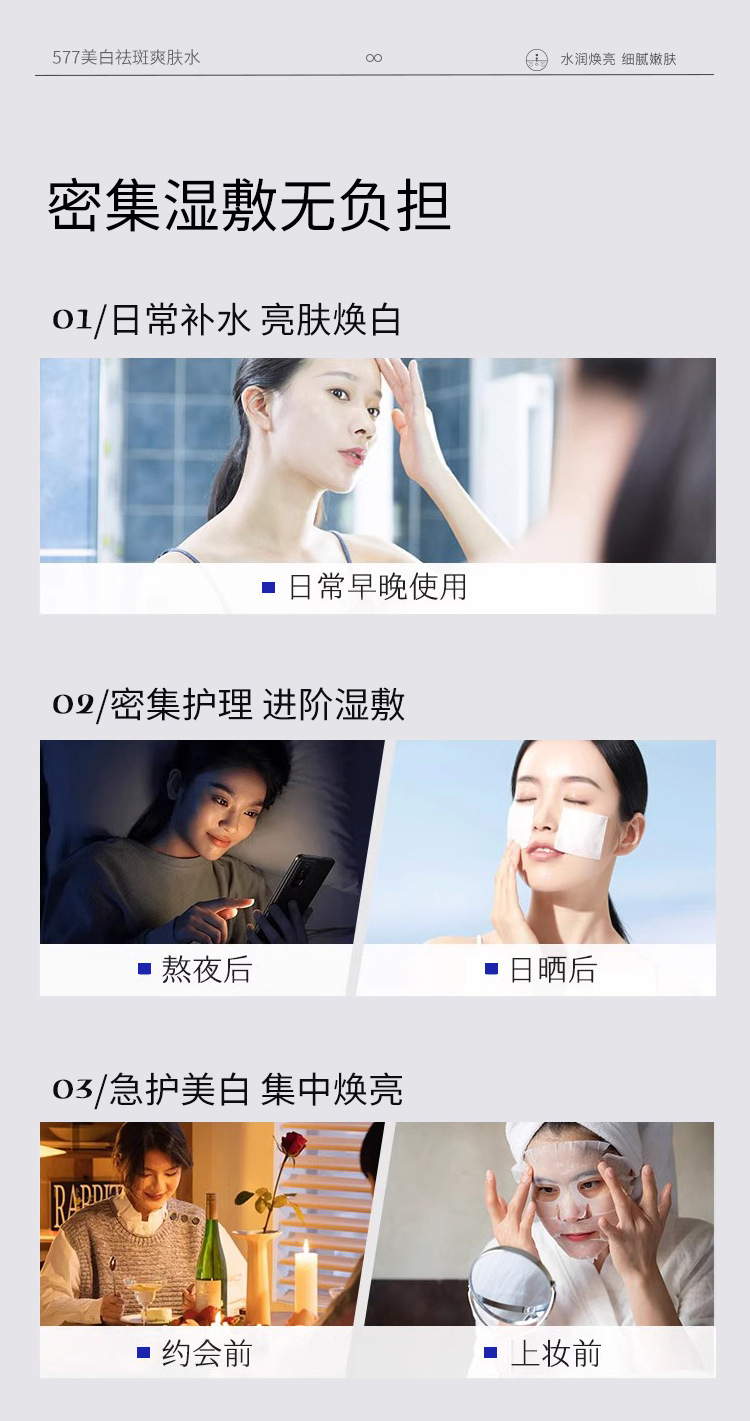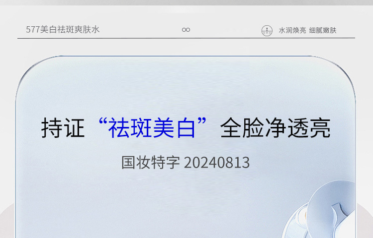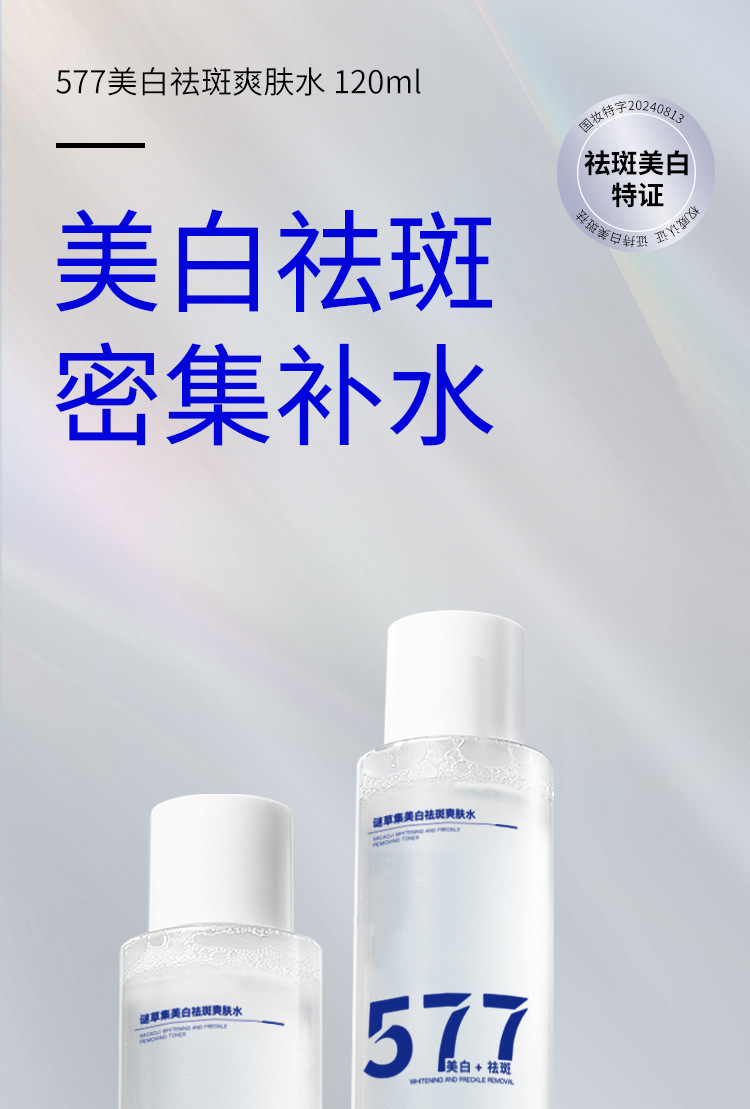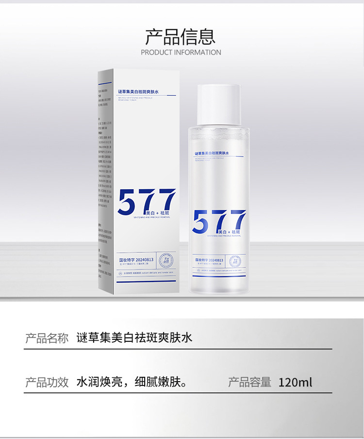 商品属性 [产地] 广州 [保质期] 3年 [化妆品功效] 美白,补水保湿 [品牌类型] 国货品牌 [是否跨境出口专供货源] 否 [是否进口] 否 [特妆产品名称] 谜草集美白祛斑爽肤水 [特殊用途化妆品] 是 [特殊用途化妆品证号] 国妆特字20240813 [适用人群] 女士,男士 [适用肤质] 中性,干性,混合性