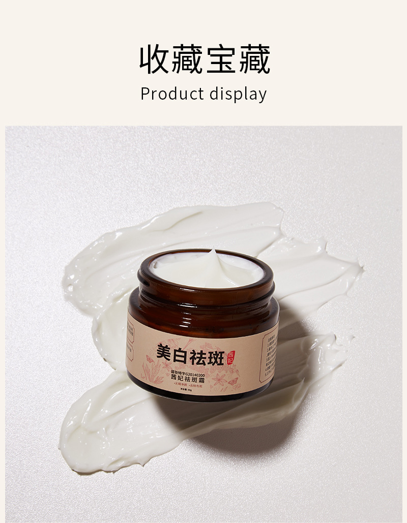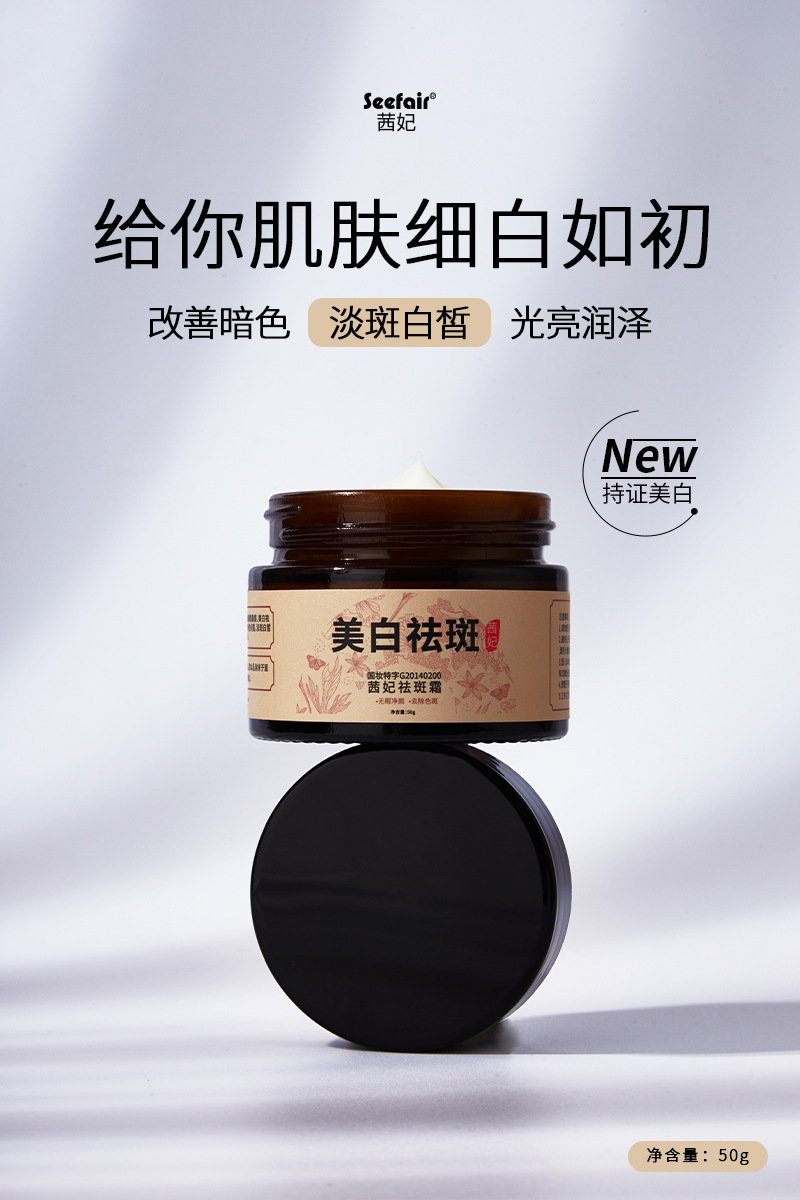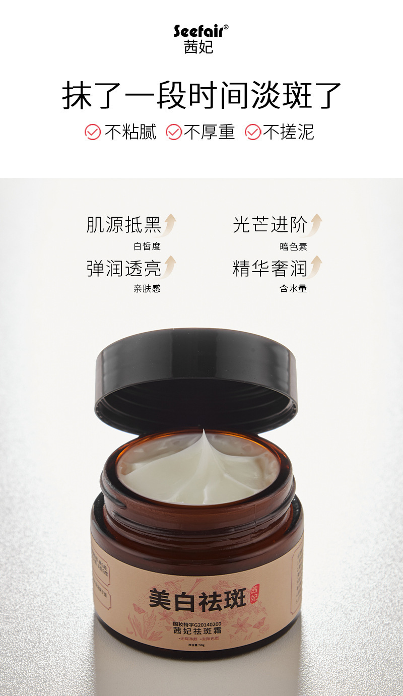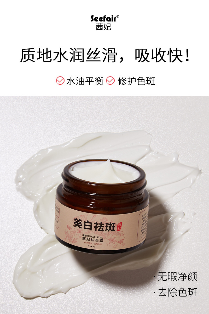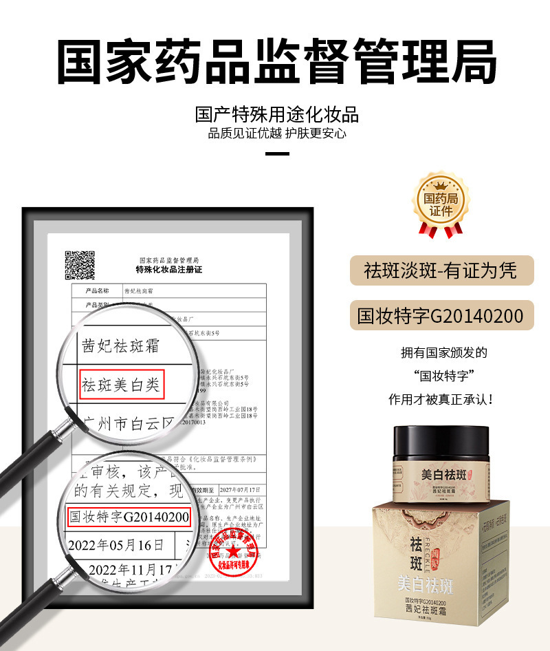 商品属性 [产品名称] 茜妃祛斑霜 [产地] 广州 [保质期] 3年 [化妆品功效] 美白,提亮肤色,祛斑,去黑头,滋润,舒缓肌肤,柔润肌肤 [品牌类型] 国货品牌 [是否跨境出口专供货源] 否 [是否进口] 否 [特殊用途化妆品] 是 [特殊用途化妆品证号] 国妆特字G20140200 [生产许可证号] 粤妆20160199 [适用人群] 通用 [适用肤质] 中性,油性,干性,混合性