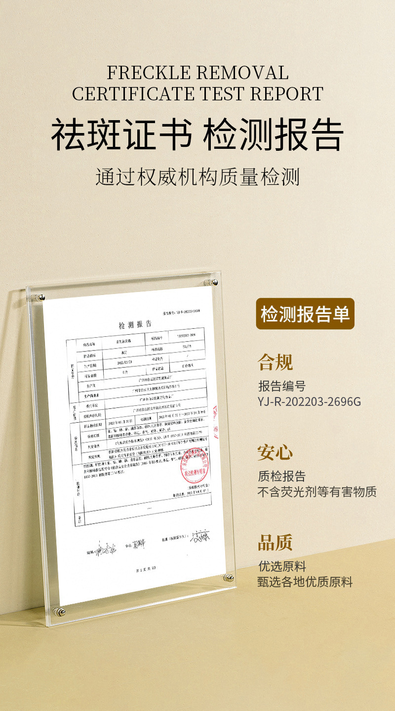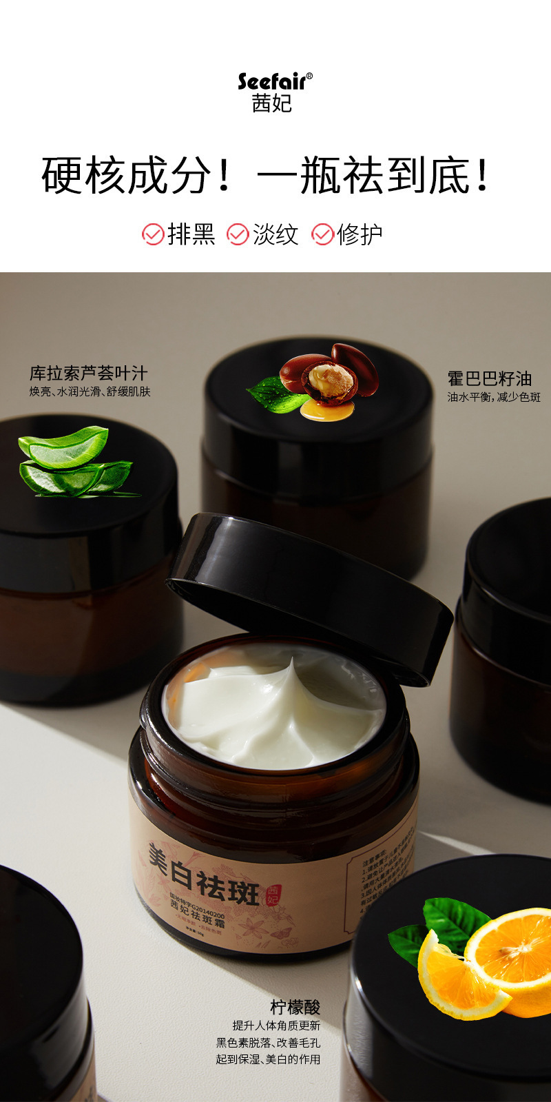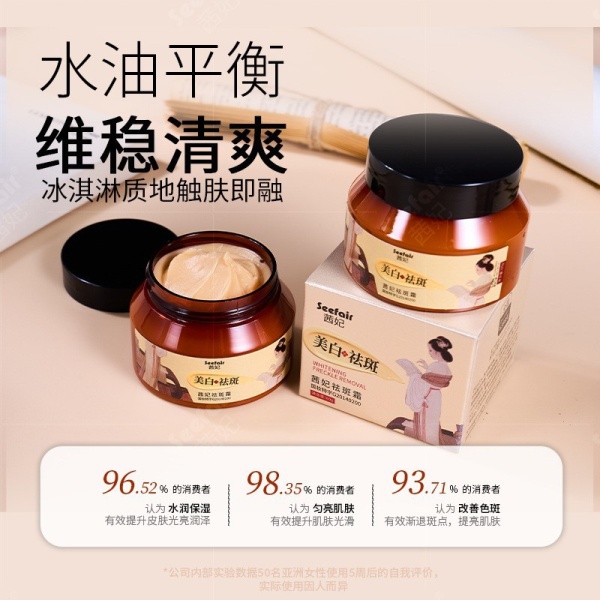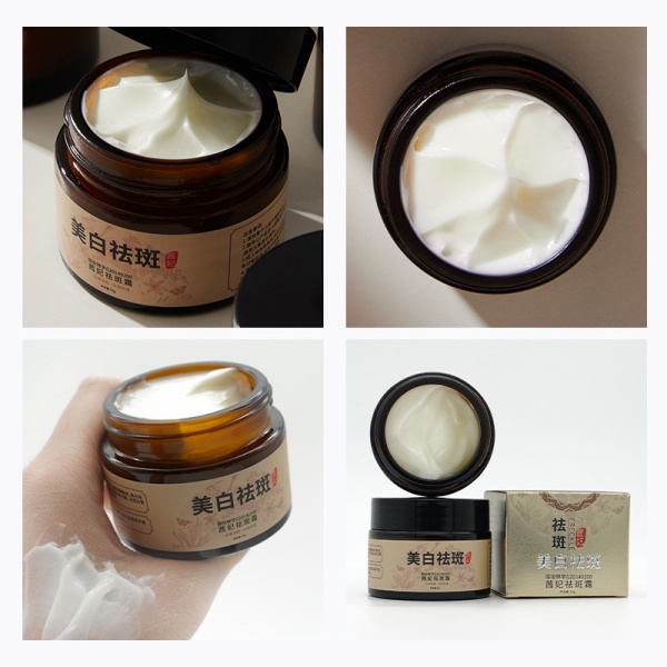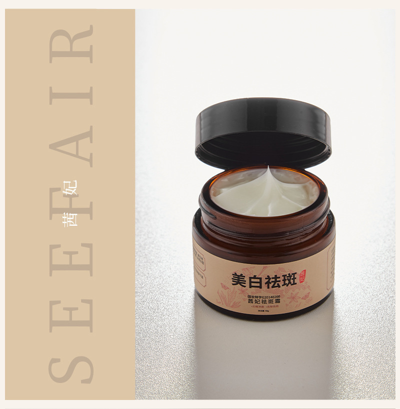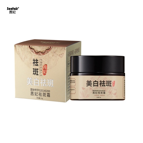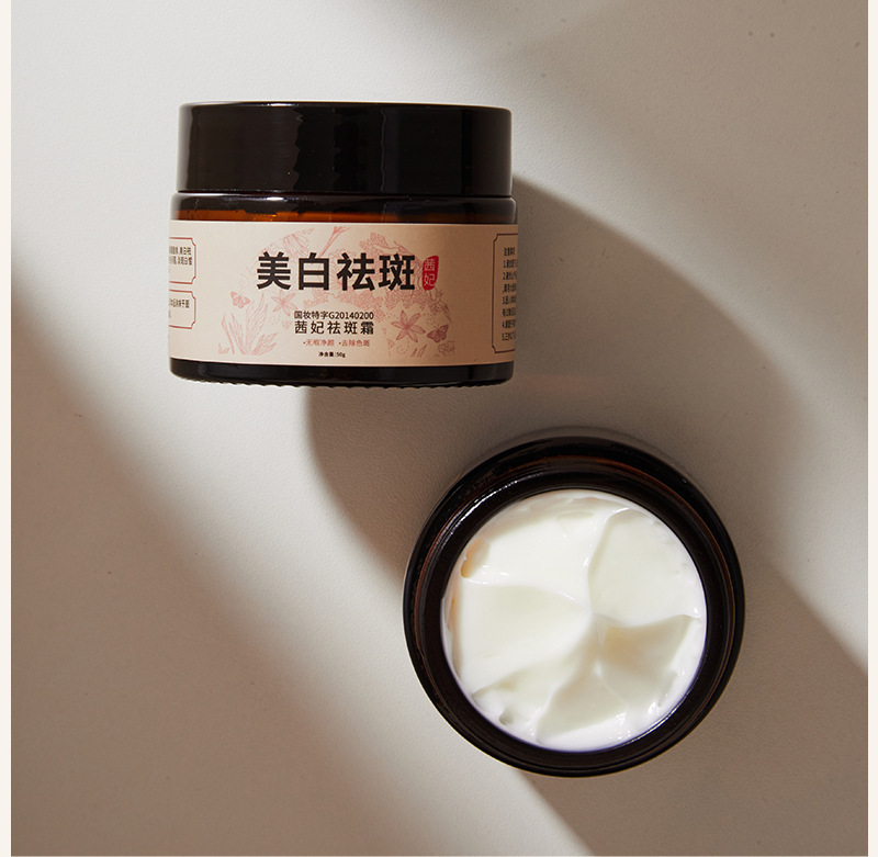 商品属性 [产品名称] 茜妃祛斑霜 [产地] 广州 [保质期] 3年 [化妆品功效] 美白,提亮肤色,祛斑,去黑头,滋润,舒缓肌肤,柔润肌肤 [品牌类型] 国货品牌 [是否跨境出口专供货源] 否 [是否进口] 否 [特殊用途化妆品] 是 [特殊用途化妆品证号] 国妆特字G20140200 [生产许可证号] 粤妆20160199 [适用人群] 通用 [适用肤质] 中性,油性,干性,混合性