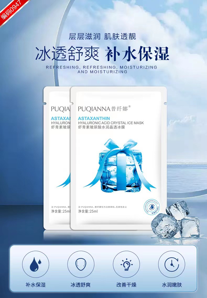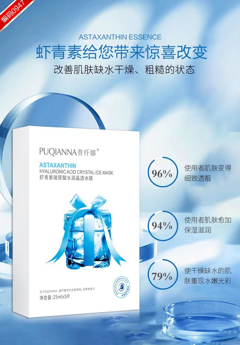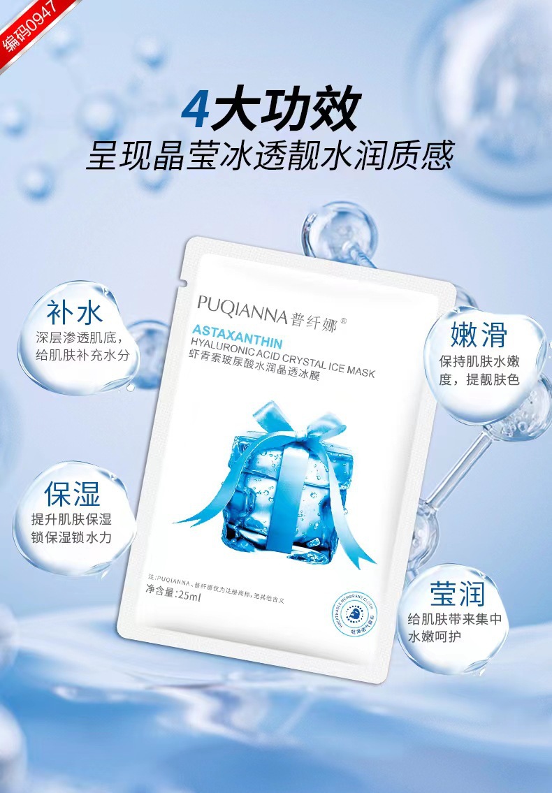 商品属性 [产品名称] 普纤娜虾青素玻尿酸水润晶透冰膜 [产地] 广东 [保质期] 3年 [化妆品功效] 深层清洁 [品牌类型] 国货品牌 [是否跨境出口专供货源] 否 [是否进口] 否 [特殊用途化妆品] 否 [生产许可证号] 粤妆20160920 [适用人群] 通用 [适用肤质] 通用 [非特化妆品备案证号] 粤G妆网备字2023117899
