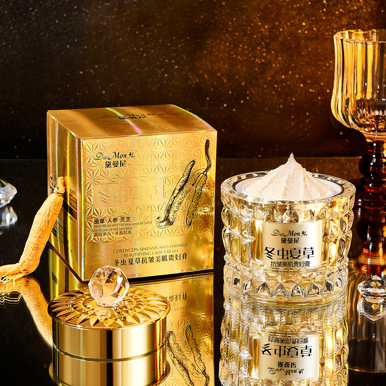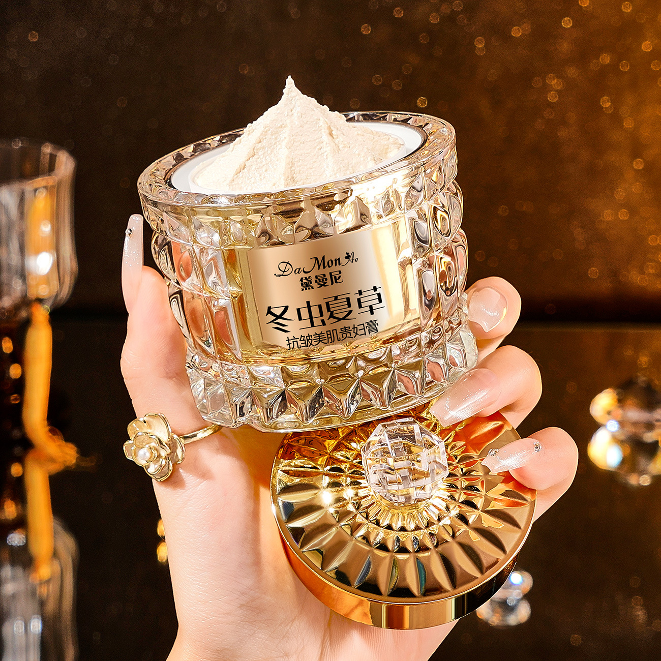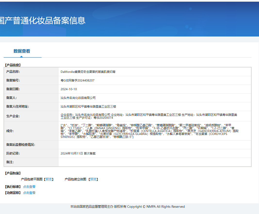 商品属性 [产品名称] DaMonAe黛曼尼冬虫夏草抗皱美肌贵妇膏 [产地] 广东 [保质期] 3年 [化妆品功效] 其他功效 [品牌类型] 国货品牌 [是否进口] 否 [特妆产品名称] DaMonAe黛曼尼冬虫夏草抗皱美肌贵妇膏 [特殊用途化妆品] 否 [生产许可证号] 粤妆20200074 [适用人群] 普通人群 [非特化妆品备案证号] 粤G妆网备字2024408207