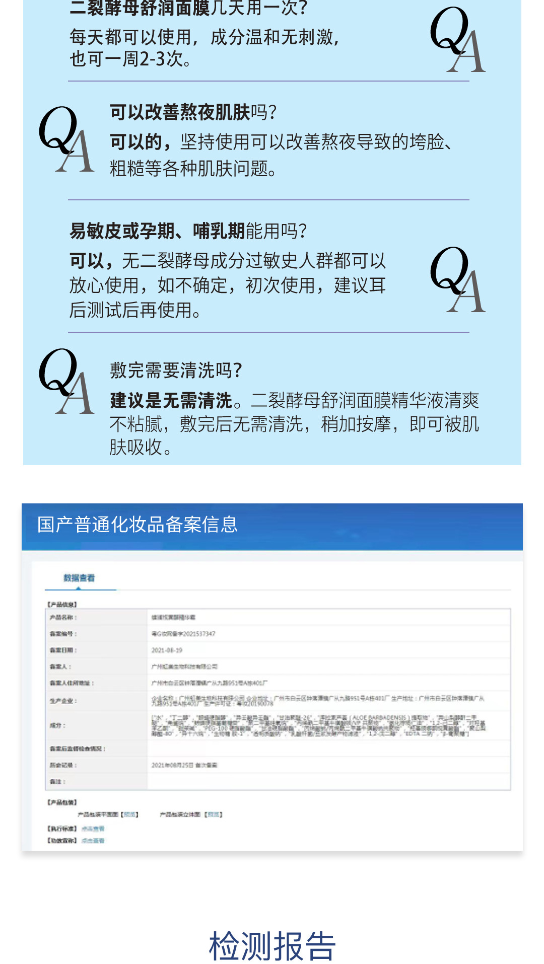商品属性 [产品名称] BELARME二裂酵母舒润面膜 [产地] 广州 [保质期] 3年 [化妆品功效] 补水保湿,提亮肤色,晒后修护,滋润,舒缓肌肤 [品牌类型] 国货品牌 [是否跨境出口专供货源] 否 [是否进口] 否 [特殊用途化妆品] 否 [生产许可证号] 粤妆20190078 [适用人群] 女士 [适用肤质] 中性,通用,油性,干性,敏感性 [非特化妆品备案证号] 粤G妆网备字2023336286