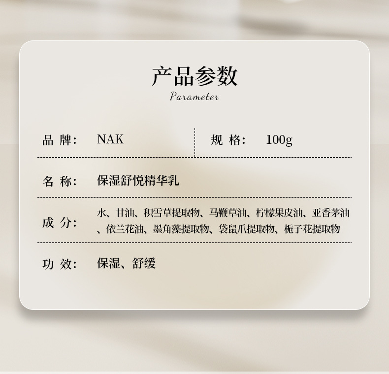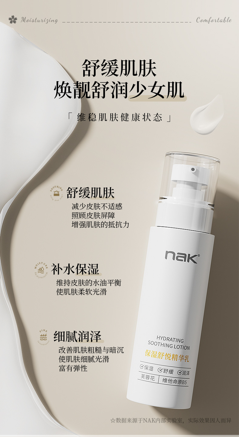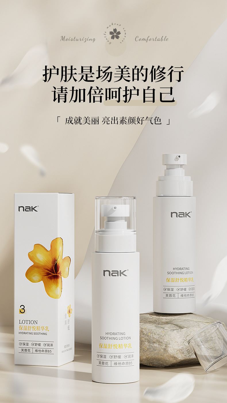 商品属性 [产品名称] nak精华乳 [产地] 广东 [保质期] 3年 [化妆品功效] 控油,补水保湿,滋润 [品牌类型] 国货品牌 [是否跨境出口专供货源] 否 [是否进口] 否 [特殊用途化妆品] 否 [生产许可证号] 粤妆20160666 [适用人群] 普通人群 [适用肤质] 中性,油性,干性 [非特化妆品备案证号] 粤G妆网备字2024356652
