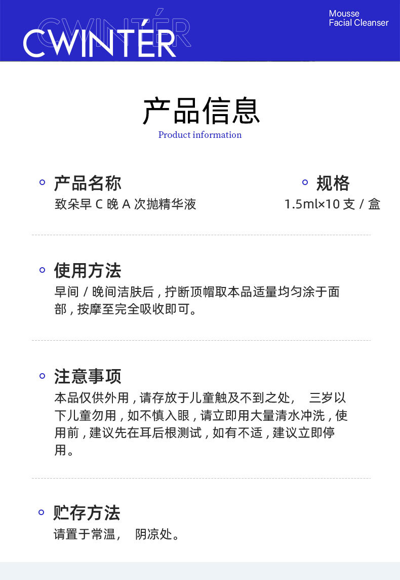 商品属性 [产品名称] 致朵早C晚A次抛精华液1.5mlx5支+1.5mlx5支 [产地] 广州 [保质期] 3年 [包装种类] 基础包装 [化妆品功效] 其他功效 [品牌类型] 国货品牌 [是否进口] 否 [特殊用途化妆品] 否 [质地] 精华 [适用人群] 12296823 [适用肤质] 中性 [非特化妆品备案证号] 粤G妆网备字2023394437