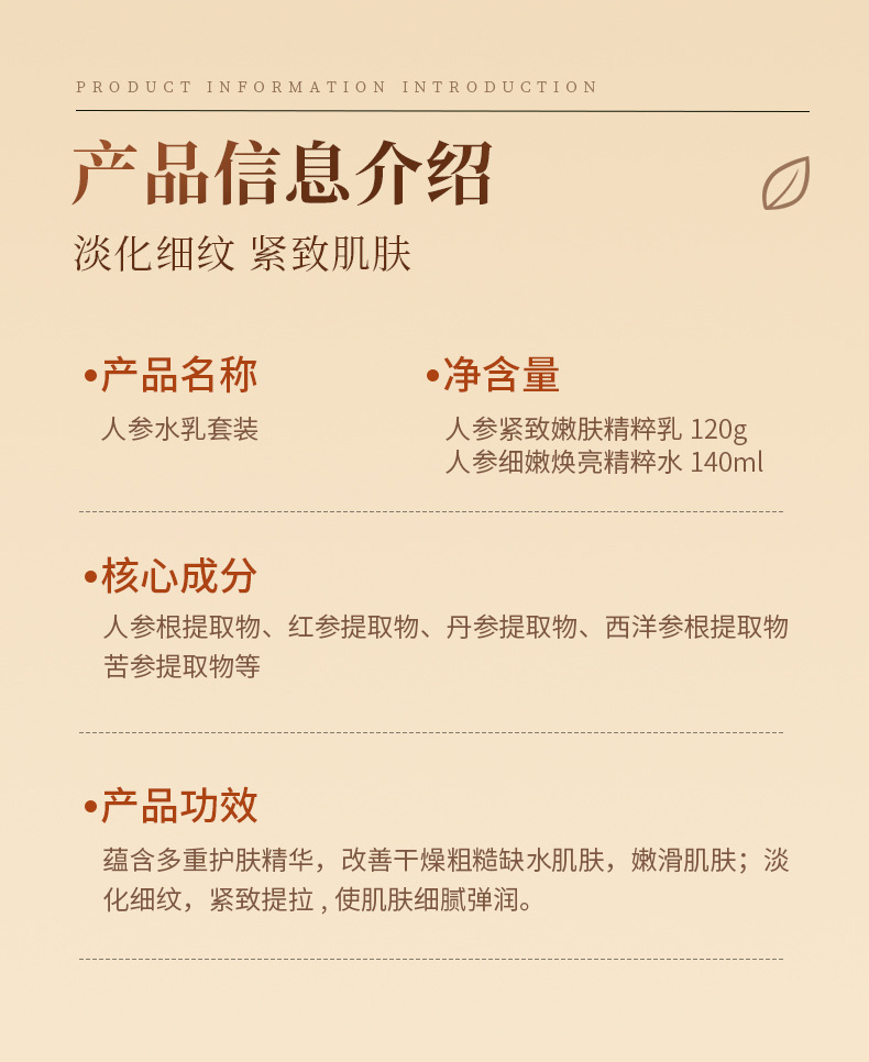商品属性 [产品名称] 默认项 [产地] 广东 [保质期] 18个月 [化妆品功效] 提亮肤色,滋润,紧致 [品牌类型] OEM [是否跨境出口专供货源] 否 [是否进口] 否 [特妆产品名称] 人参细嫩焕亮精粹水 [特殊用途化妆品] 否 [生产许可证号] 粤妆20160994 [适用人群] 女士 [适用肤质] 中性,通用,油性,干性,敏感性,混合性 [非特化妆品备案证号] 粤G妆网备字2022052756