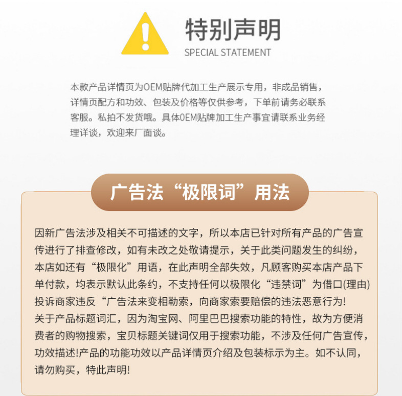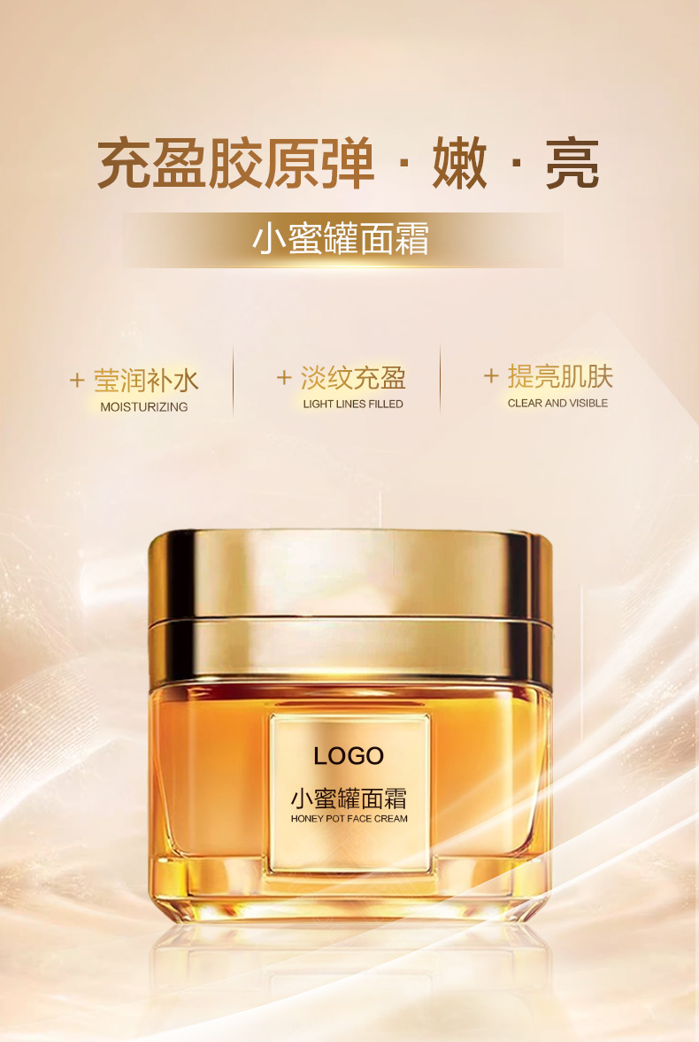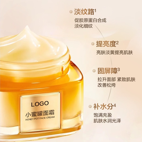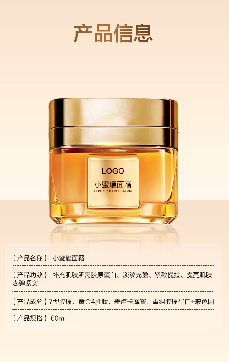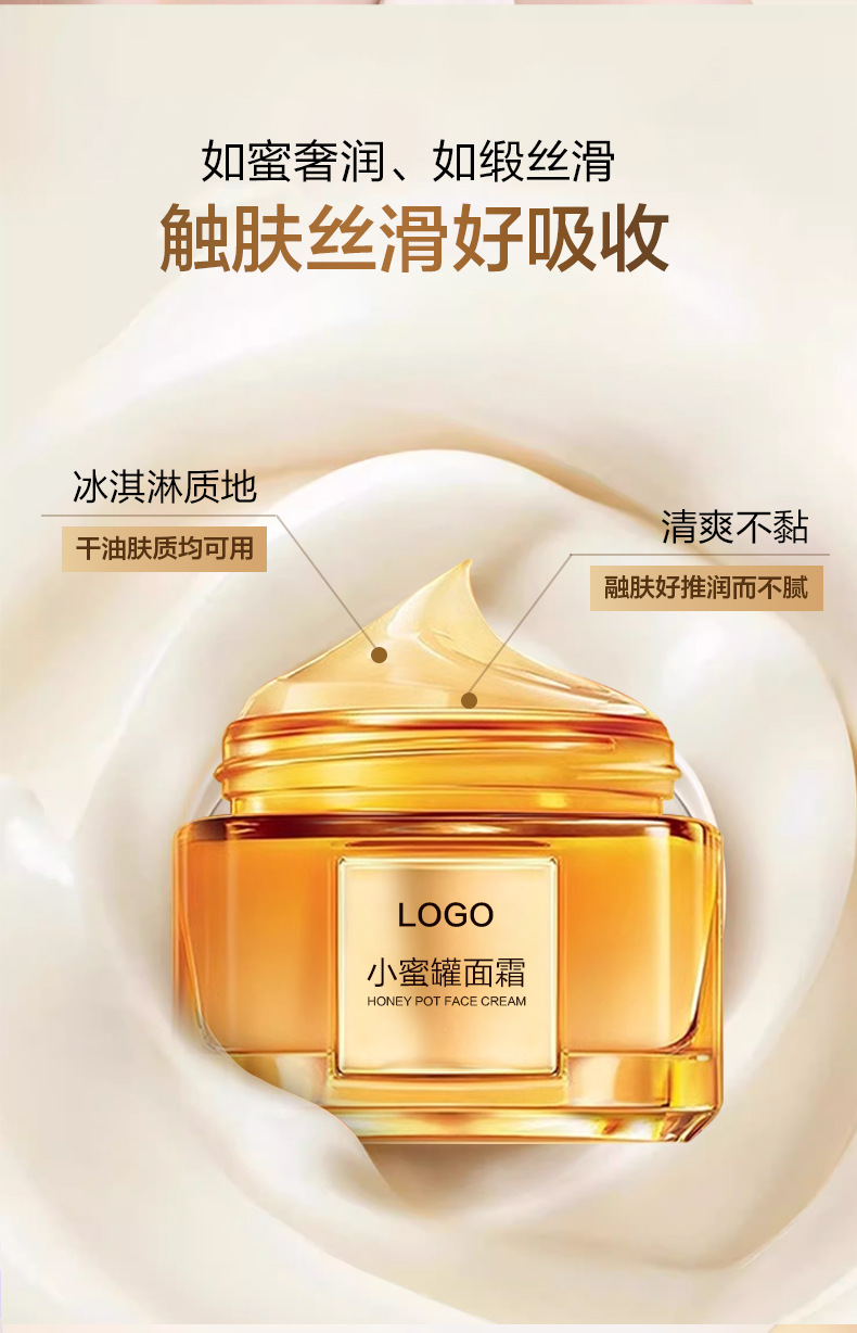 商品属性 [产品名称] 小蜜罐滋润面霜 [产地] 广州 [保质期] 3年 [其他] 抗皱紧致面霜 [化妆品功效] 补水保湿,提亮肤色,柔润肌肤 [品牌类型] OEM [是否跨境出口专供货源] 否 [是否进口] 否 [特妆产品名称] 面霜代加工 [特殊用途化妆品] 否 [生产许可证号] 粤妆2022129114 [适用人群] 女士 [适用肤质] 通用 [非特化妆品备案证号] 粤G妆网备字2022129114