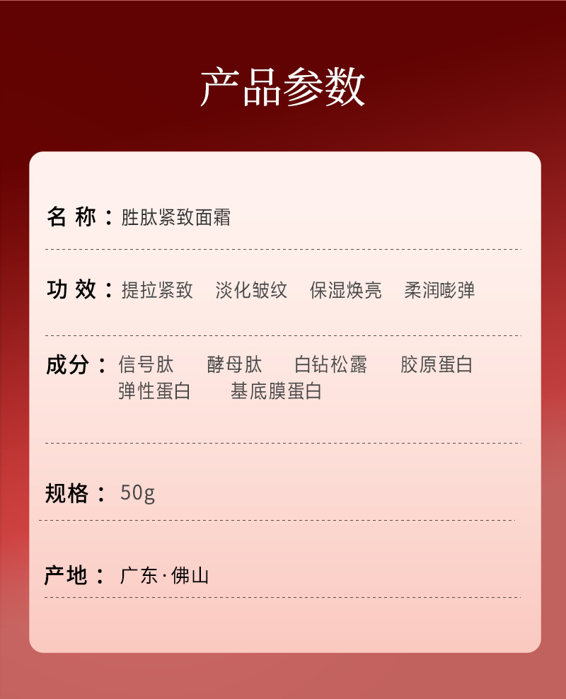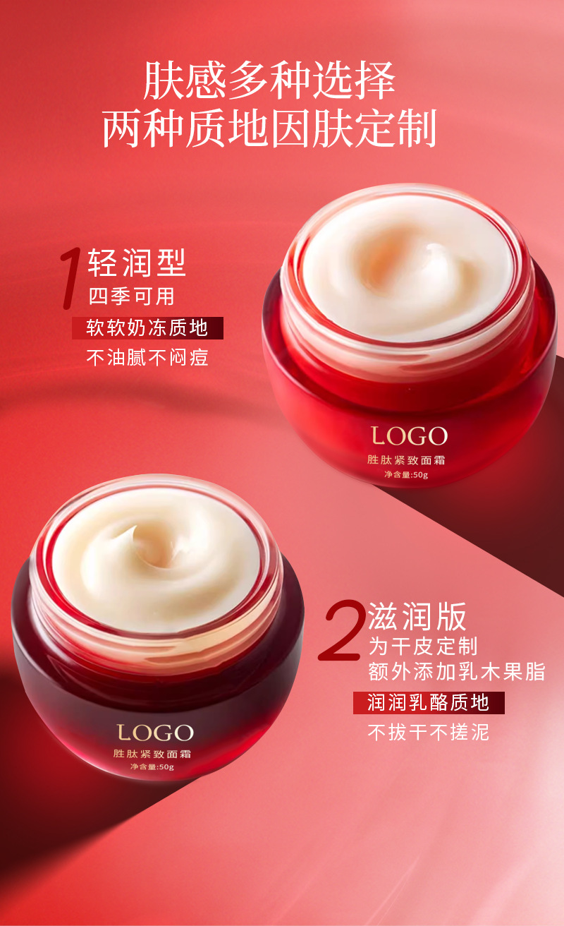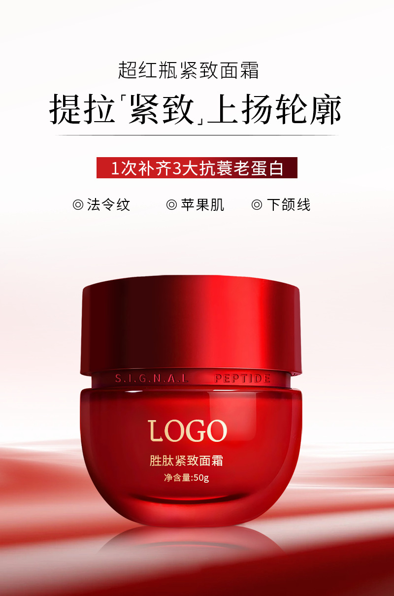 商品属性 [主要下游平台] wish,速卖通,独立站,LAZADA,其他 [主要销售地区] 南美,东南亚,北美,东北亚,中东,其他 [产品名称] 超红瓶多肽紧致霜代加工 [产地] 广州 [保质期] 3年 [化妆品功效] 补水保湿,提亮肤色,晒后修护,滋润,紧致 [品牌类型] OEM [是否跨境出口专供货源] 是 [是否进口] 否 [有可授权的自有品牌] 是 [特妆产品名称] 抗皱面霜OEM [特殊用途化妆品] 否 [生产许可证号] 20220015 [适用人群] 女士 [适用肤质] 中性,通用,油性,干性,敏感性,混合性 [非特化妆品备案证号] 粤G妆网备字2022129114