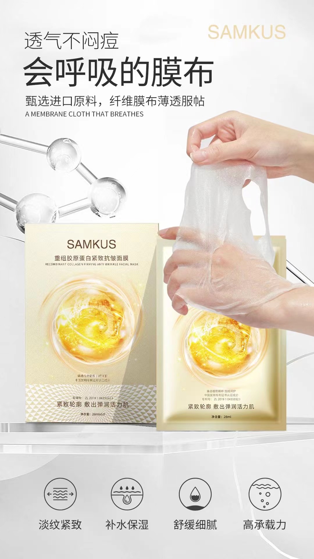 商品属性 [产品名称] 重组胶原蛋白紧致抗皱面膜 [产地] 广州 [保质期] 3年 [化妆品功效] 补水保湿,紧致 [品牌类型] 国货品牌 [是否跨境出口专供货源] 否 [是否进口] 否 [特殊用途化妆品] 否 [生产许可证号] 粤妆20160905 [适用人群] 女士 [适用肤质] 油性,干性,敏感性,混合性 [非特化妆品备案证号] 粤G妆网备字2023287386