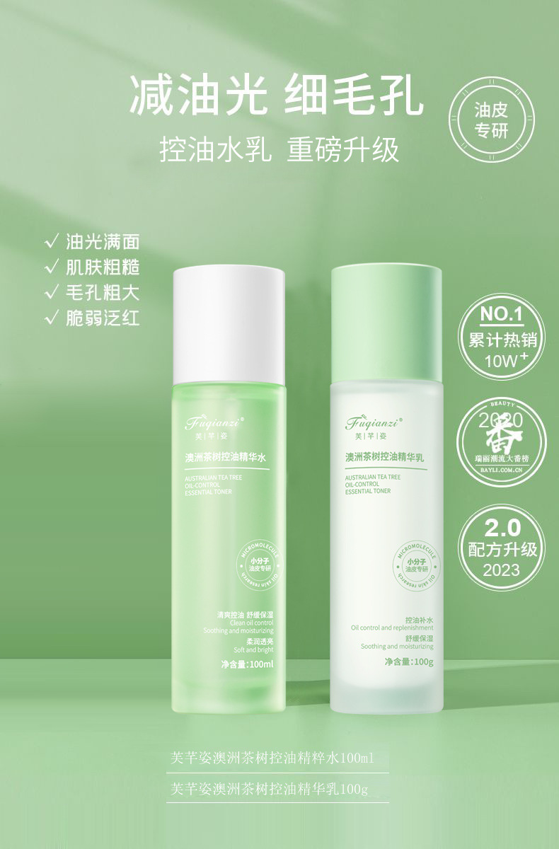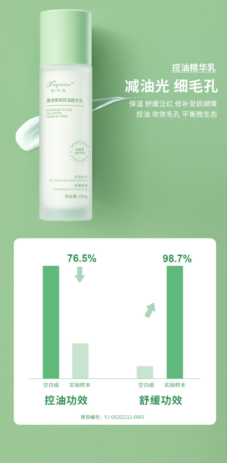 商品属性 [主要下游平台] 亚马逊,wish,速卖通,独立站,LAZADA [主要销售地区] 非洲,南美 [产品名称] 澳洲茶树控油精华乳 [产地] 广州 [保质期] 3年 [化妆品功效] 控油,滋润,深层清洁,舒缓肌肤,柔润肌肤 [品牌类型] 国货品牌 [是否跨境出口专供货源] 是 [是否进口] 否 [有可授权的自有品牌] 是 [特妆产品名称] 澳洲茶树控油精华水 [特殊用途化妆品] 否 [生产许可证号] 粤妆20220114 [适用人群] 通用 [适用肤质] 中性,通用,油性,干性,敏感性,混合性 [非特化妆品备案证号] 粤G妆网备字2018159753