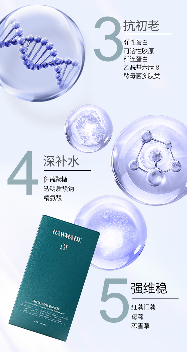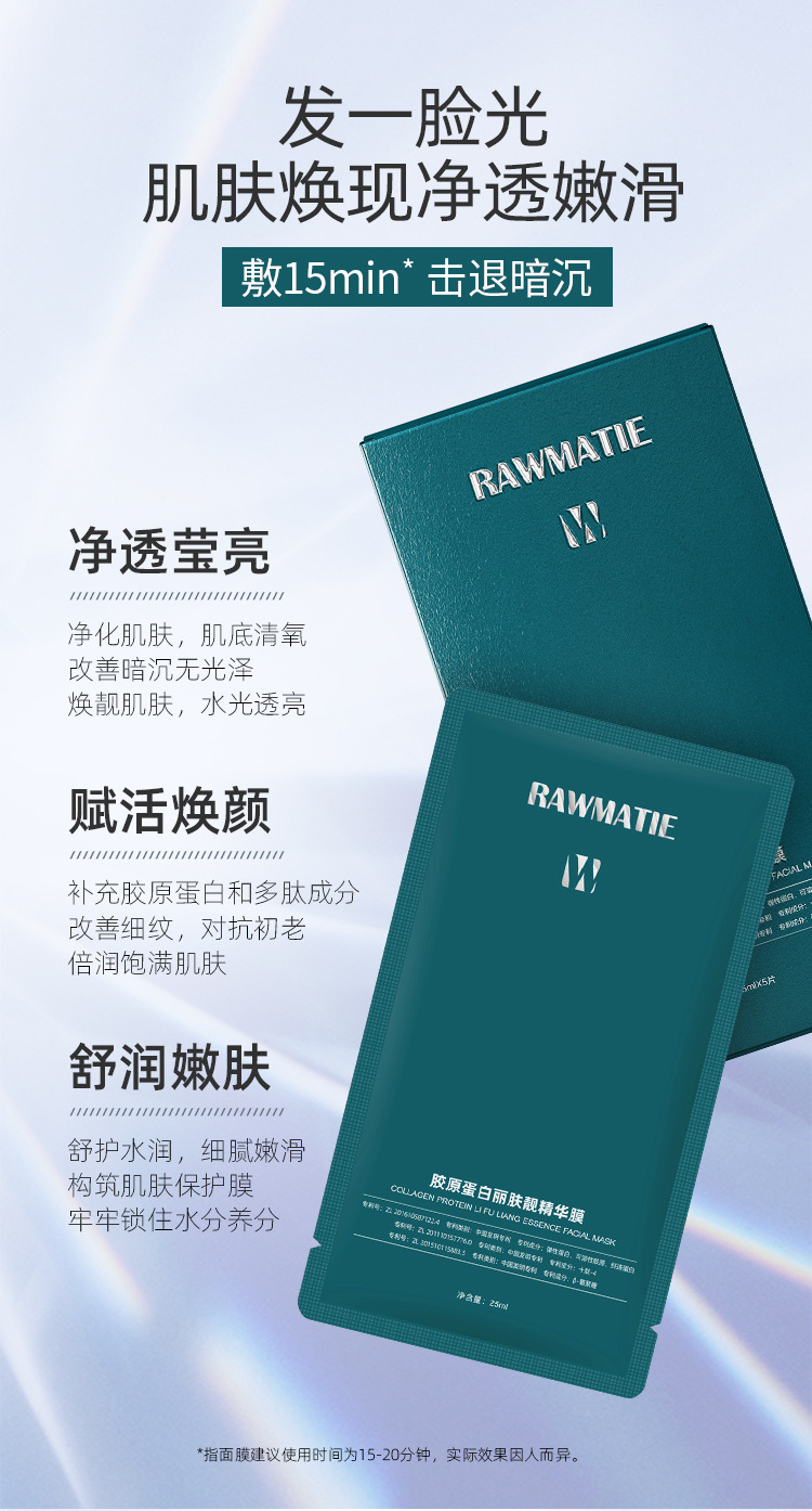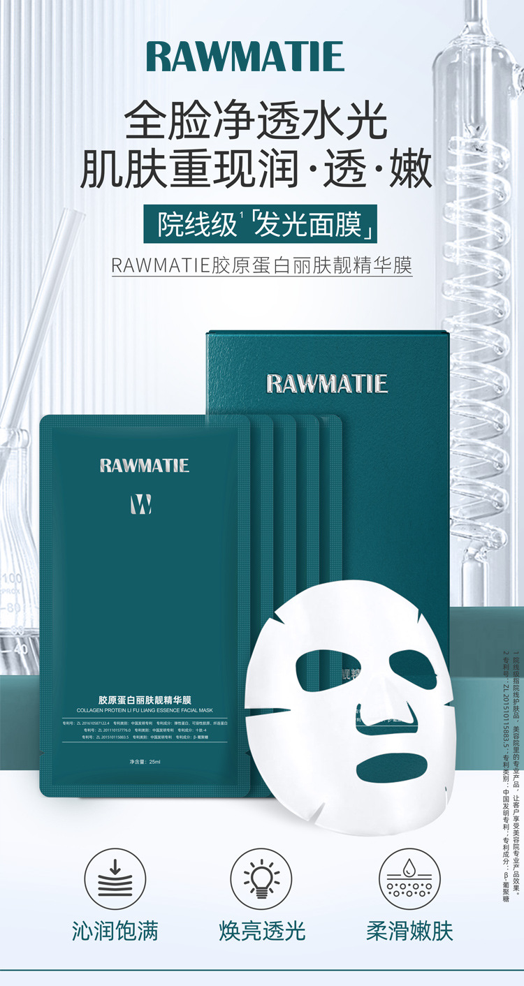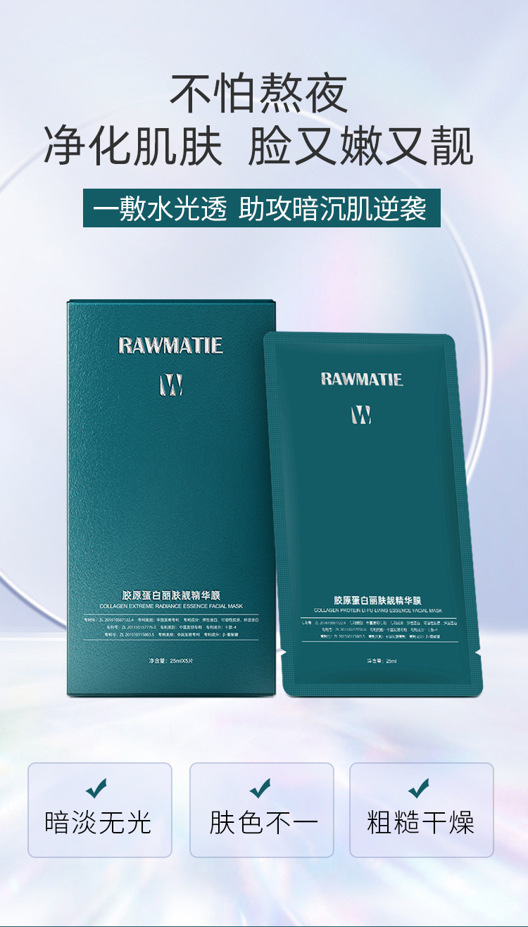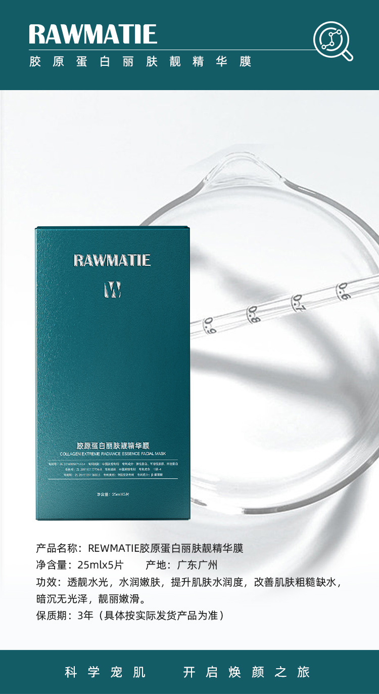 商品属性 [产品名称] RAWMATIE胶原蛋白丽肤靓精华膜 [产地] 广州 [保质期] 3年 [化妆品功效] 其他功效,补水保湿,紧致 [品牌类型] 国货品牌 [是否跨境出口专供货源] 否 [是否进口] 否 [特殊用途化妆品] 否 [生产许可证号] 粤妆20160248 [适用人群] 普通人群 [适用肤质] 通用 [非特化妆品备案证号] 粤G妆网备字2024257506