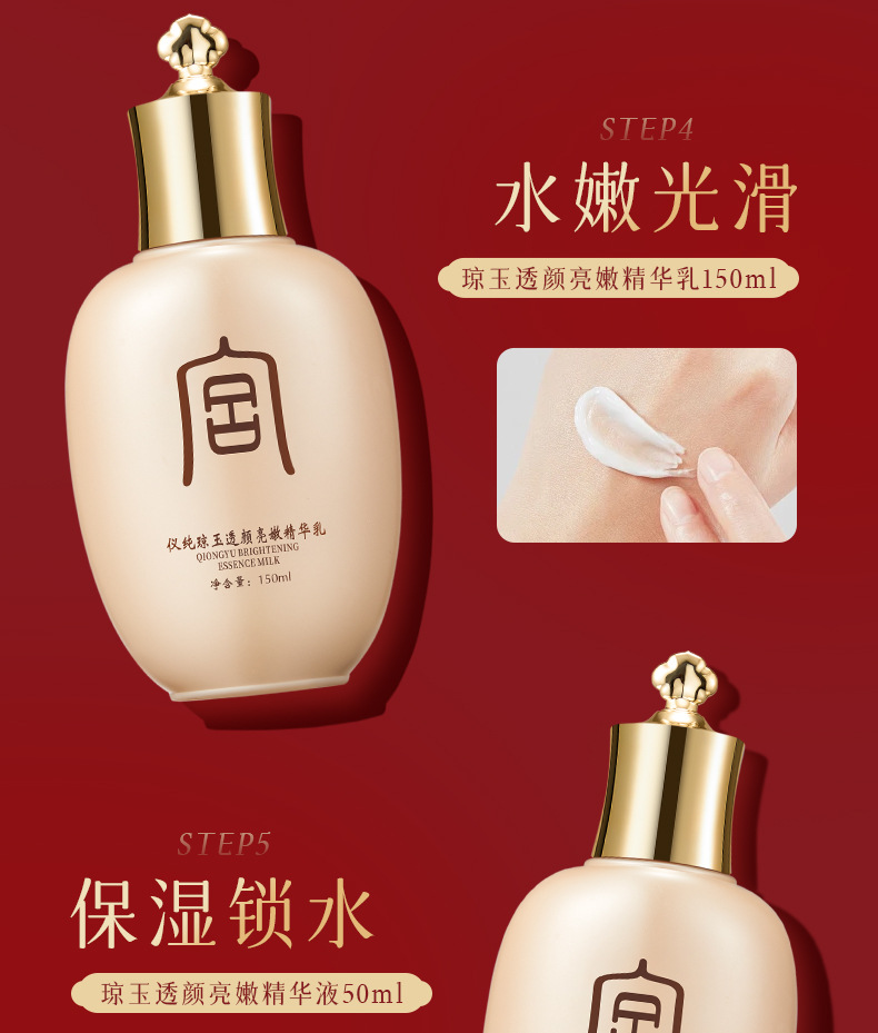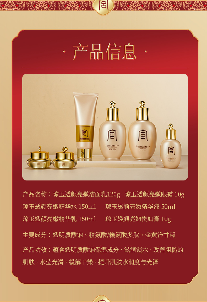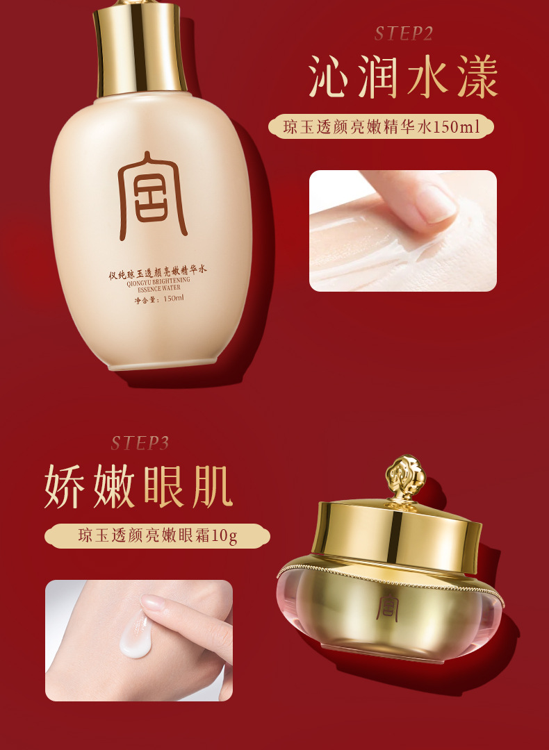 商品属性 [产品名称] 仪纯琼玉透颜亮嫩尊享套盒护肤礼盒 [产地] 广东 [保质期] 3年 [化妆品功效] 提亮肤色,滋润,柔润肌肤 [品牌类型] 精品国货 [是否跨境出口专供货源] 否 [是否进口] 否 [特妆产品名称] 仪纯琼玉透颜亮嫩尊享套盒护肤礼盒 [特殊用途化妆品] 否 [生产许可证号] 粤妆20200020 [适用人群] 女士,男士 [适用肤质] 中性,油性,干性,混合性 [非特化妆品备案证号] 粤G妆网备字2023241377
