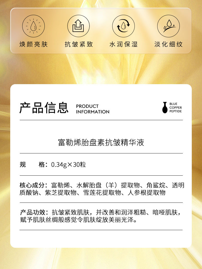 商品属性 [产品名称] 富勒烯胎盘素抗皱精华液 [产地] 广东 [保质期] 3年 [包装种类] 基础包装 [化妆品功效] 补水保湿,提亮肤色,滋润,紧致,柔润肌肤 [品牌类型] 国货品牌 [是否跨境出口专供货源] 否 [是否进口] 否 [特殊用途化妆品] 否 [生产许可证号] 粤妆20160601 [质地] 精华 [适用人群] 通用 [适用肤质] 通用 [非特化妆品备案证号] 粤G妆网备字2023070255