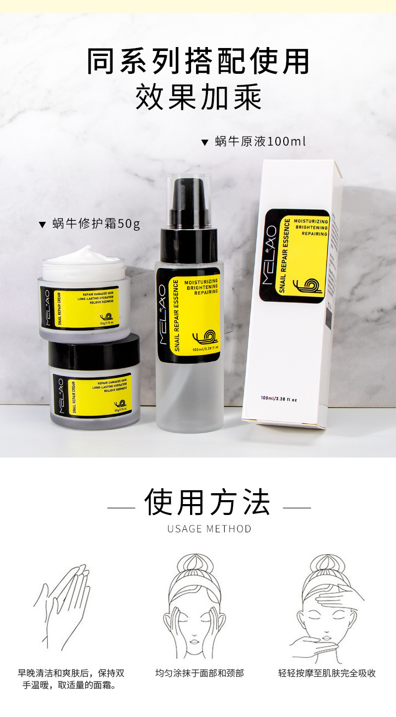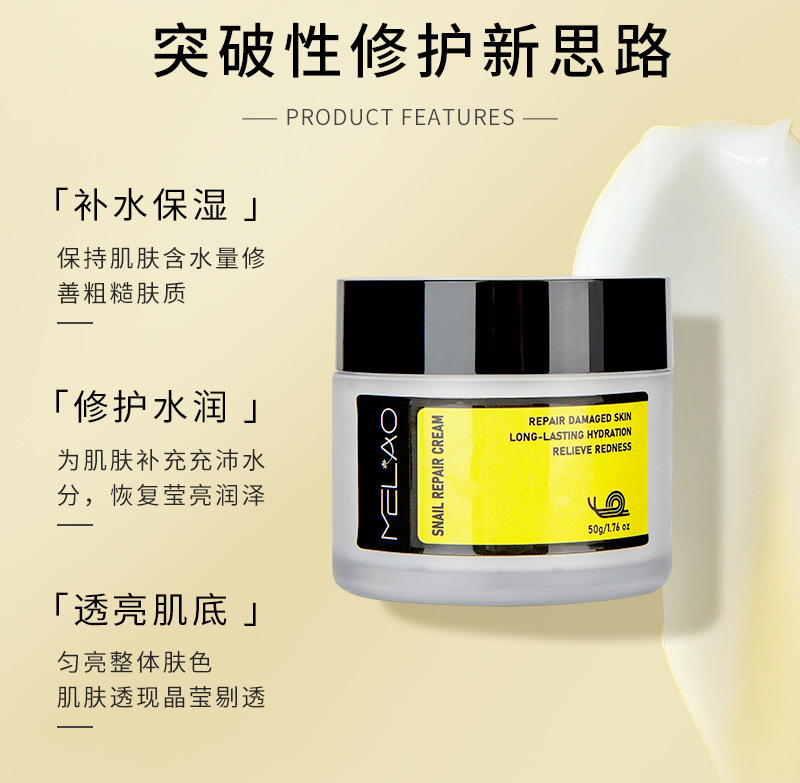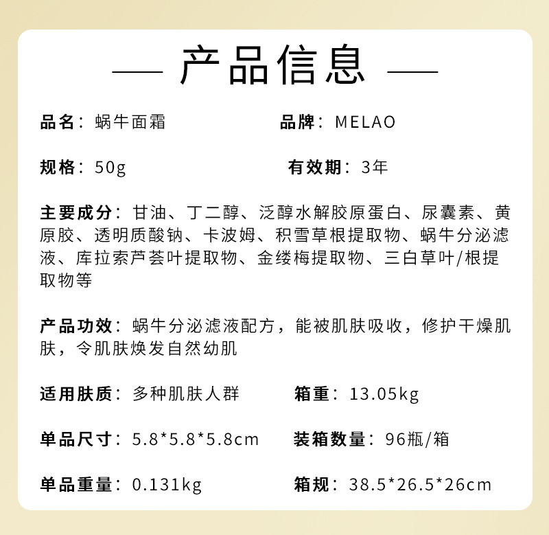 商品属性 [主要下游平台] ebay,亚马逊,wish,速卖通,独立站,LAZADA [主要销售地区] 非洲,欧洲,南美,东南亚,北美,东北亚,中东,其他 [乳液/面霜品类] 其他 [产品名称] MELAO蜗牛霜 [产地] 广州 [保质期] 无 [化妆品功效] 补水保湿,提亮肤色,滋润,紧致,柔润肌肤 [品牌类型] OEM [成分原料] 莱姆 [是否跨境出口专供货源] 是 [是否进口] 否 [有可授权的自有品牌] 是 [特殊用途化妆品] 否 [生产许可证号] 粤妆20160647 [适用人群] 通用 [适用肤质] 中性,通用,油性,干性,混合性 [防晒指数] 其他 [非特化妆品备案证号] 粤G妆网备字2024033176