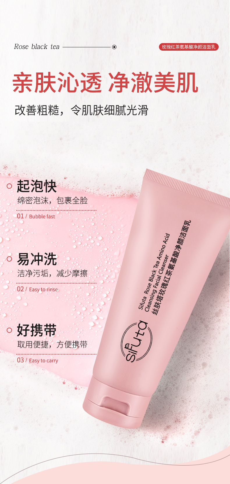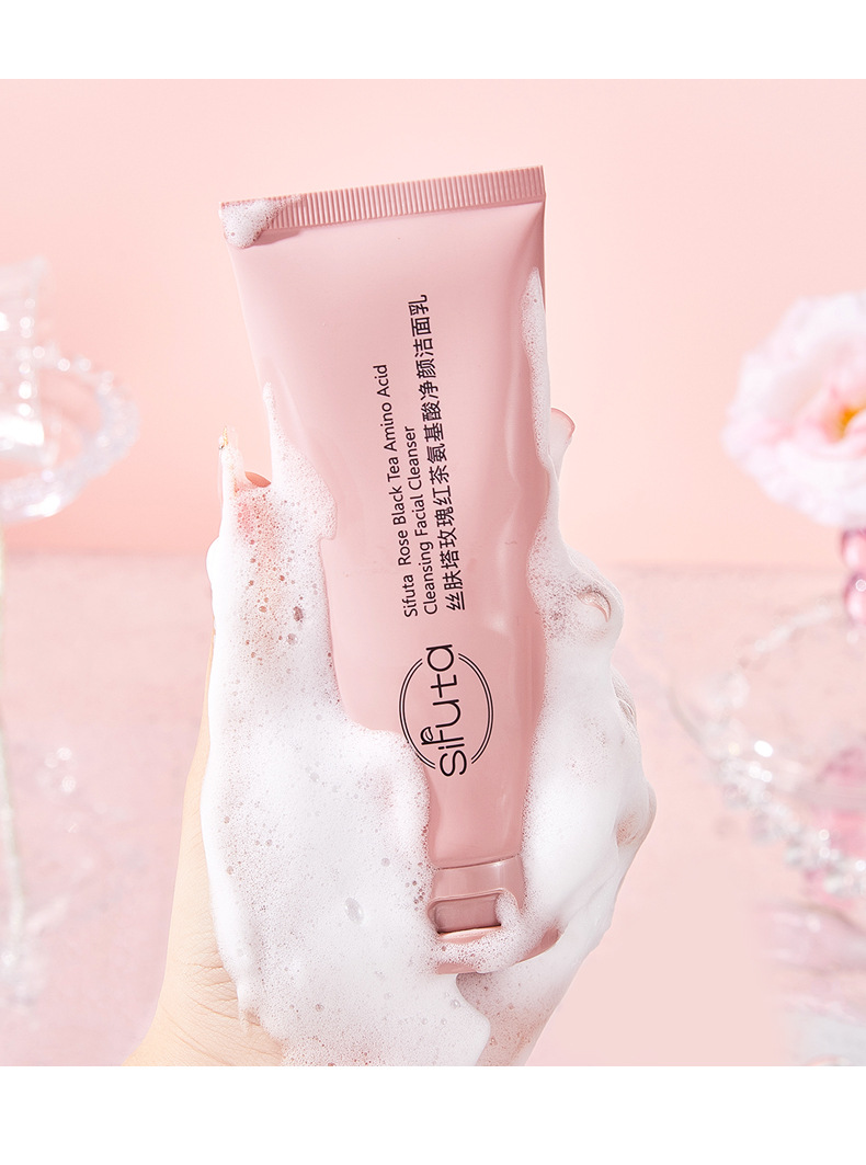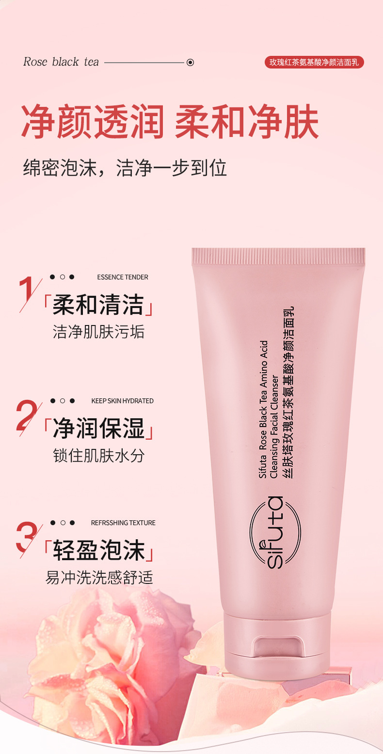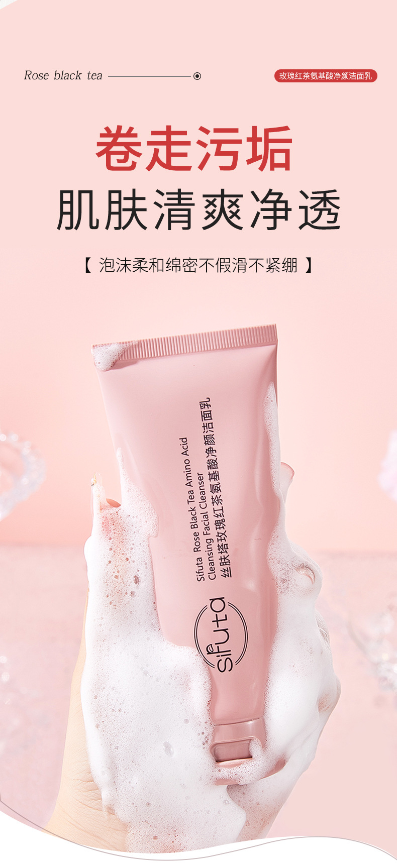 商品属性 [产品名称] sifuta丝肤塔玫瑰红茶氨基酸净颜洁面乳 [产地] 汕头 [保质期] 18个月 [化妆品功效] 去黑头,深层清洁,舒缓肌肤,柔润肌肤 [品牌类型] OEM [成分] 水 [是否跨境出口专供货源] 否 [是否进口] 否 [特殊用途化妆品] 否 [生产许可证号] 参照包装 [起泡程度] 泡沫洁面 [适用人群] 通用 [适用肤质] 通用 [非特化妆品备案证号] 粤G妆网备字2024061033