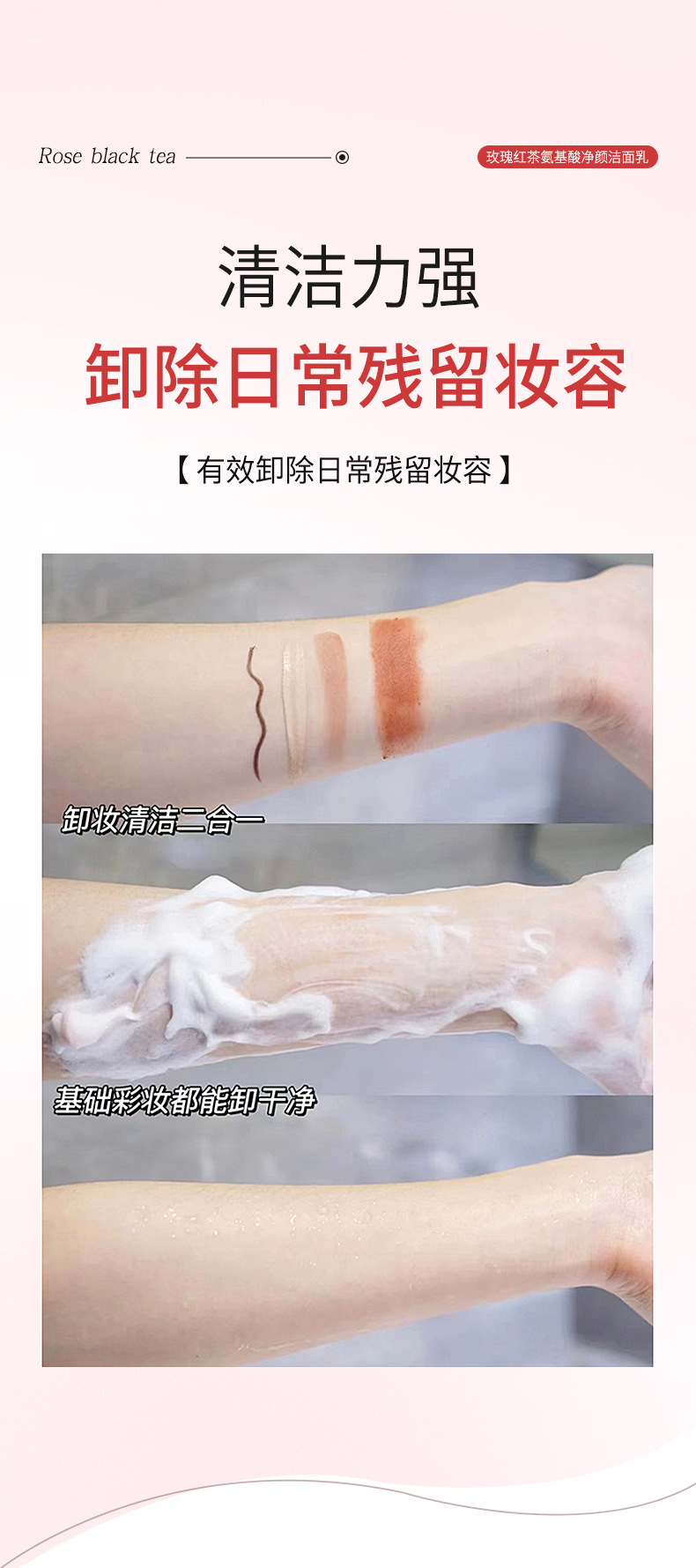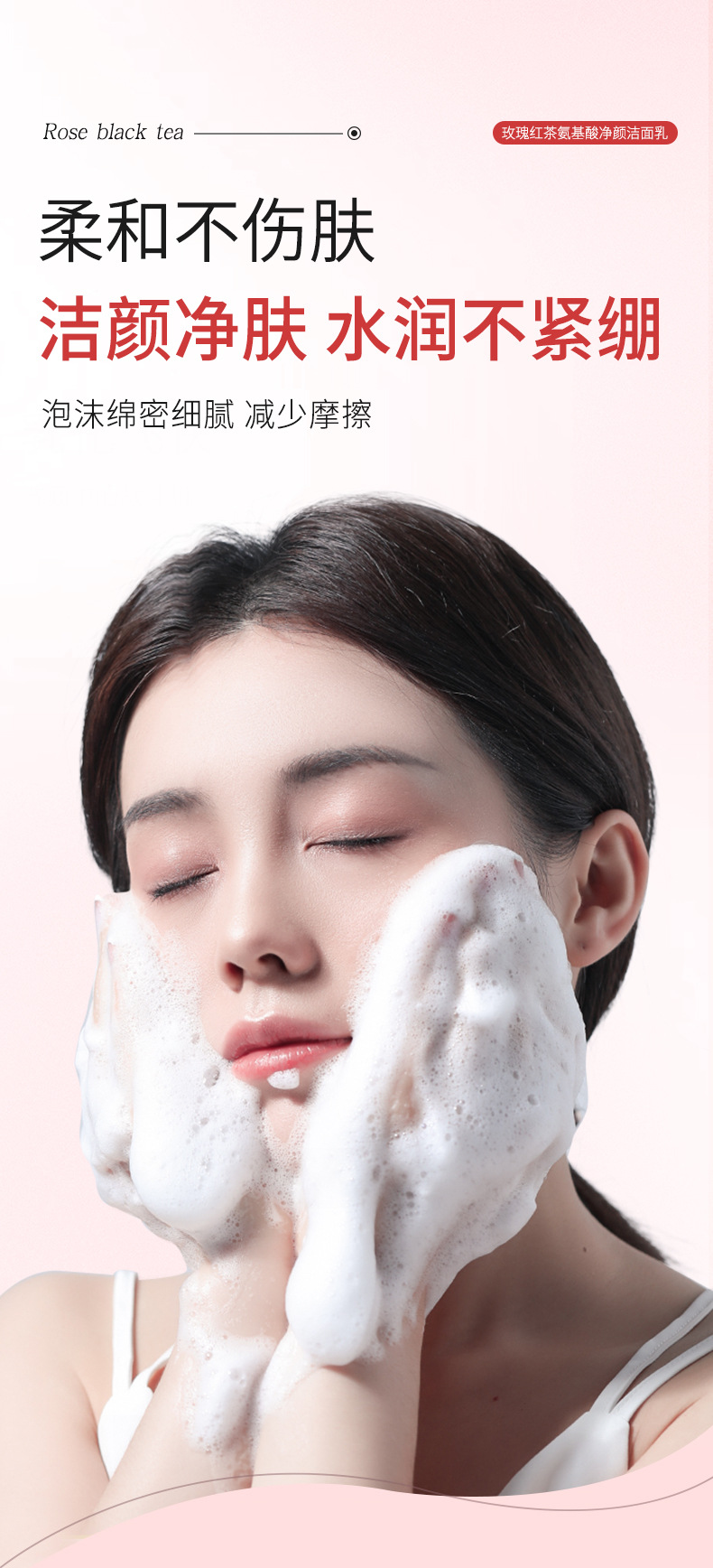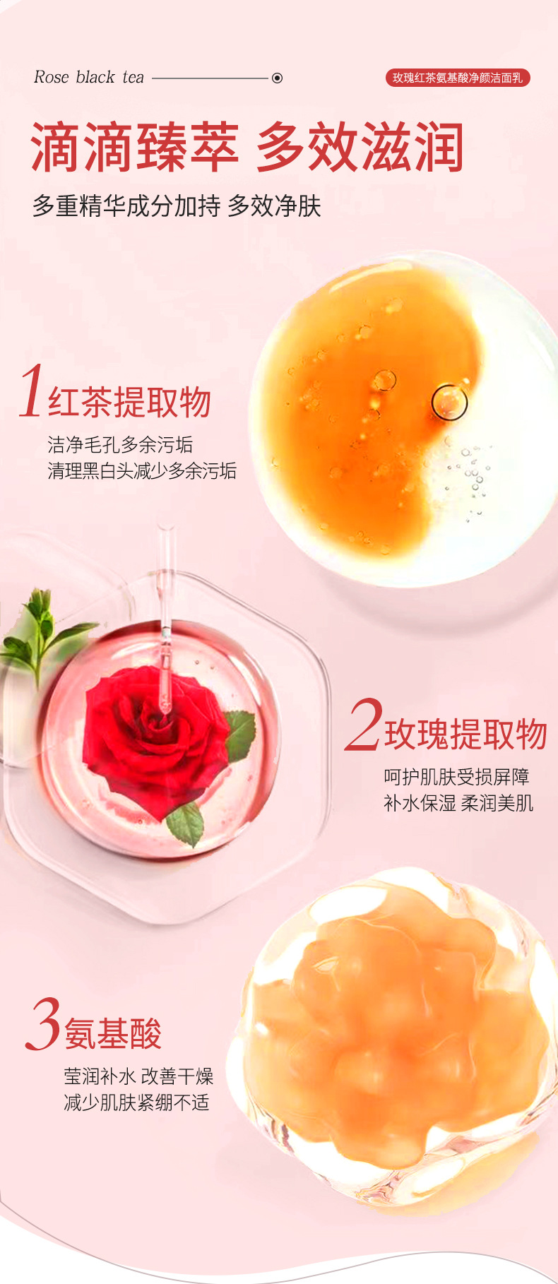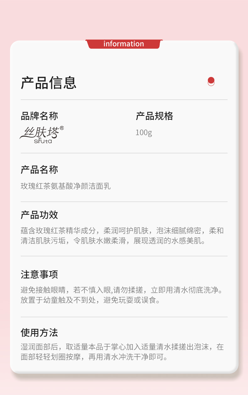 商品属性 [产品名称] sifuta丝肤塔玫瑰红茶氨基酸净颜洁面乳 [产地] 汕头 [保质期] 18个月 [化妆品功效] 去黑头,深层清洁,舒缓肌肤,柔润肌肤 [品牌类型] OEM [成分] 水 [是否跨境出口专供货源] 否 [是否进口] 否 [特殊用途化妆品] 否 [生产许可证号] 参照包装 [起泡程度] 泡沫洁面 [适用人群] 通用 [适用肤质] 通用 [非特化妆品备案证号] 粤G妆网备字2024061033