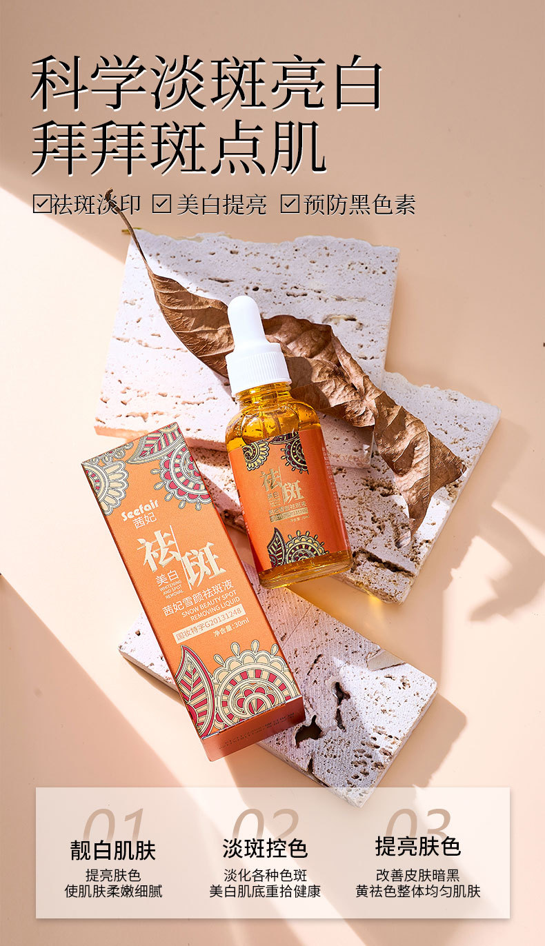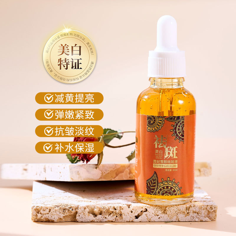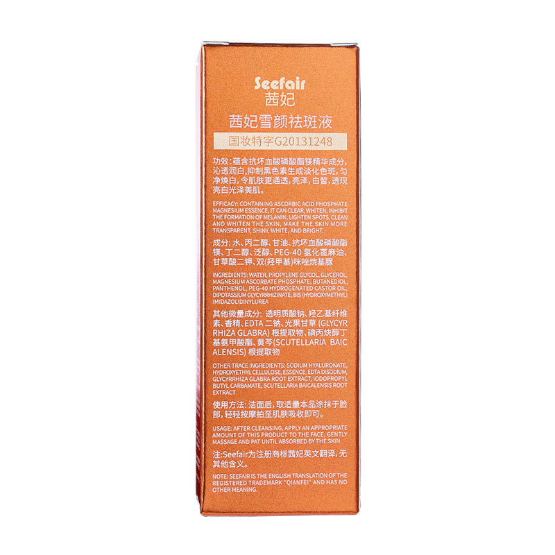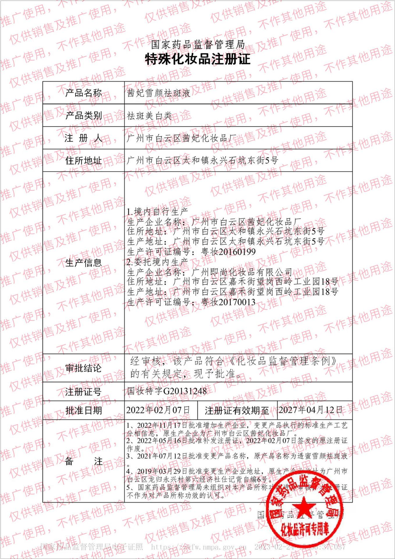 商品属性 [产品名称] 茜妃雪颜祛斑液 [产地] 广州 [保质期] 3年 [化妆品功效] 美白,提亮肤色,祛斑 [品牌类型] 国货品牌 [是否进口] 否 [特妆产品名称] 茜妃雪颜祛斑液 [特殊用途化妆品] 是 [特殊用途化妆品证号] 国妆特字G20131248 [生产许可证号] 粤妆20170013 [适用人群] 普通人群 [适用肤质] 通用