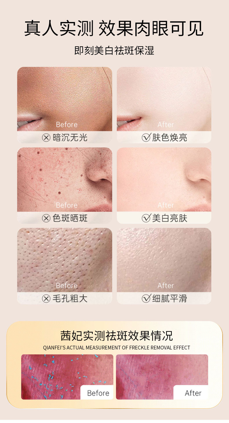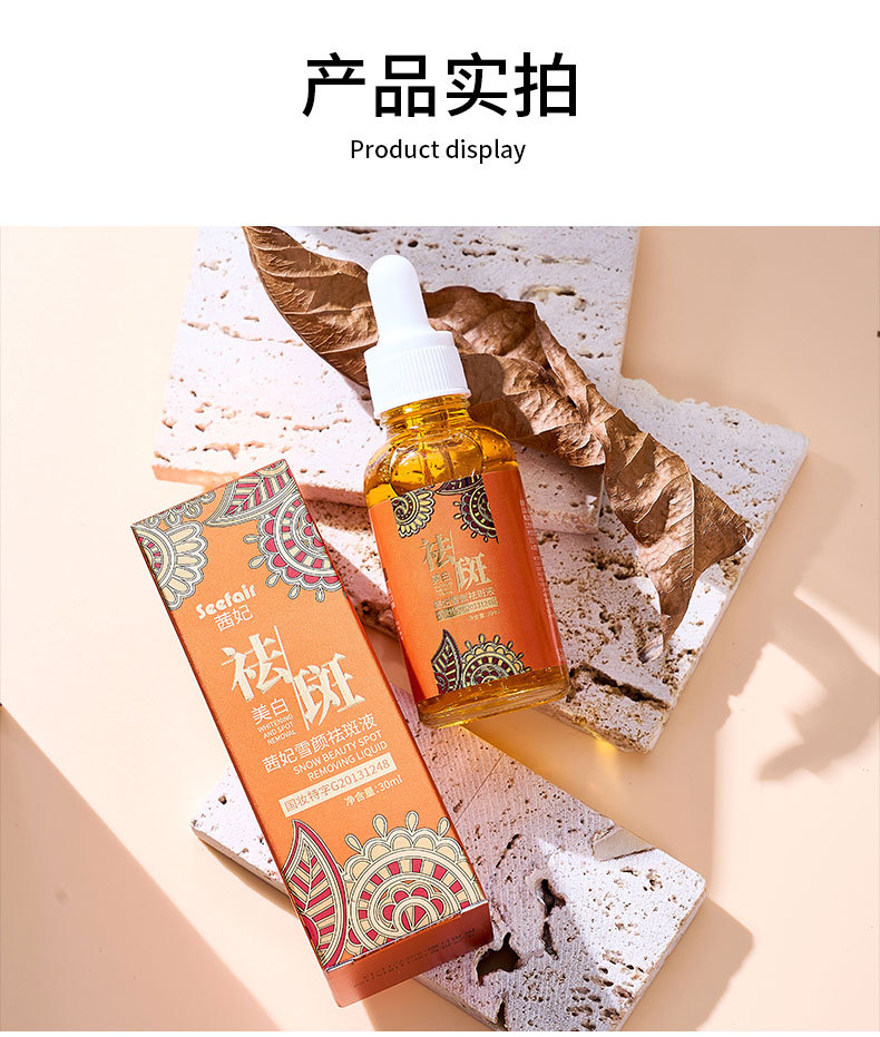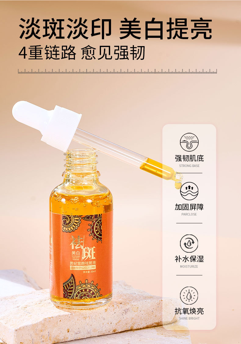 商品属性 [产品名称] 茜妃雪颜祛斑液 [产地] 广州 [保质期] 3年 [化妆品功效] 美白,提亮肤色,祛斑 [品牌类型] 国货品牌 [是否进口] 否 [特妆产品名称] 茜妃雪颜祛斑液 [特殊用途化妆品] 是 [特殊用途化妆品证号] 国妆特字G20131248 [生产许可证号] 粤妆20170013 [适用人群] 普通人群 [适用肤质] 通用