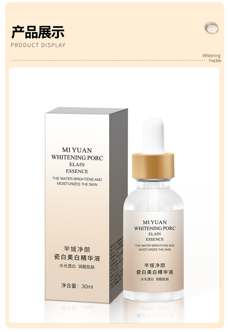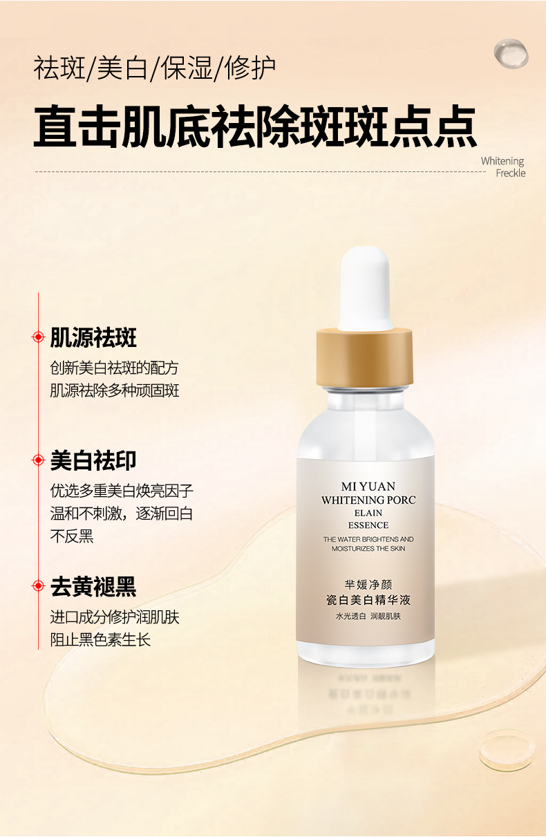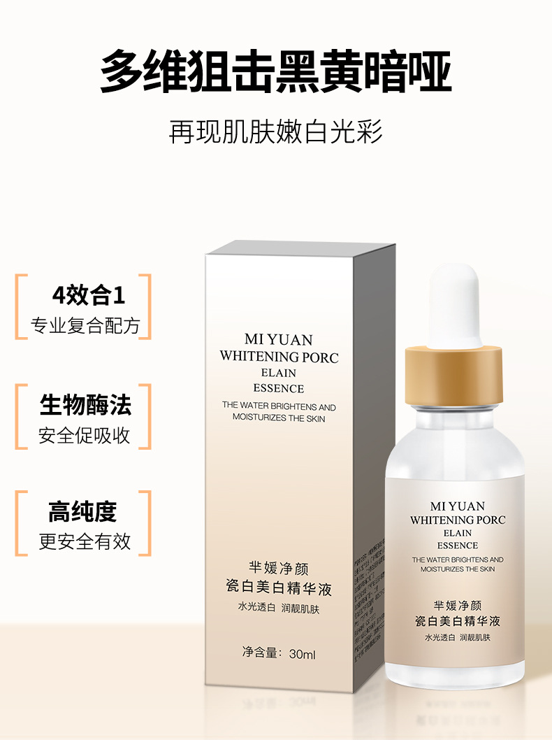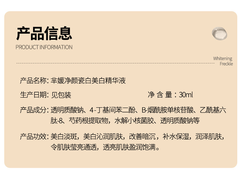 商品属性 [产品名称] 芈媛净颜美白精华液 [产地] 广州 [保质期] 3年 [化妆品功效] 美白,补水保湿,祛斑 [品牌类型] 国货品牌 [是否跨境出口专供货源] 否 [是否进口] 否 [特殊用途化妆品] 是 [特殊用途化妆品证号] 国妆特字G20212258 [生产许可证号] 粤妆20170597 [适用人群] 通用 [适用肤质] 通用