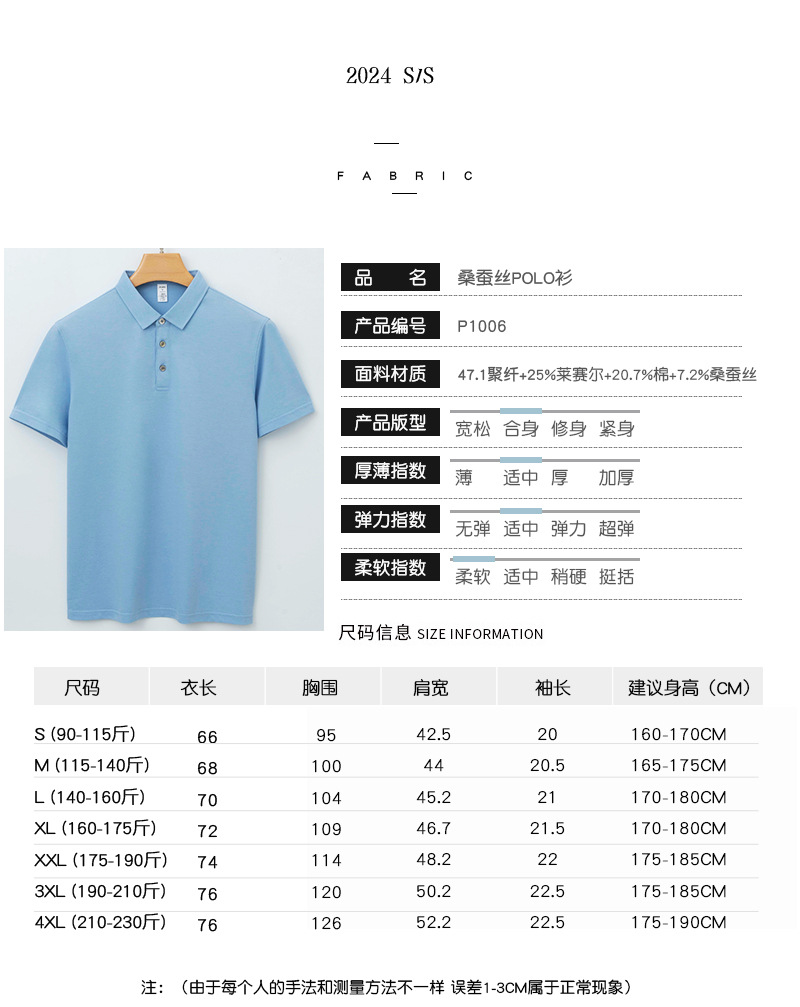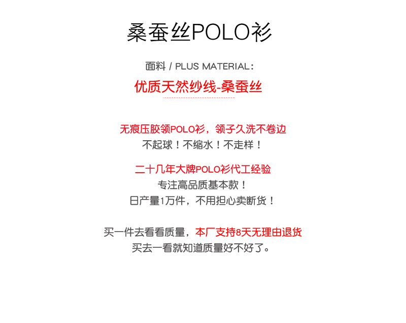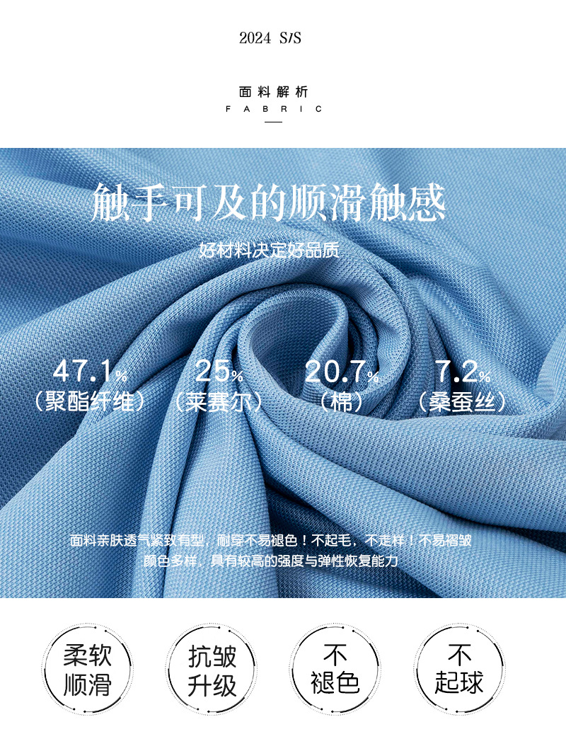 商品属性 [上市年份/季节] 2024年春季 [主面料成分] 桑蚕丝 [主面料成分的含量] 7.2 [厚薄] 普通 [原创设计货源] 是 [图案] 纯色 [是否跨境出口专供货源] 否 [有无质检报告] 否 [材质功能] 其他 [淘货类别] 时尚都市(24-35岁) [版型] 合体型 [特殊工艺] 桑蚕丝 [袖长] 短袖 [货源类别] 现货 [质检报告编号] ZLPJ24069483A [适合季节] 四季 [适用场景] 休闲 [面料名称] 桑蚕丝珠地 [风格] 简约
