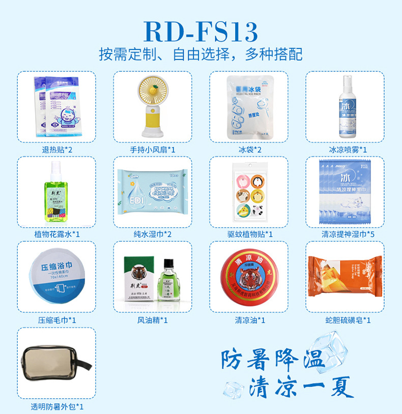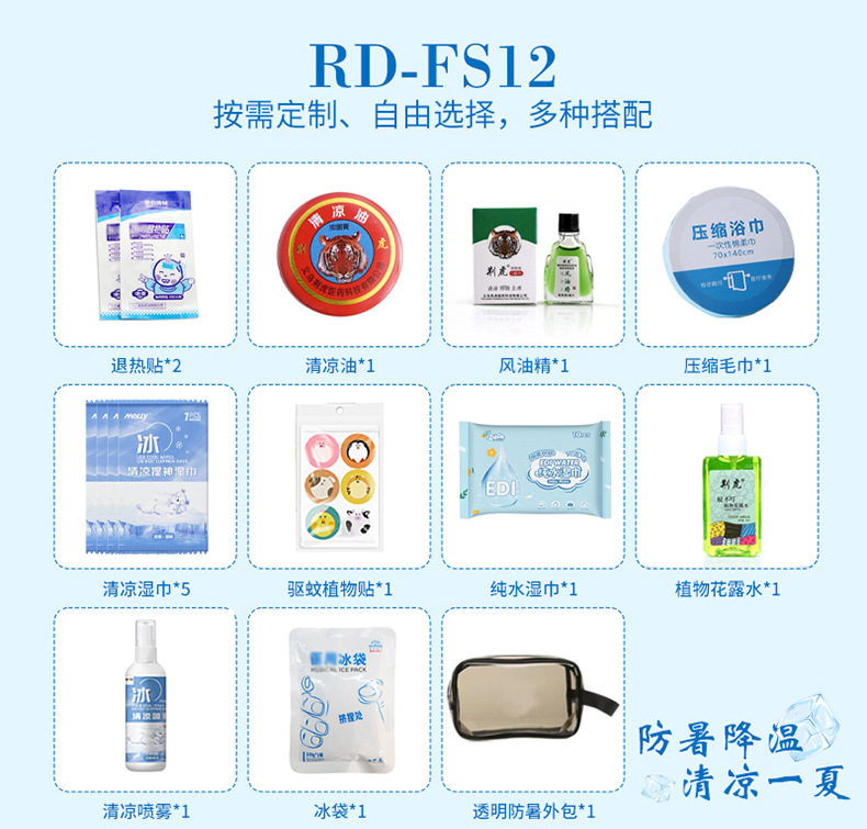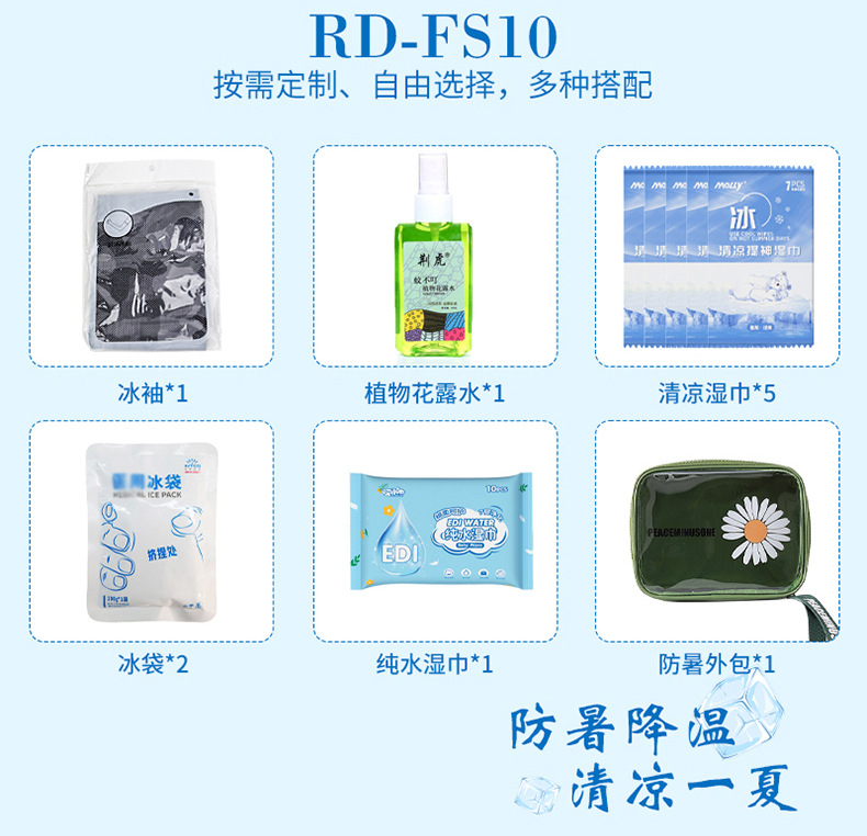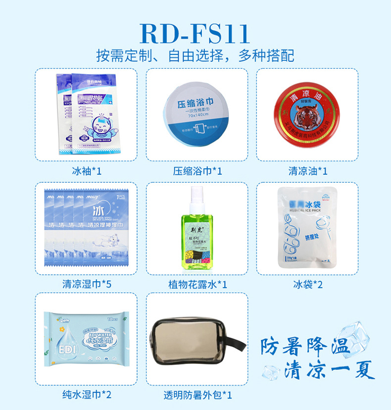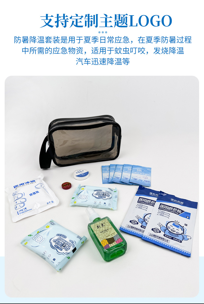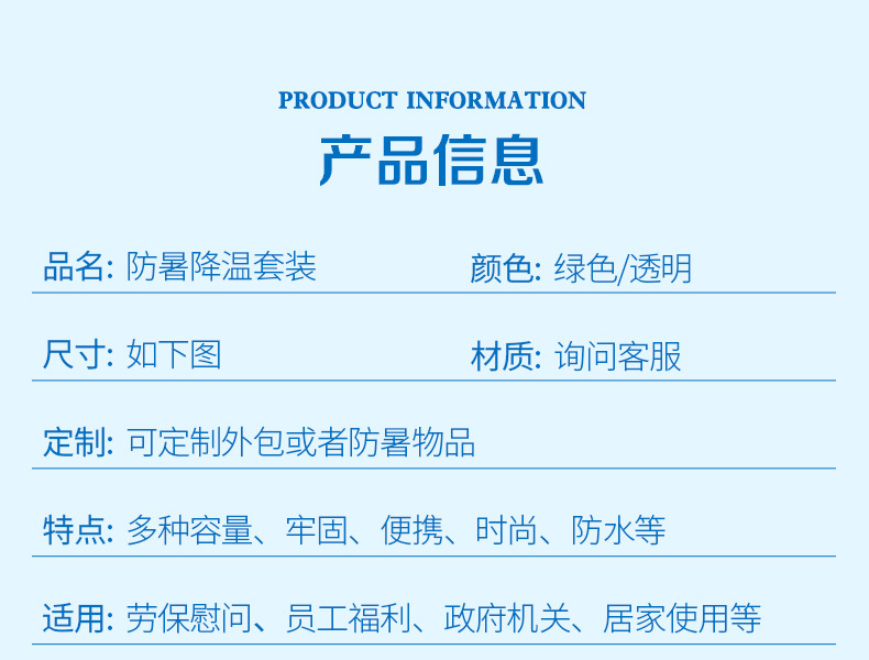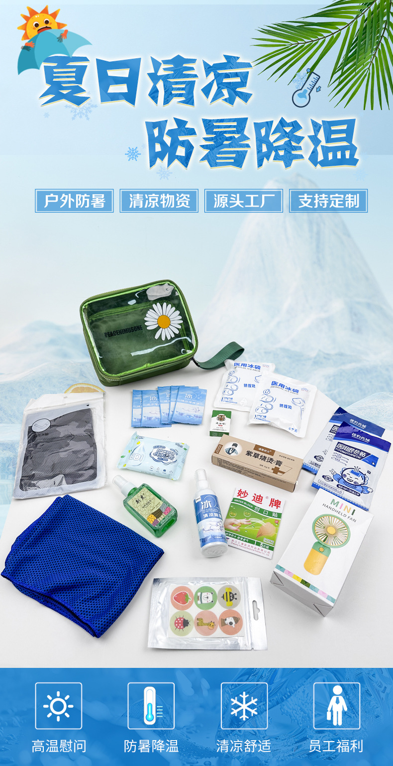 商品属性 [夏季清凉降温包] 夏季防暑降温包员工劳保福利高温慰问清凉礼包户外便携防暑包套装 [是否IP授权] 否 [是否专利货源] 否 [是否属于礼品] 是,商务礼品 [材质] 塑料 [类别] 商务礼品套装 [送礼用途] 积分换购礼品,商务礼品,广告礼品,促销赠品,会议礼品,福利礼品,节庆礼品,嘉奖纪念,公关礼品 [风格] 现代简约