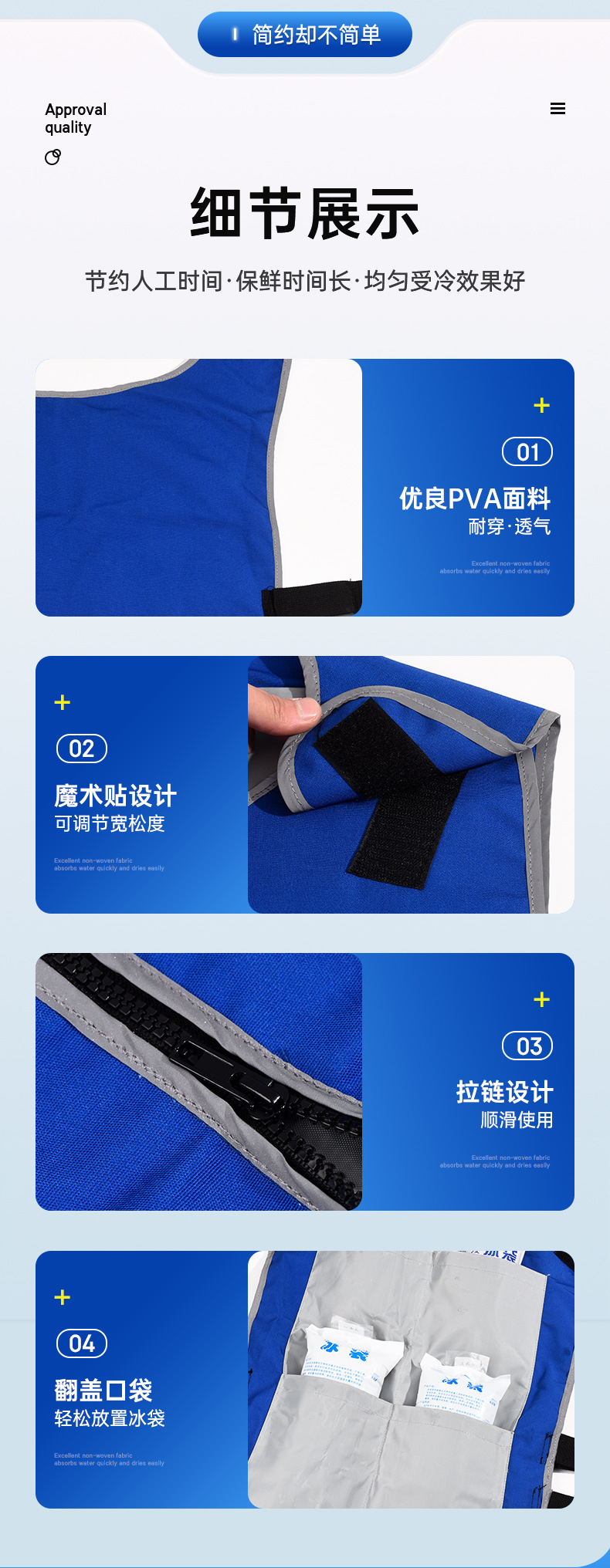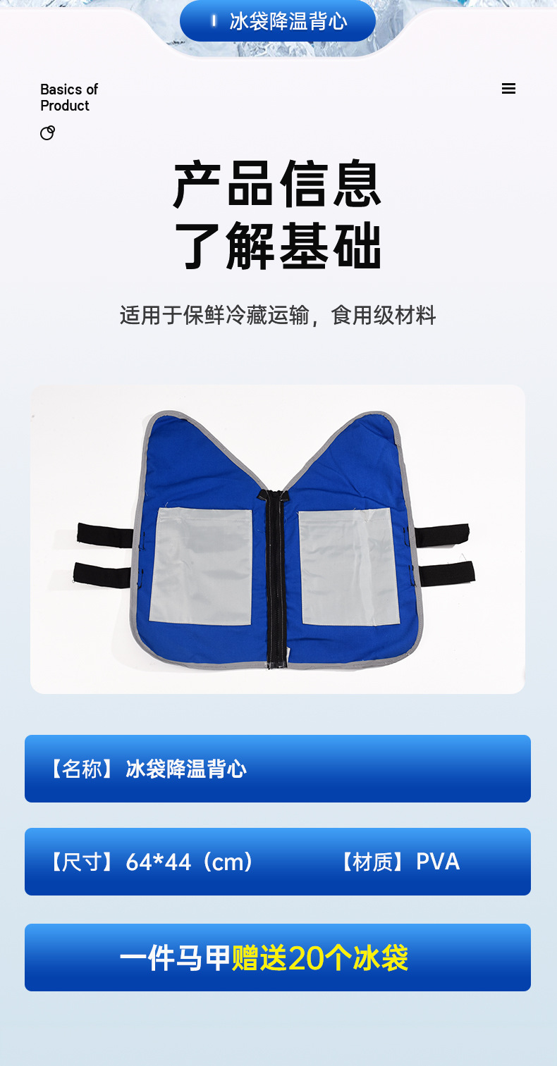 商品属性 [产品类别] 冰垫 [加工定制] 是 [卖点] 现货 批发 包邮 [卖点2] 夏季 男士 女士 隔热服 [卖点3] 定制 定做 [填充物材质] 冰晶 [是否专利货源] 否 [是否跨境出口专供货源] 否 [是否进口] 否 [箱装数量] 35 [重量] 800 [面料材质] PVA [风格] 宽松