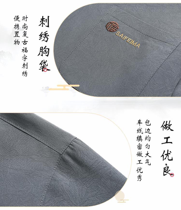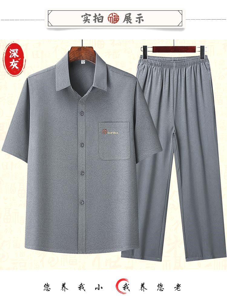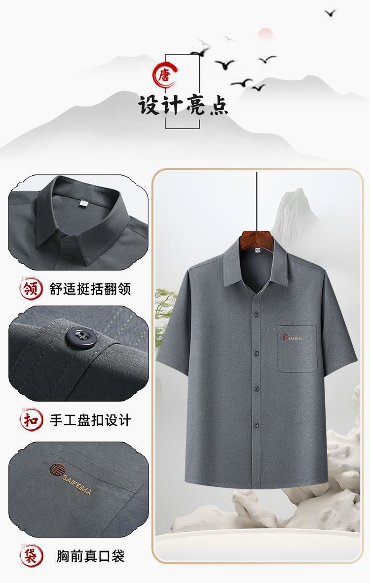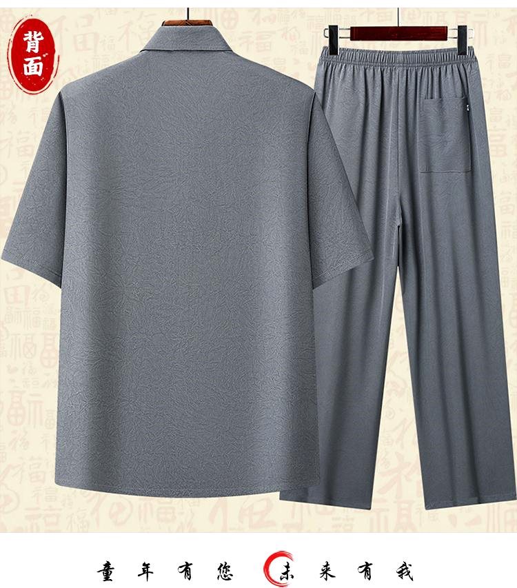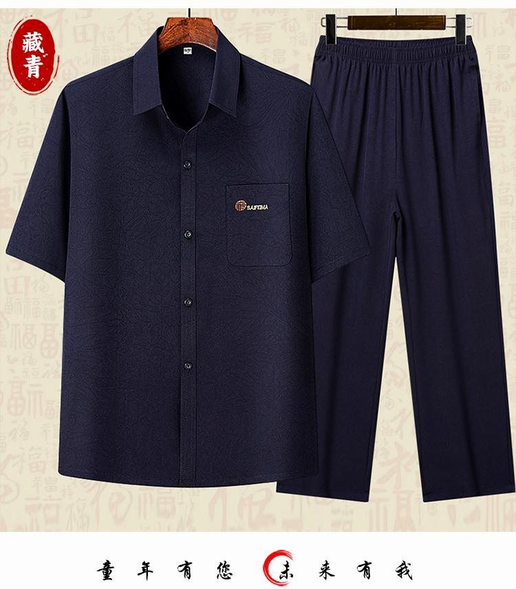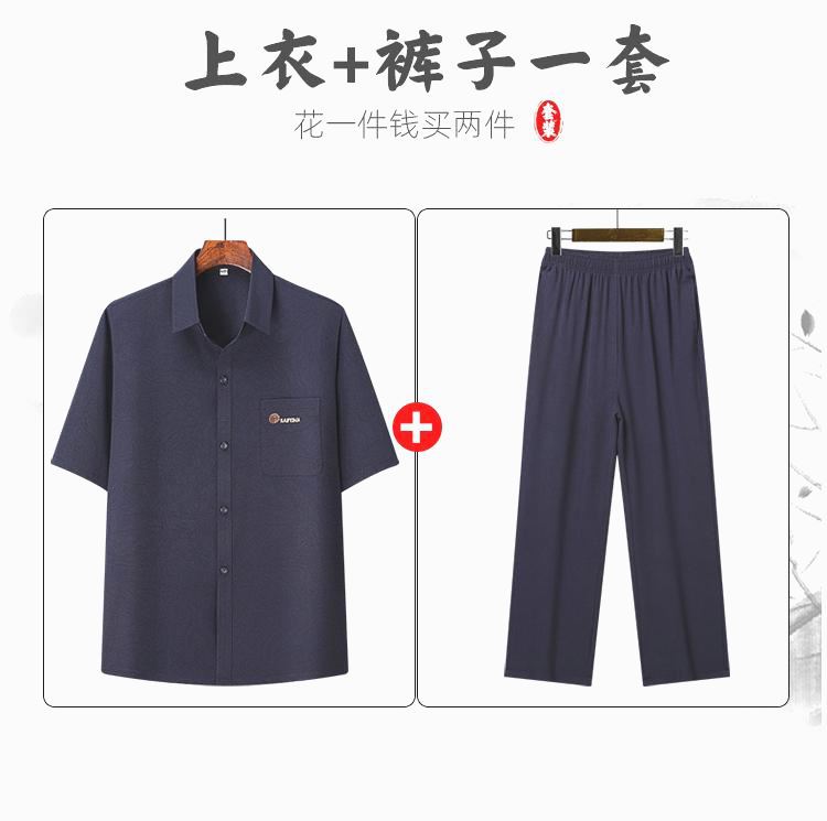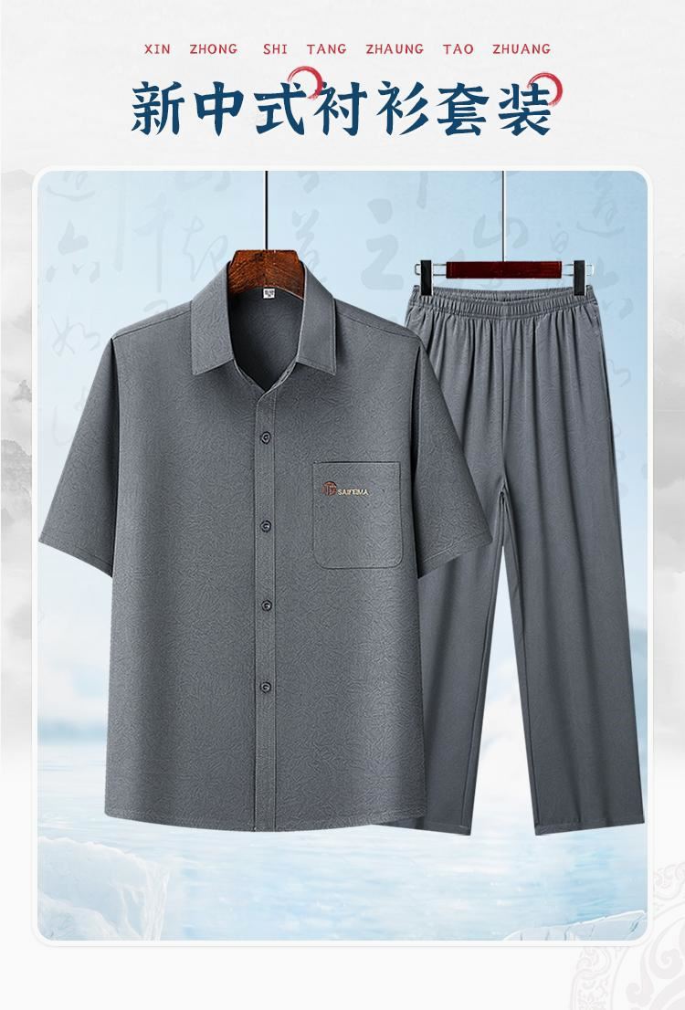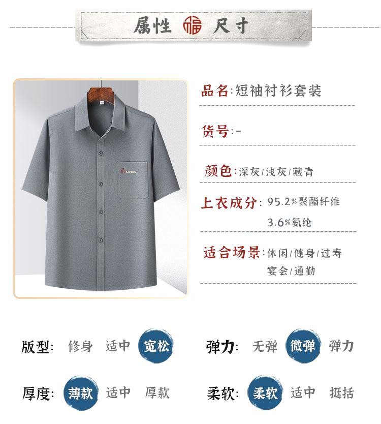商品属性 [上市年份/季节] 2024年夏季 [上衣款式] 衬衫 [上衣袖长] 短袖 [主面料成分] 聚酯纤维(涤纶) [主面料成分的含量] 84.4% [厚薄] 加绒 [原创设计货源] 否 [库存类型] 整单 [是否跨境出口专供货源] 否 [是否连帽] 不连帽 [有无质检报告] 否 [淘货类别] 商务绅士(35岁以上) [裤长] 长裤 [误差范围] 1-3cm [货源类别] 现货 [适合季节] 夏季 [适用场景] 休闲 [面料名称] 聚酯纤维 [风格] 中国风