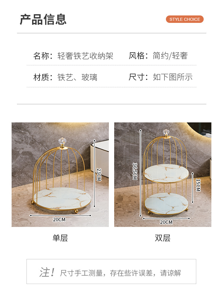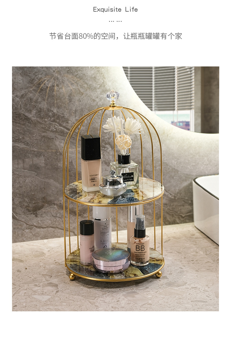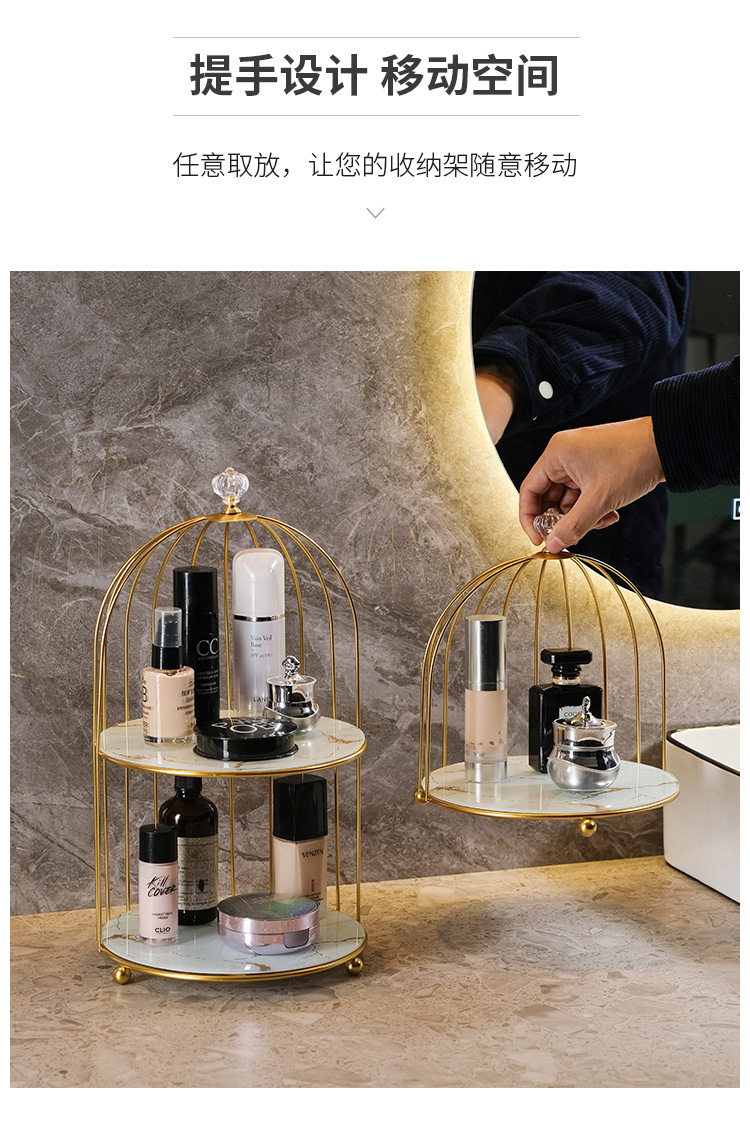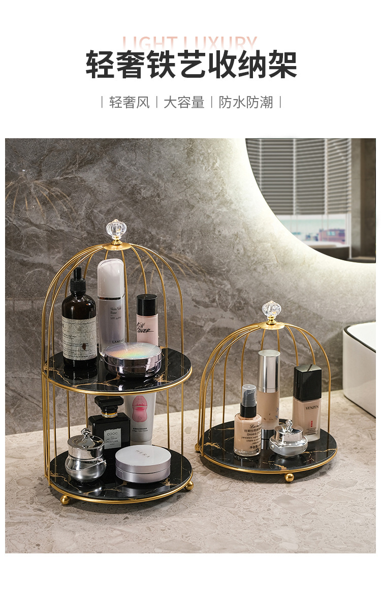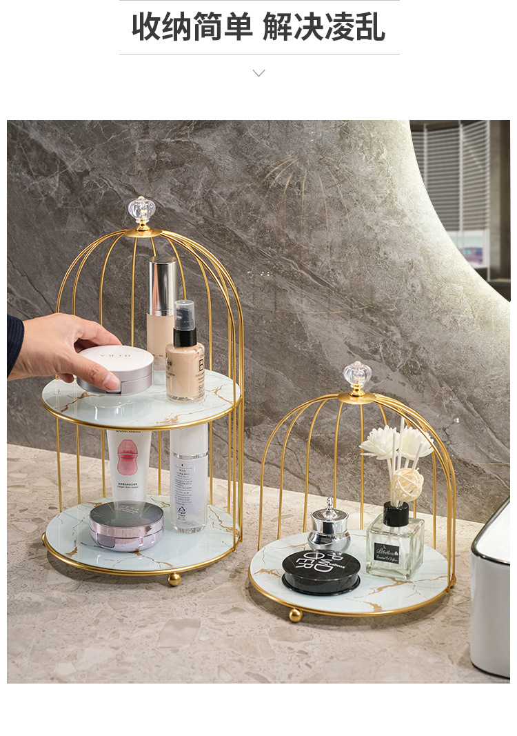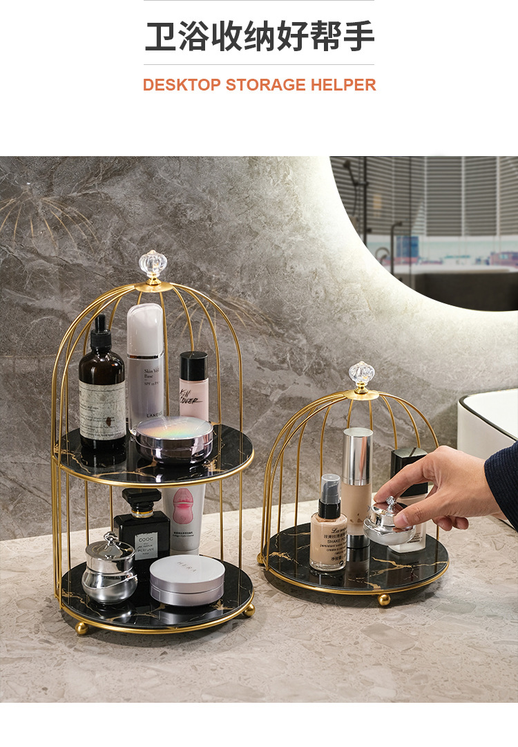 商品属性 [专利] 否 [主要下游平台] 亚马逊 [主要销售地区] 北美 [产品上市时间] 2021 [功能] 多用途,可旋转,可移动,防尘,防潮 [安装方式] 桌面式 [层数] 2层 [收纳场景] 化妆收纳,厨房收纳,桌面收纳,卧室收纳,卫浴收纳,客厅收纳 [是否跨境出口专供货源] 是 [是否进口] 否 [有可授权的自有品牌] 否 [材质] 铁艺 [款式] 鸟笼收纳架 [箱装数量] 1 [类别] 收纳架,置物架,整理架 [贸易属性] 外贸,内贸,内贸+外贸 [风格] 欧式