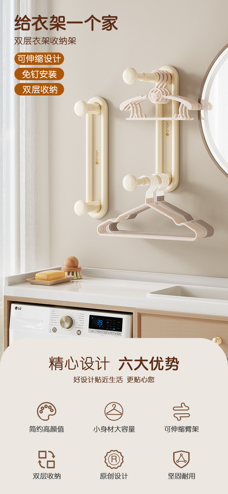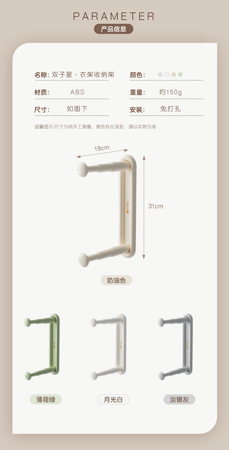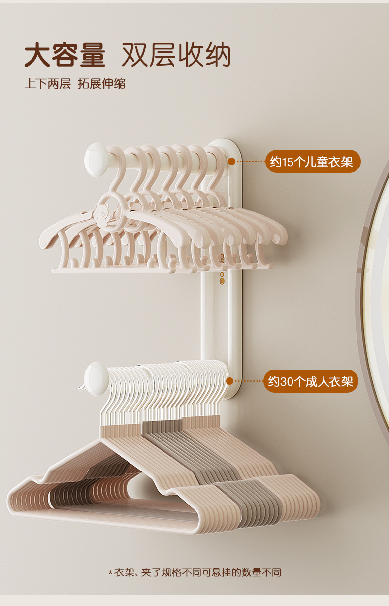 商品属性 [专利] 否 [主要下游平台] ebay,亚马逊,wish,速卖通,LAZADA [主要销售地区] 欧洲,南美,东南亚,北美,东北亚 [产品上市时间] 2023 [功能] 多用途,可伸缩,免打孔 [安装方式] 吸壁式 [层数] 2层 [收纳场景] 厨房收纳,卧室收纳,卫浴收纳,客厅收纳 [是否跨境出口专供货源] 是 [是否进口] 否 [有可授权的自有品牌] 否 [材质] ABS [款式] 可伸缩衣架收纳架 [箱装数量] 48 [贸易属性] 内贸+外贸 [风格] 现代简约