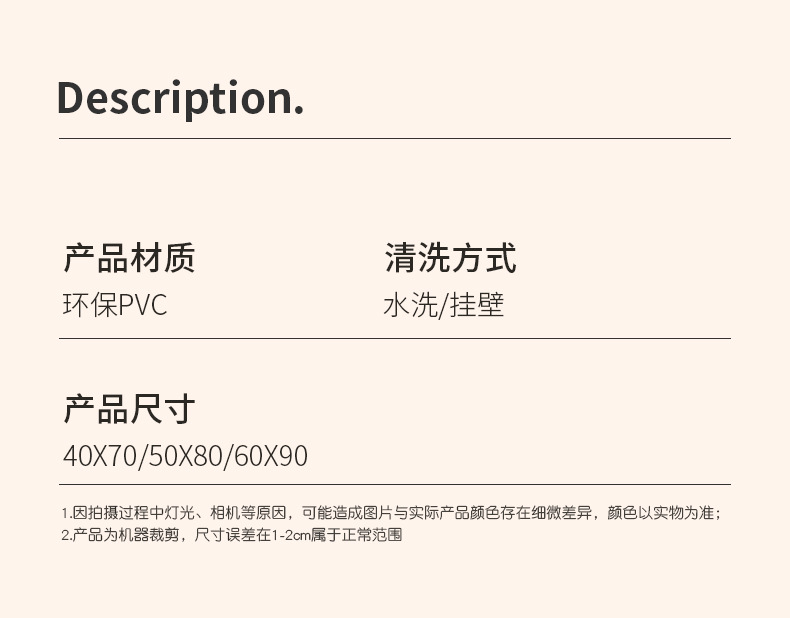 商品属性 [加工定制] 是 [图案] 几何图案,方格,卡通动漫,萌趣动物,其他 [工艺] 印花,4157396 [形状] 方形 [是否有版权或专利] 否 [材质] PVC [清洗类型] 水洗 [空间] 浴室 [风格] 31755
