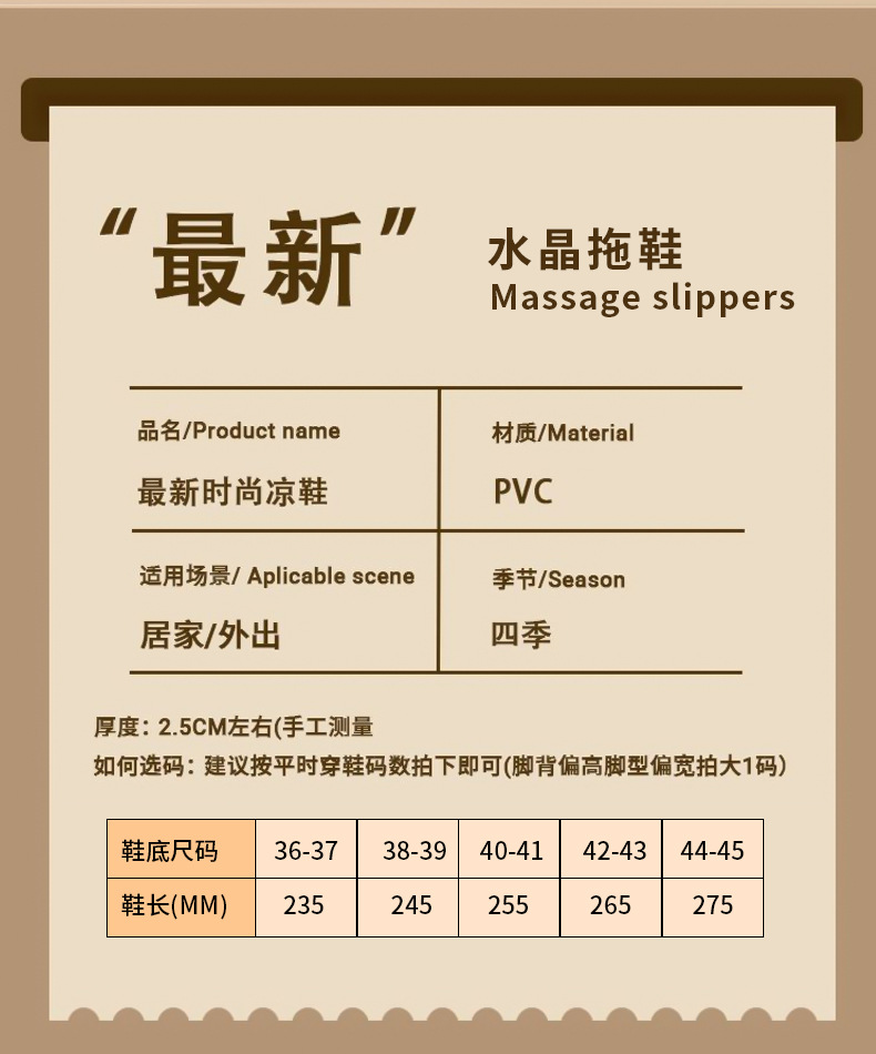 商品属性 [上市年份季节(上市时间)] 2024年秋季 [功能] 其他 [厚薄] 单 [是否包跟] 否 [是否外贸] 否 [是否带USB] 否 [是否库存] 是 [是否跨境出口专供货源] 否 [最快出货时间] 1-3天 [最晚发货时间] 4-7天 [款式] 一字拖 [流行元素] 镂空 [货源类别] 现货 [质检报告] 否 [适用人群类型] 情侣 [适用性别] 中性/男女均可 [鞋底厚度] 1.5cm(含)-3.5cm(不含) [鞋底工艺] 注塑鞋 [鞋底材质] PVC [鞋面材质] PVC [风格] 日常休闲